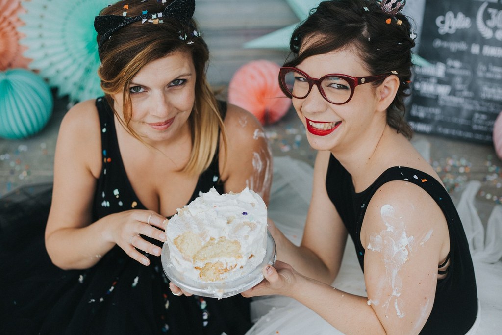 Célèbre pour nos bouts de chou, le Smash The Cake peut être aussi réalisé auprès des adultes qui ne se prennent pas au sérieux et bien entendu… aux gourmandes ! Cette idée m’a été soufflée par Anne-Laure et Marième de l’agence Enjoy Evénements qui ont réalisé un EVJF très spécial. Pour une séance comme celle-ci, il faut compter environ 400 euros entre la séance photo avec le photographe, l’achat du gâteau et des décorations. À diviser entre les participantes bien entendu !!