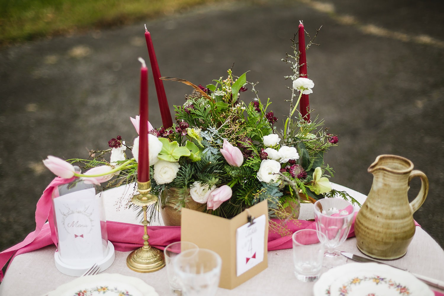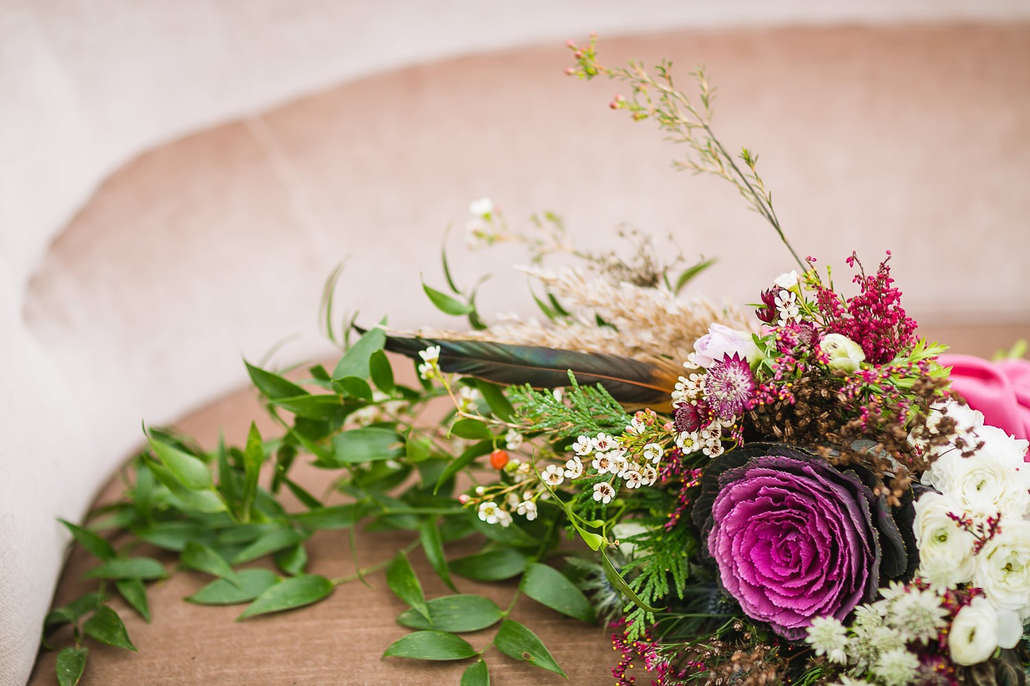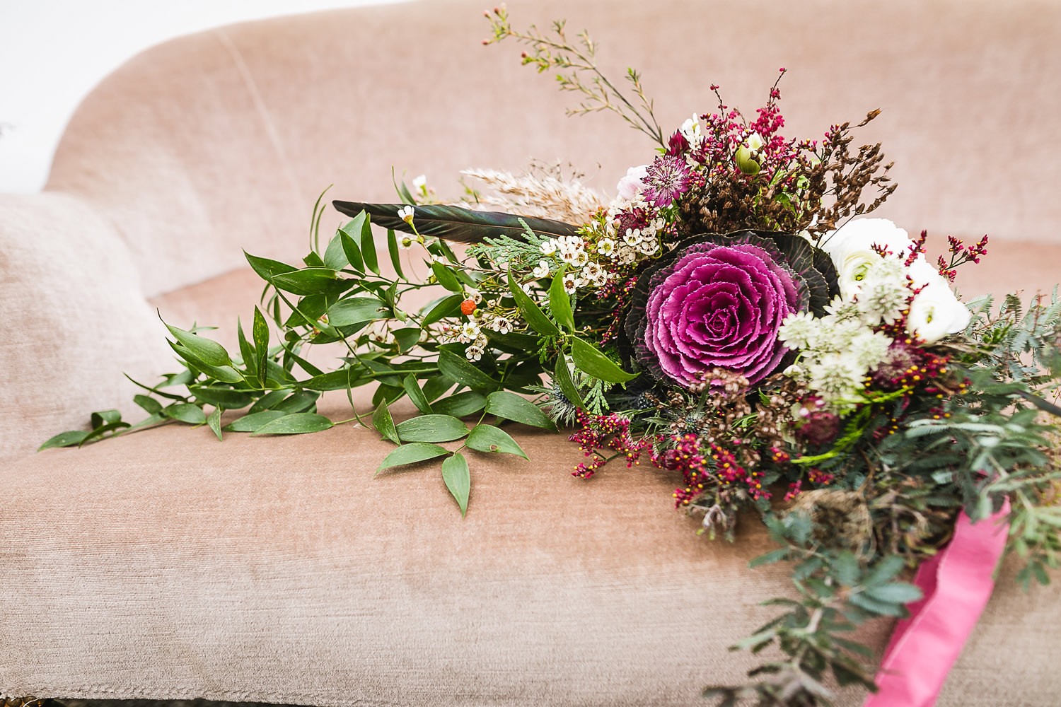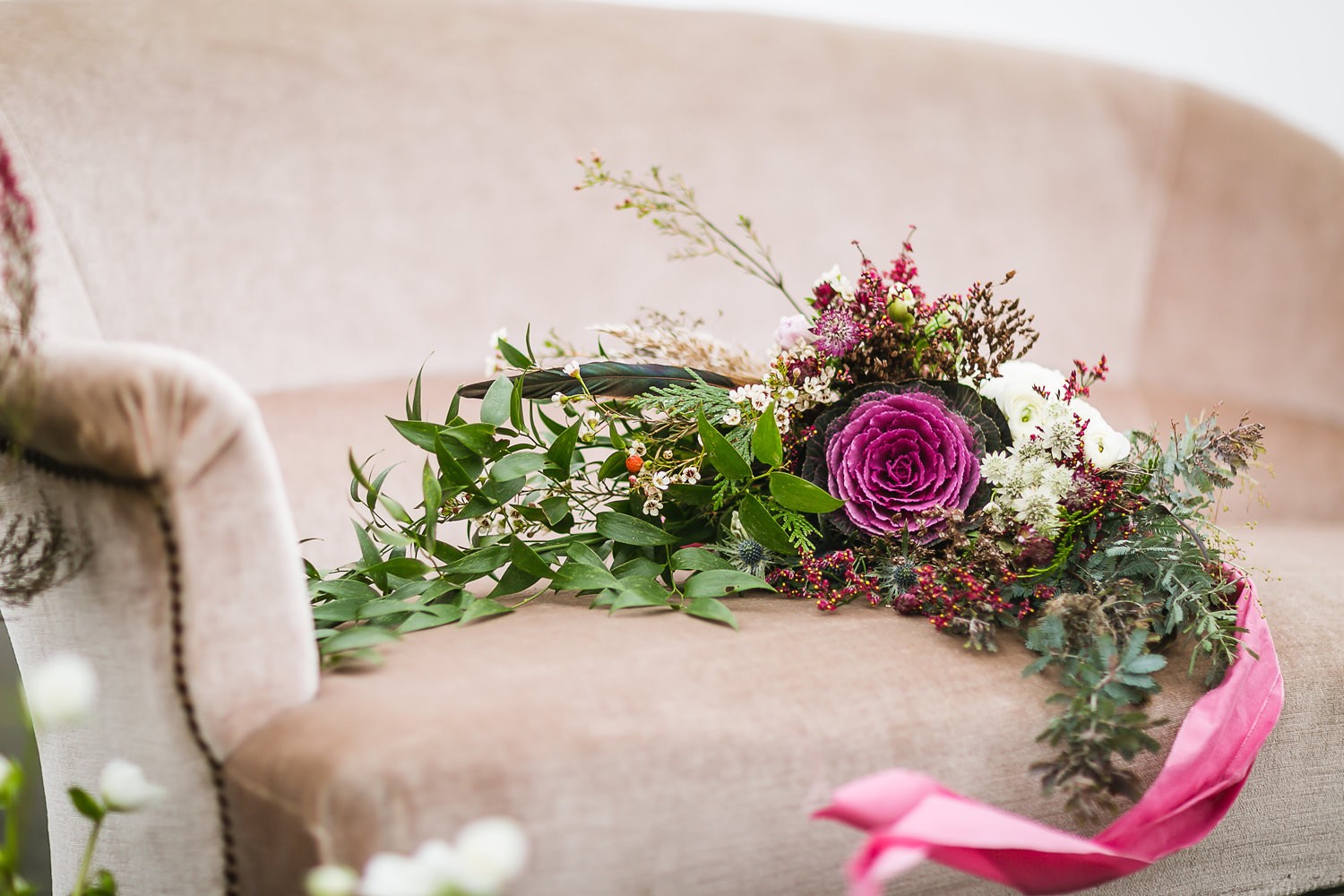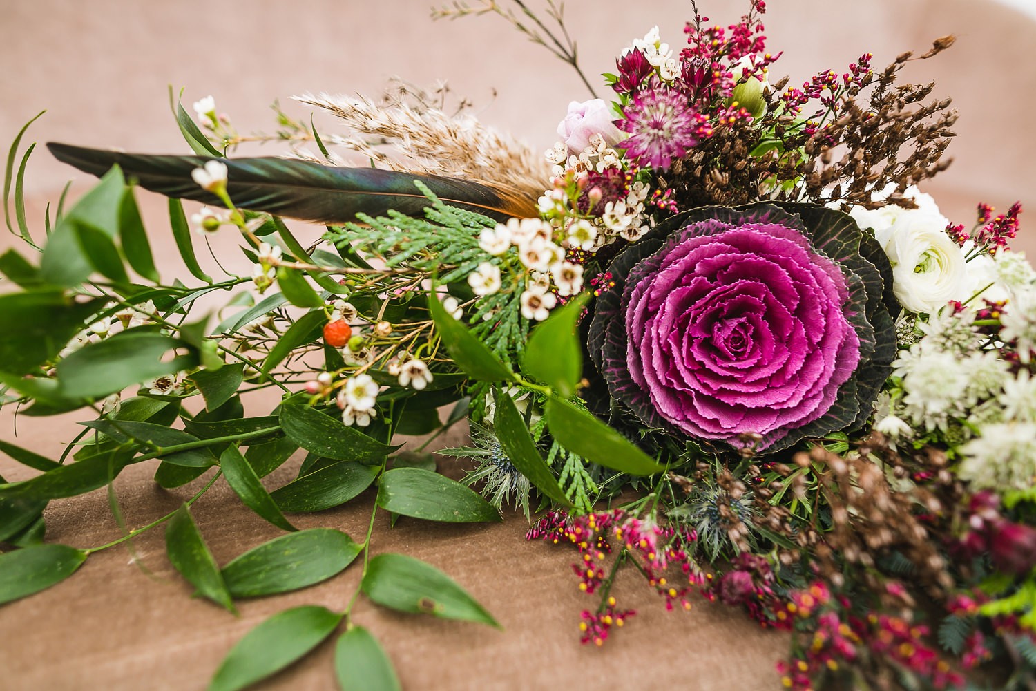 Qui dit mariage en hiver, dit aussi choix restreint pour les fleurs fraîches. Flavia a donc opté pour des fleurs et des végétaux de saison dont…le chou ! Et oui, le grand végétal rose que vous pouvez voir au centre du bouquet de la mariée est un chou qui apporte beaucoup de couleurs à la création et ne gâche en rien le pouvoir des fleurs… bien au contraire !