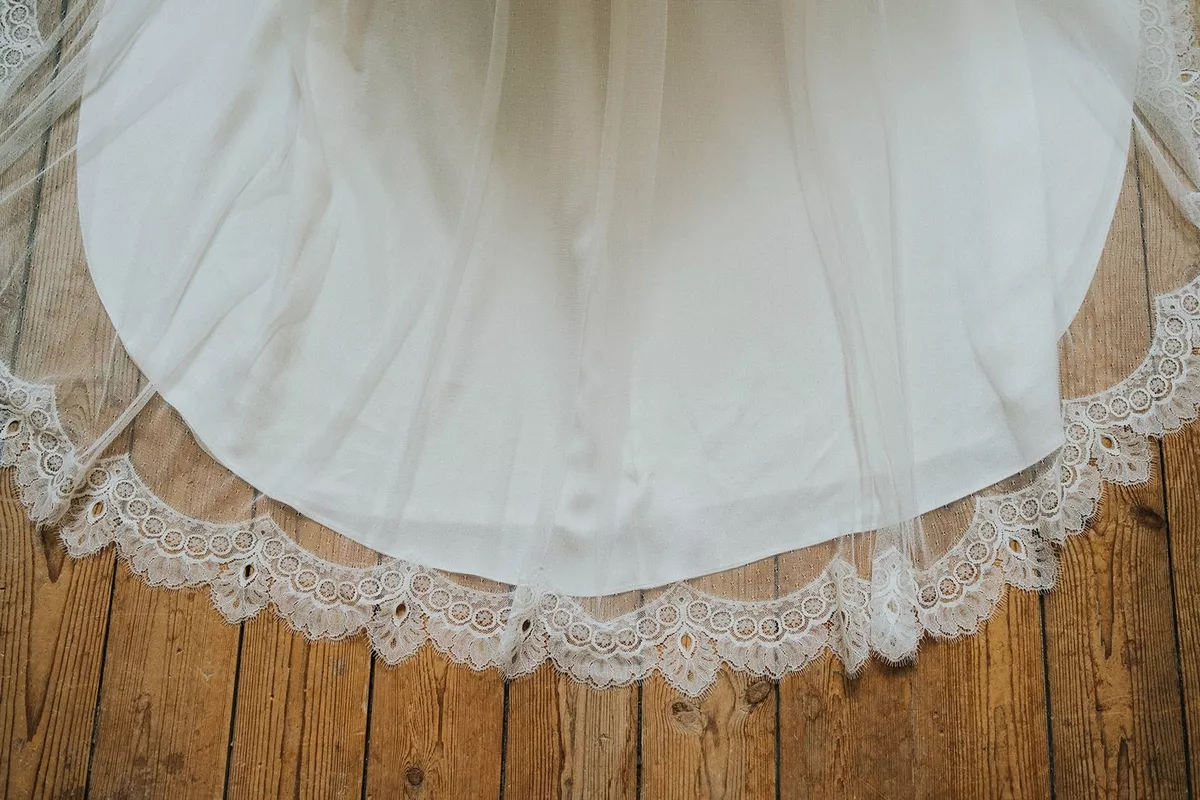 2. La beauté des matières et le choix du made in France : Dentelle de Calais, soie, crêpe et tulle de Lyon. Chaque tissu est choisi pour sa noblesse et son origine française. Même les finitions, comme les boutons, sont façonnées localement. Ce parti pris traduit un profond respect du savoir-faire français et une volonté de préserver un artisanat d’excellence.