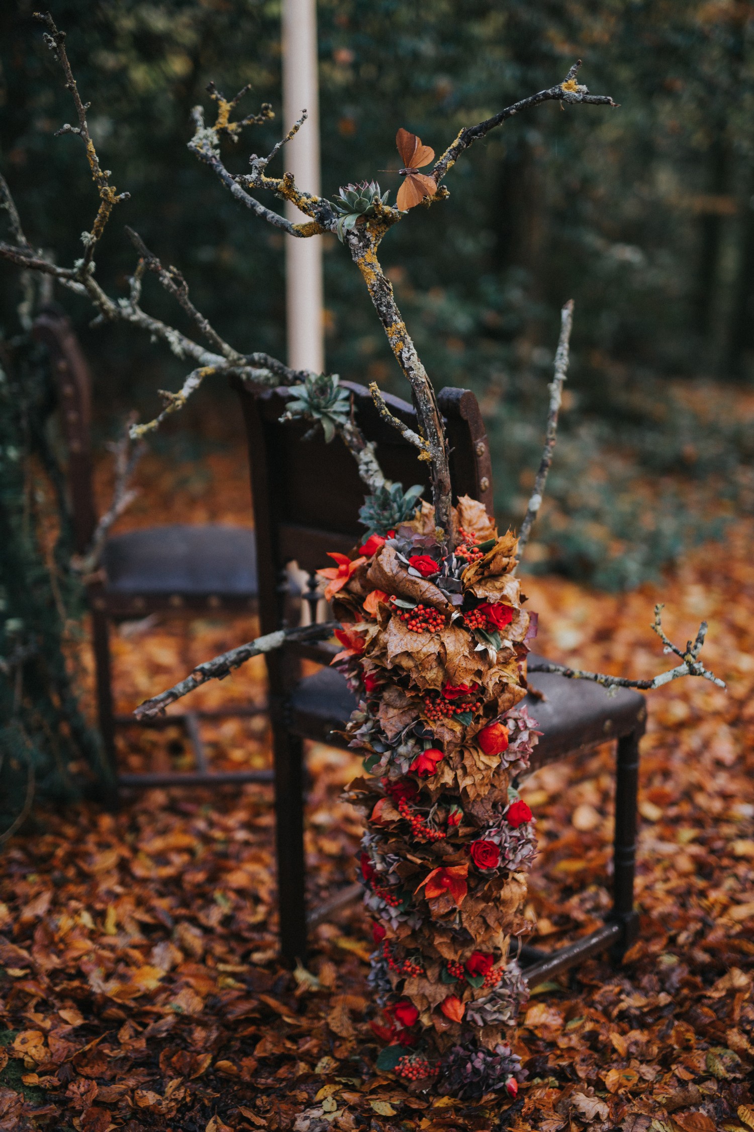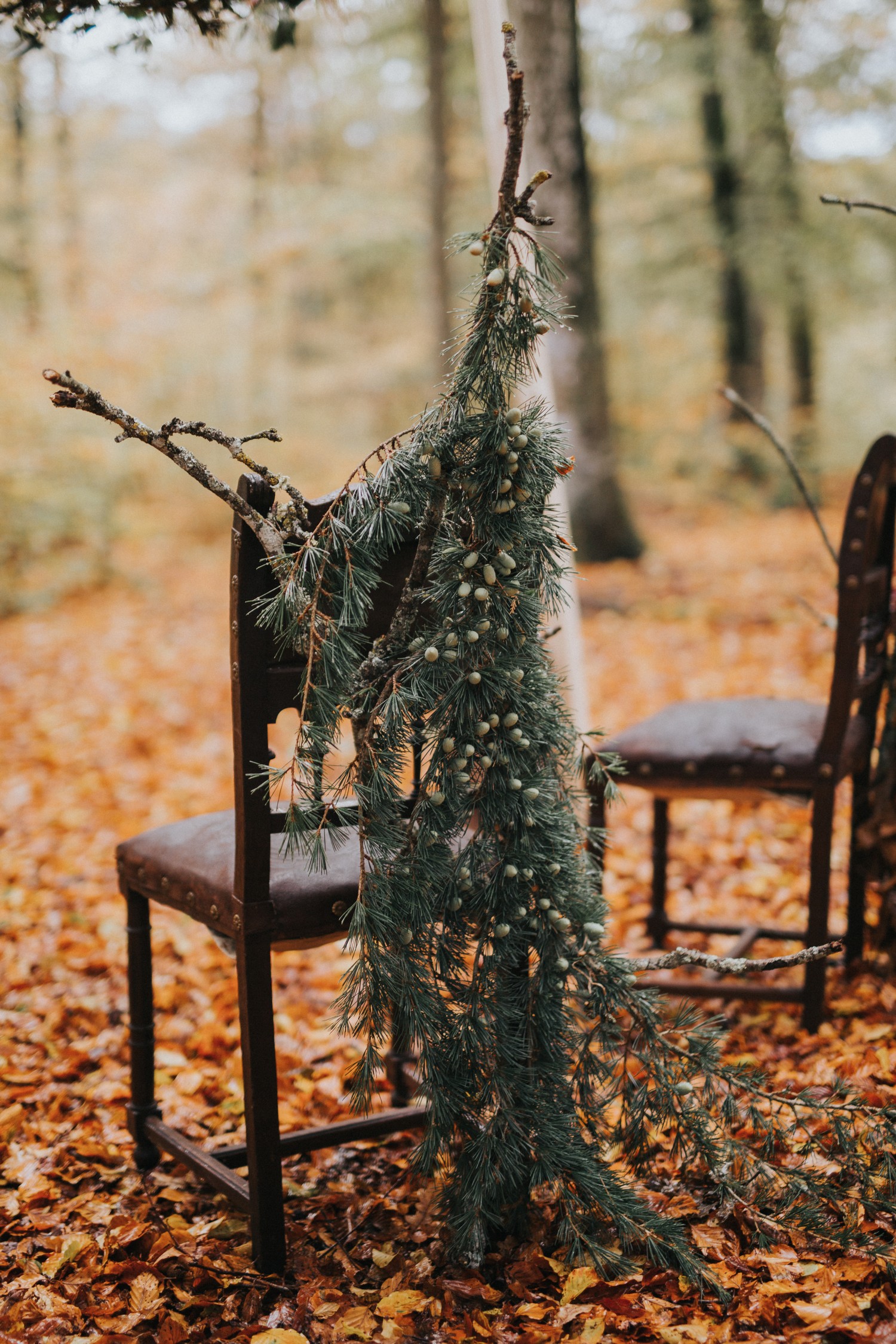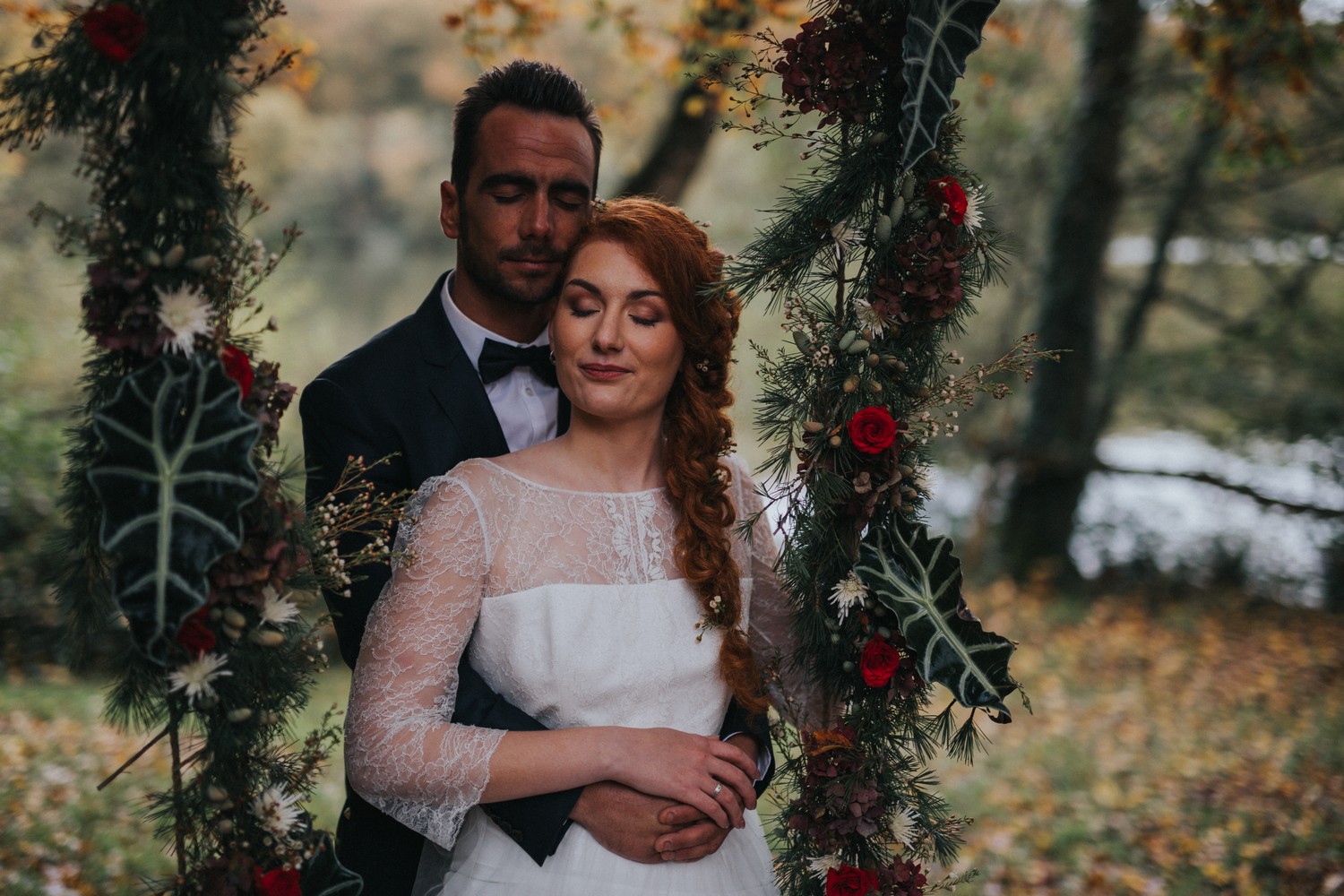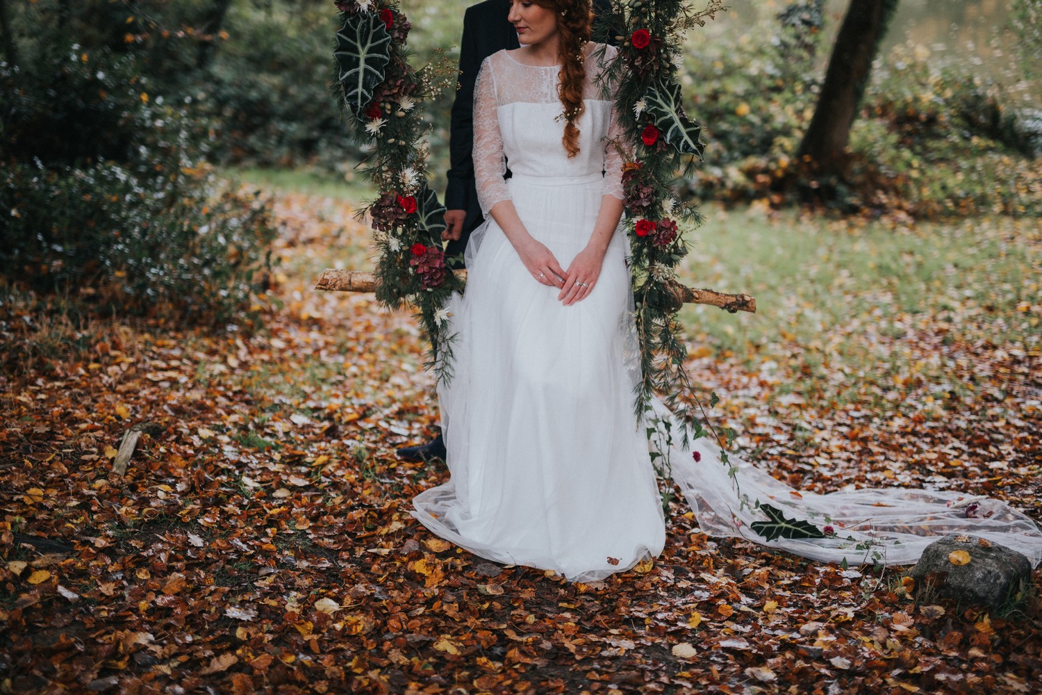 J’adore la traîne de fleurs de la mariée avec ce doux mélange de lierre et de houx. Mais aussi le lâcher de feuilles mortes à la place des confettis (je vous en parlais déjà dans mon article dédié aux 5 inspirations pour un mariage automnal). Le must ? Cette balançoire si romantique ! C’est l’idée à prendre de ce shooting ! Que ce soit pour votre cérémonie laïque ou pour le photobooth de votre mariage, cette balançoire est un atour charme incontestable !