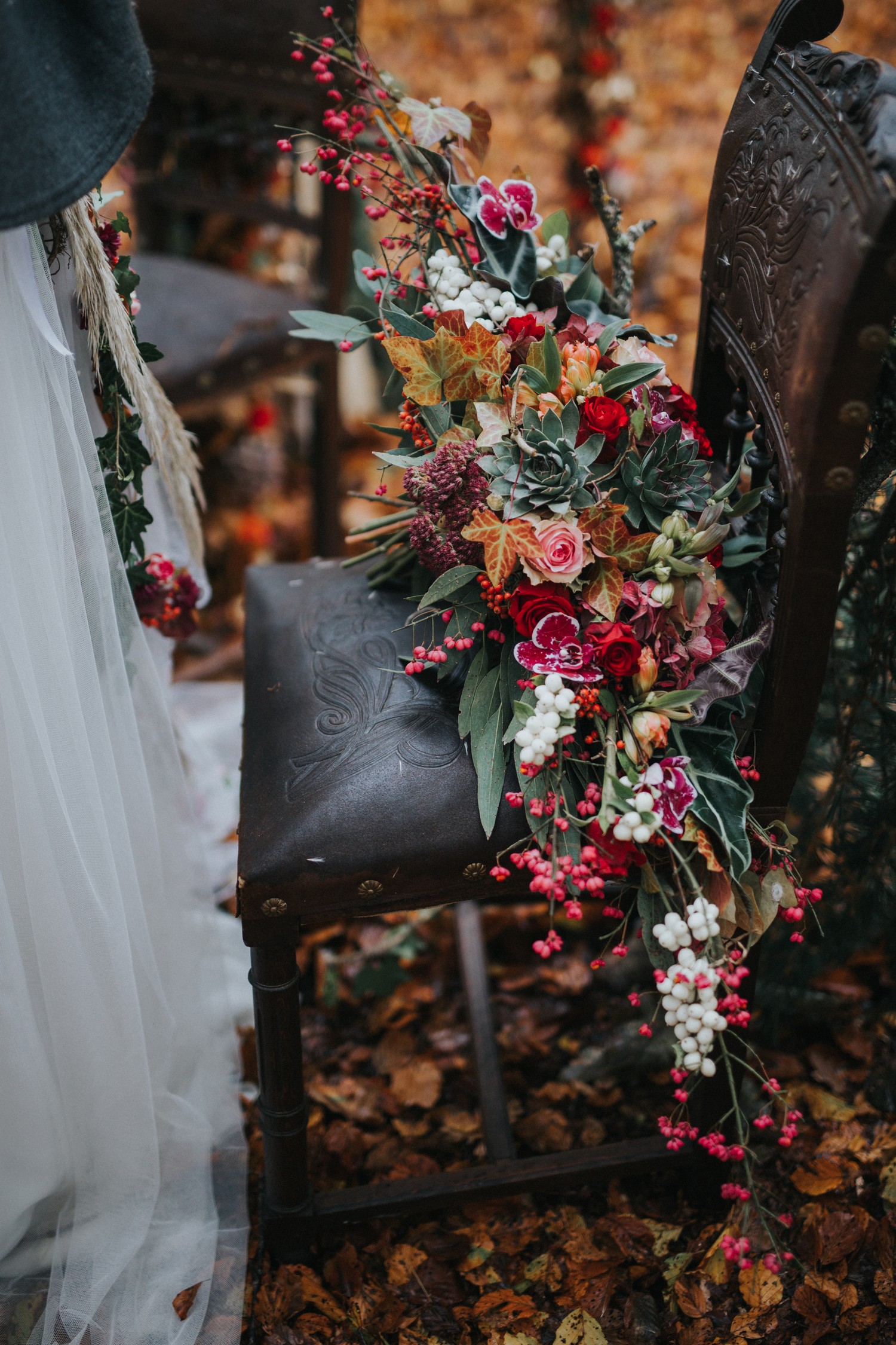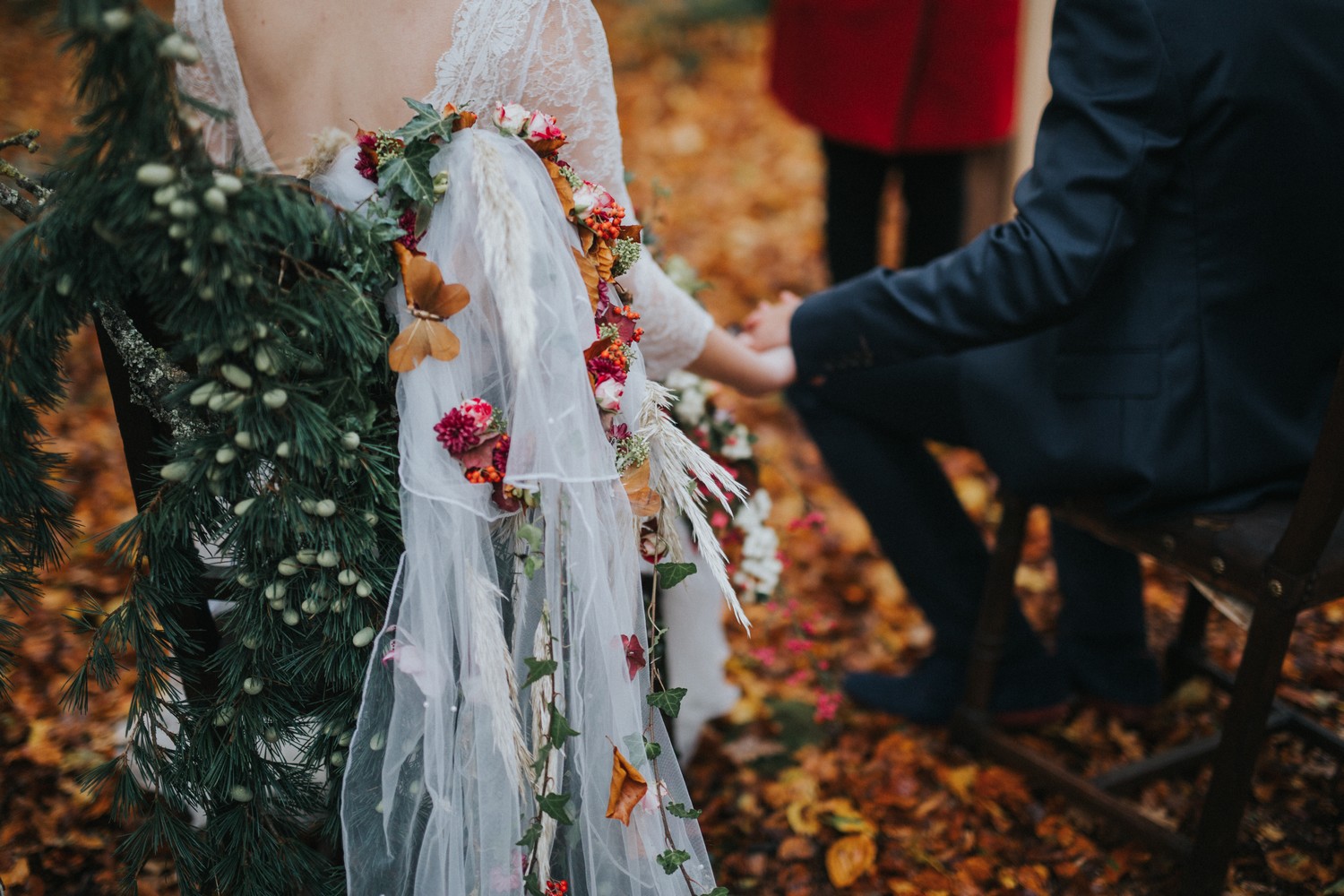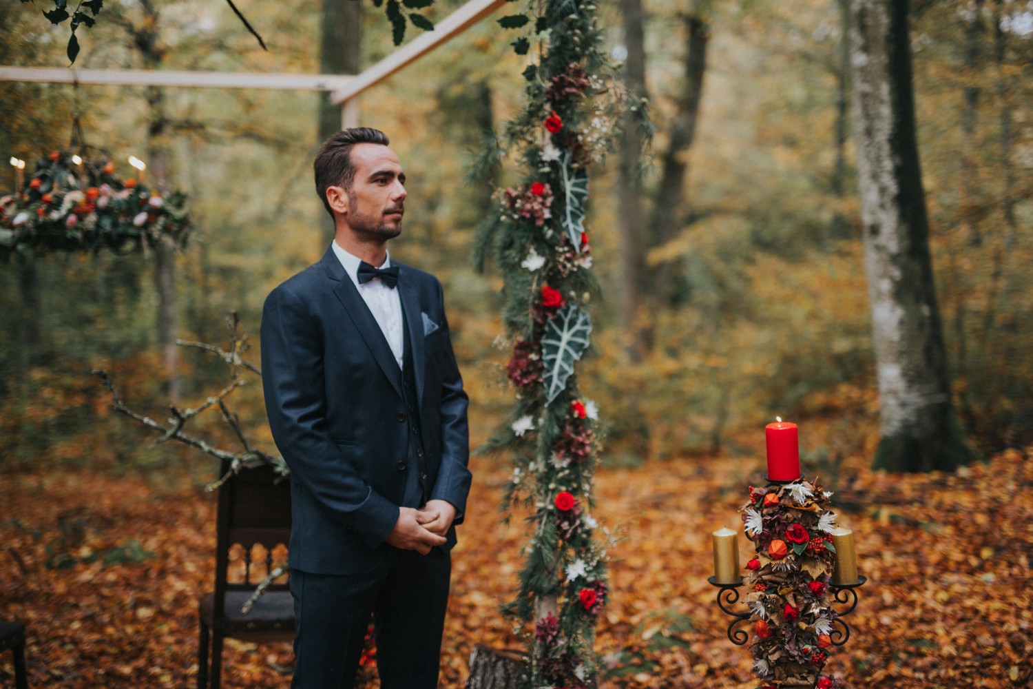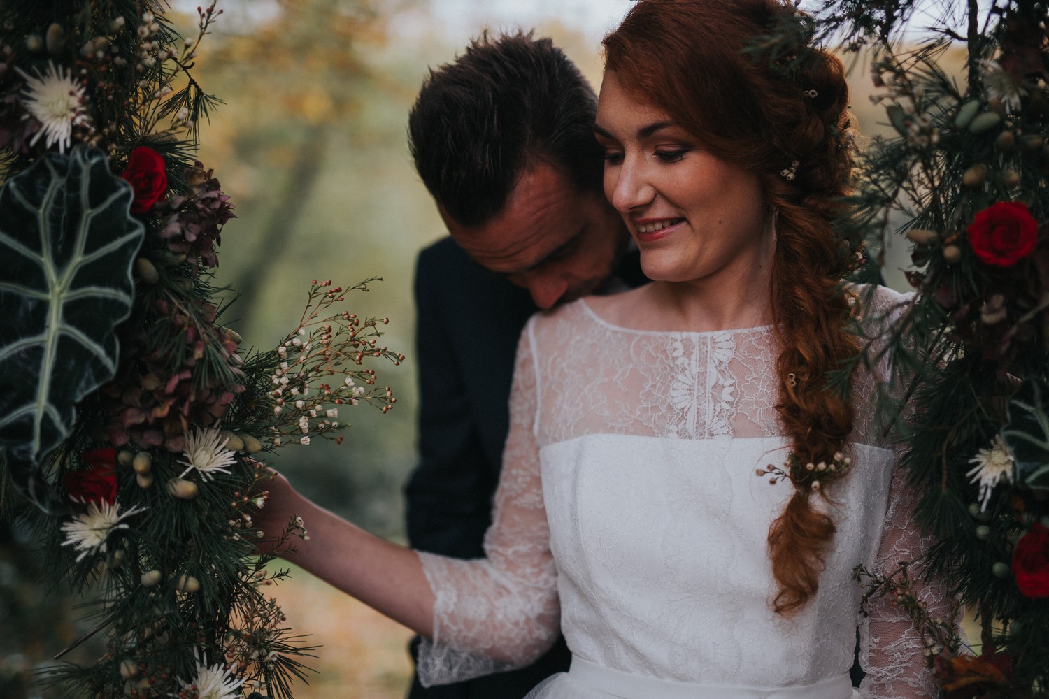 J’adore la traîne de fleurs de la mariée avec ce doux mélange de lierre et de houx. Mais aussi le lâcher de feuilles mortes à la place des confettis (je vous en parlais déjà dans mon article dédié aux 5 inspirations pour un mariage automnal). Le must ? Cette balançoire si romantique ! C’est l’idée à prendre de ce shooting ! Que ce soit pour votre cérémonie laïque ou pour le photobooth de votre mariage, cette balançoire est un atour charme incontestable !