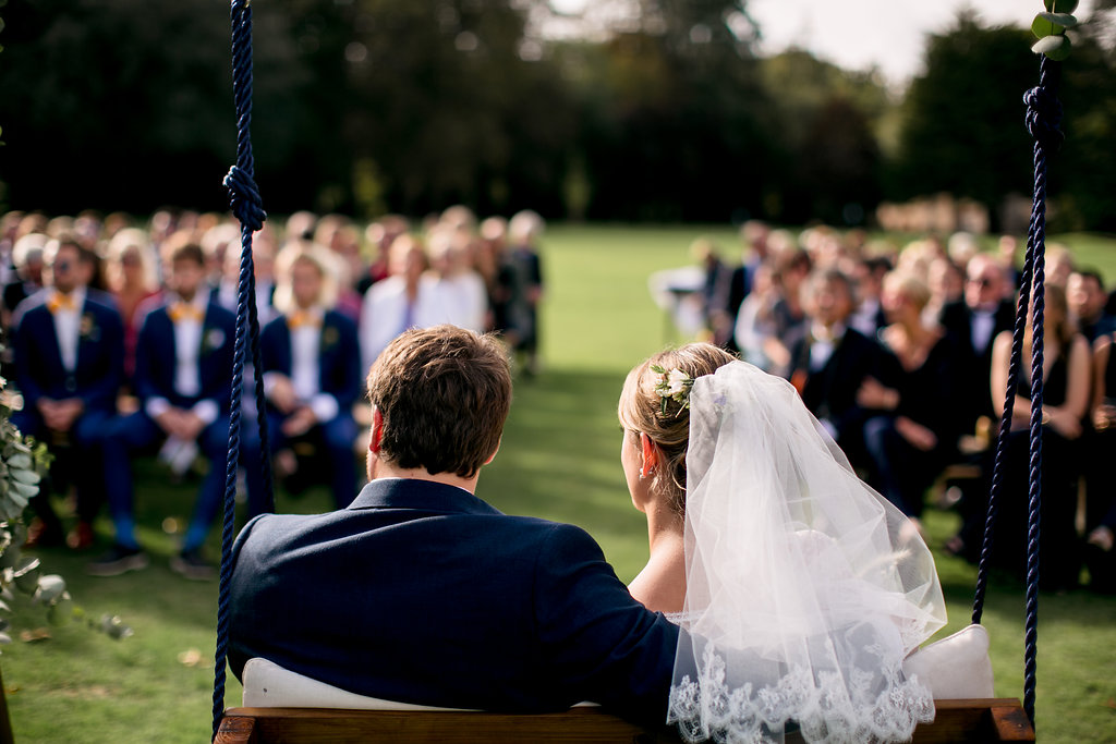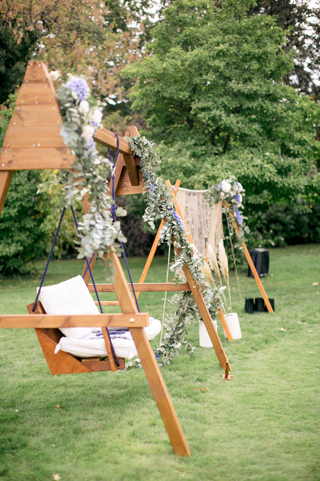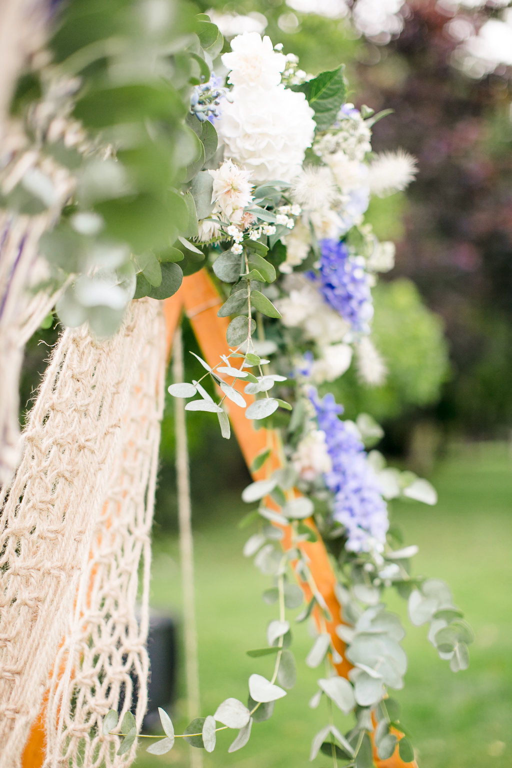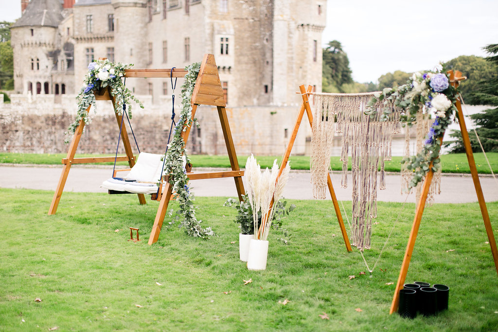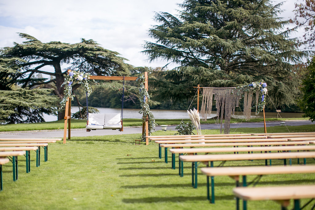 Pour l’idée de l’arche de cérémonie, j’avais déjà vu de jolies images de balançoire accrochée à une branche lors de cérémonie de mariage (sur Pinterest et sur un mariage photographié par Lauren, notre photographe). Nous souhaitions être assis côte à côte et pas sur deux sièges séparés lors de la cérémonie laïque. La balancelle a été une évidence avec Max et le fait de pouvoir la créer (et donc la rendre unique) et qu’elle puisse rejoindre ensuite notre jardin afin que nos « futurs » enfants se balancent dessus était fort en symbole. Les fleurs d’Anouk l’ont embellie le jour J. Nous n’aurions pas pu rêver mieux pour notre arche ! Max a fait le montage et nous l’avons tous les deux vernis. J’adore m’y balancer encore maintenant ! Pour l’anecdote, nous avons dû louer un camion de déménagement pour emmener tout pour le jour J (encore des frais de mariage !)