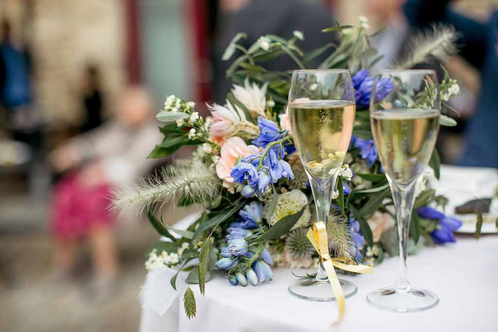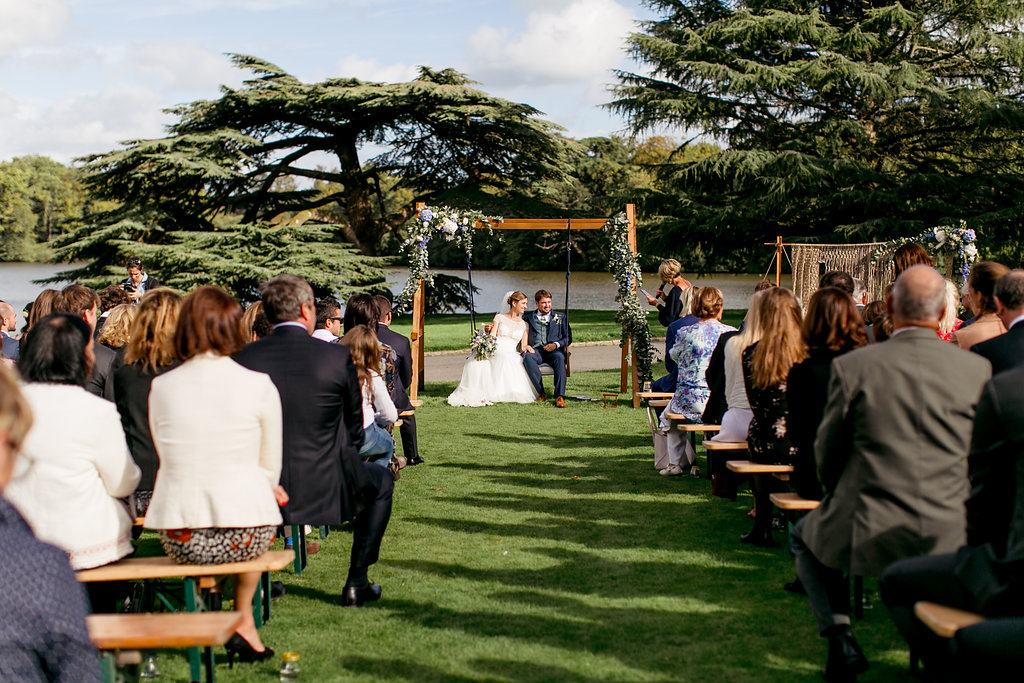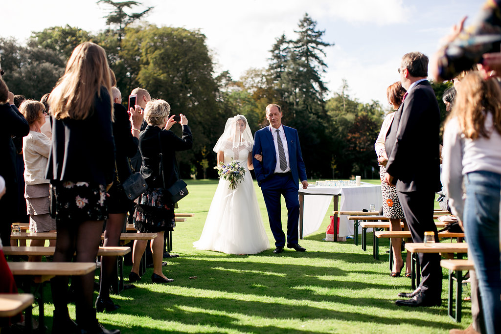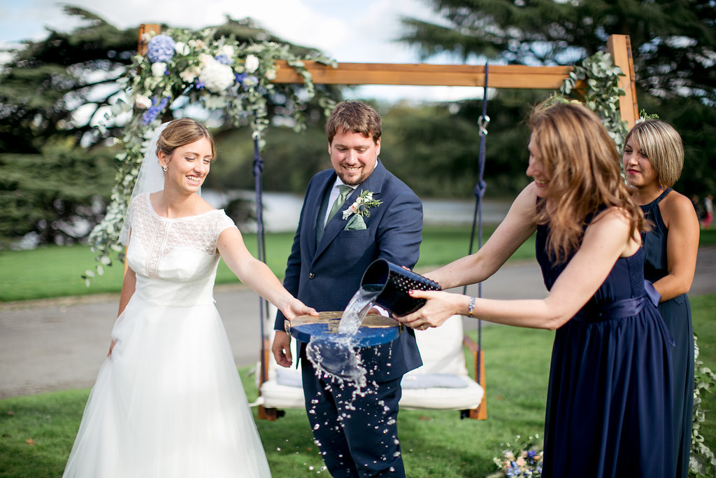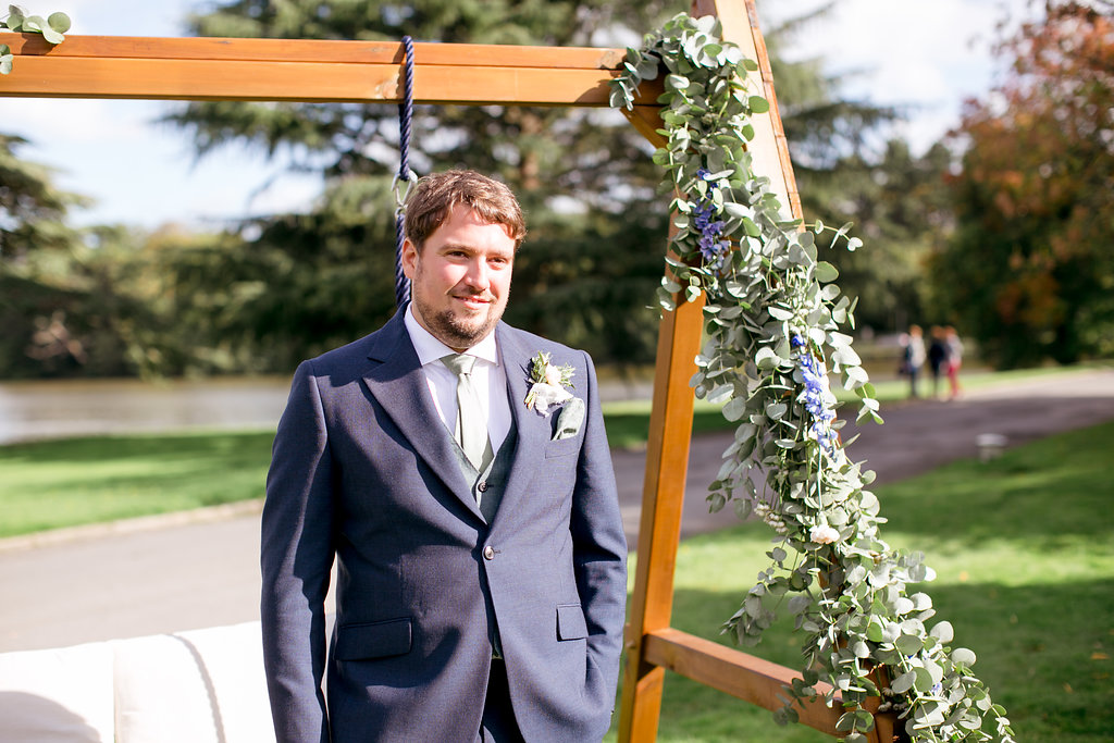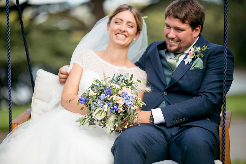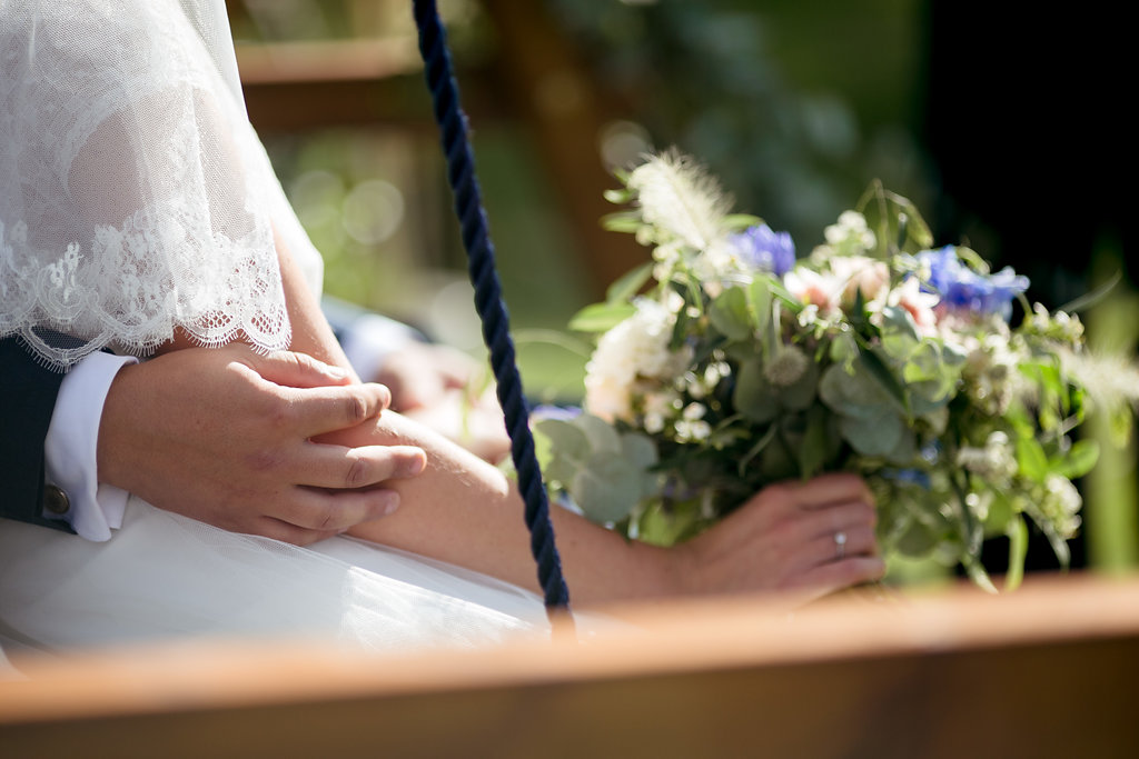 Pour l’idée de l’arche de cérémonie, j’avais déjà vu de jolies images de balançoire accrochée à une branche lors de cérémonie de mariage (sur Pinterest et sur un mariage photographié par Lauren, notre photographe). Nous souhaitions être assis côte à côte et pas sur deux sièges séparés lors de la cérémonie laïque. La balancelle a été une évidence avec Max et le fait de pouvoir la créer (et donc la rendre unique) et qu’elle puisse rejoindre ensuite notre jardin afin que nos « futurs » enfants se balancent dessus était fort en symbole. Les fleurs d’Anouk l’ont embellie le jour J. Nous n’aurions pas pu rêver mieux pour notre arche ! Max a fait le montage et nous l’avons tous les deux vernis. J’adore m’y balancer encore maintenant ! Pour l’anecdote, nous avons dû louer un camion de déménagement pour emmener tout pour le jour J (encore des frais de mariage !)