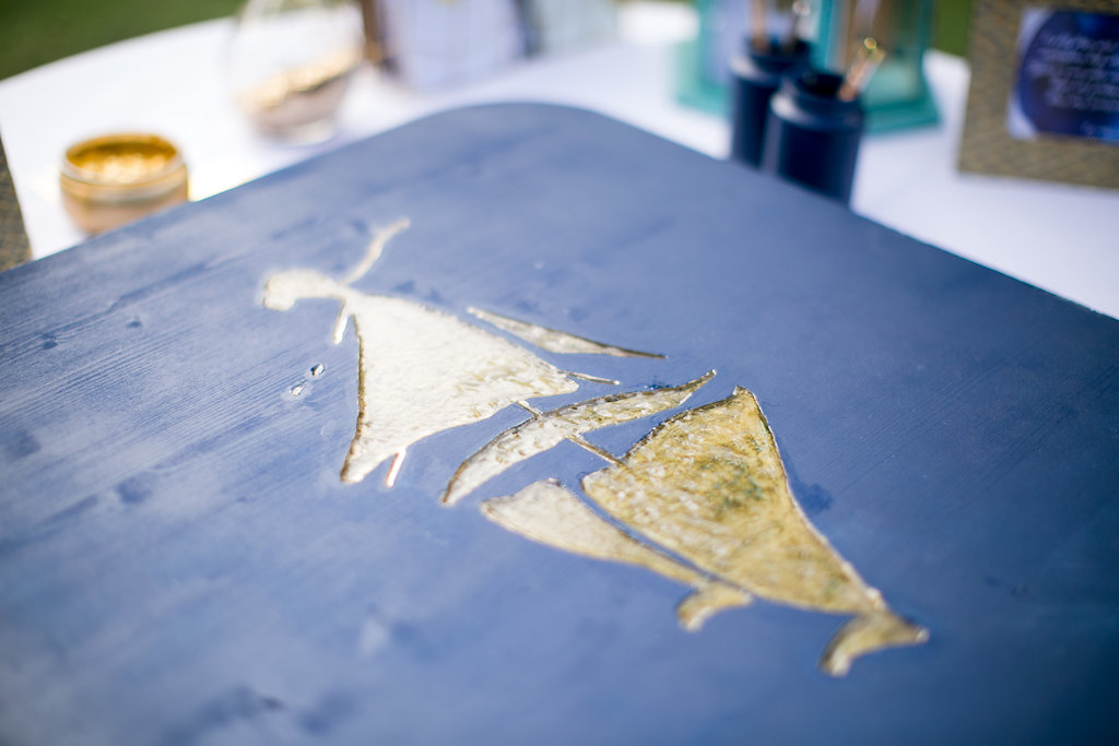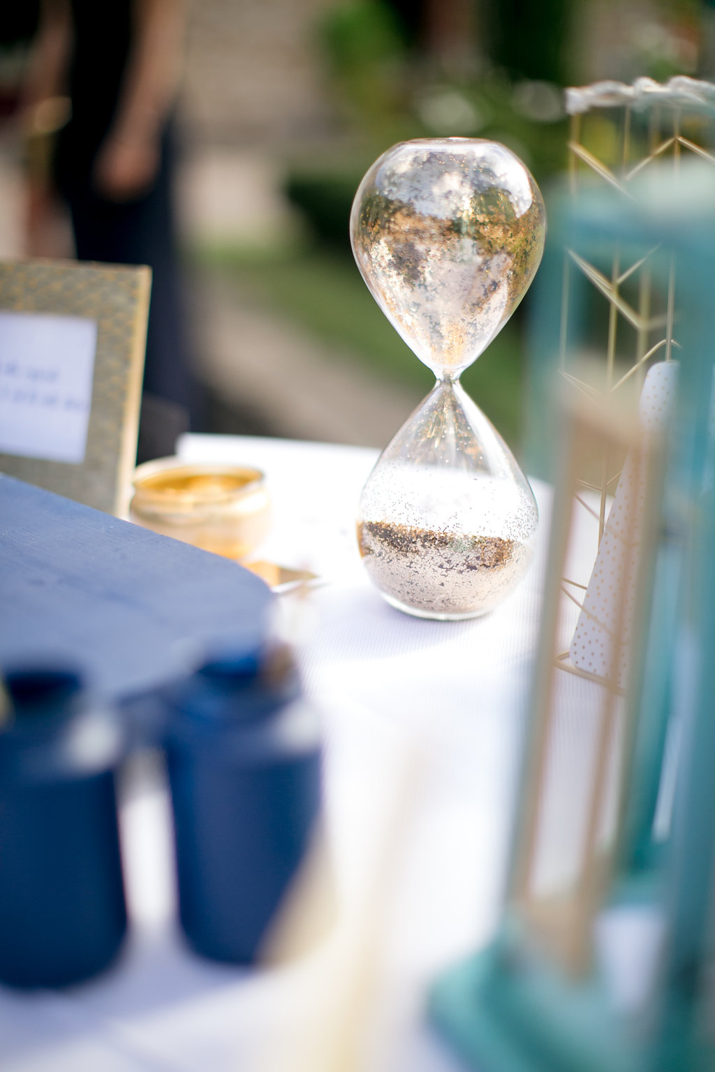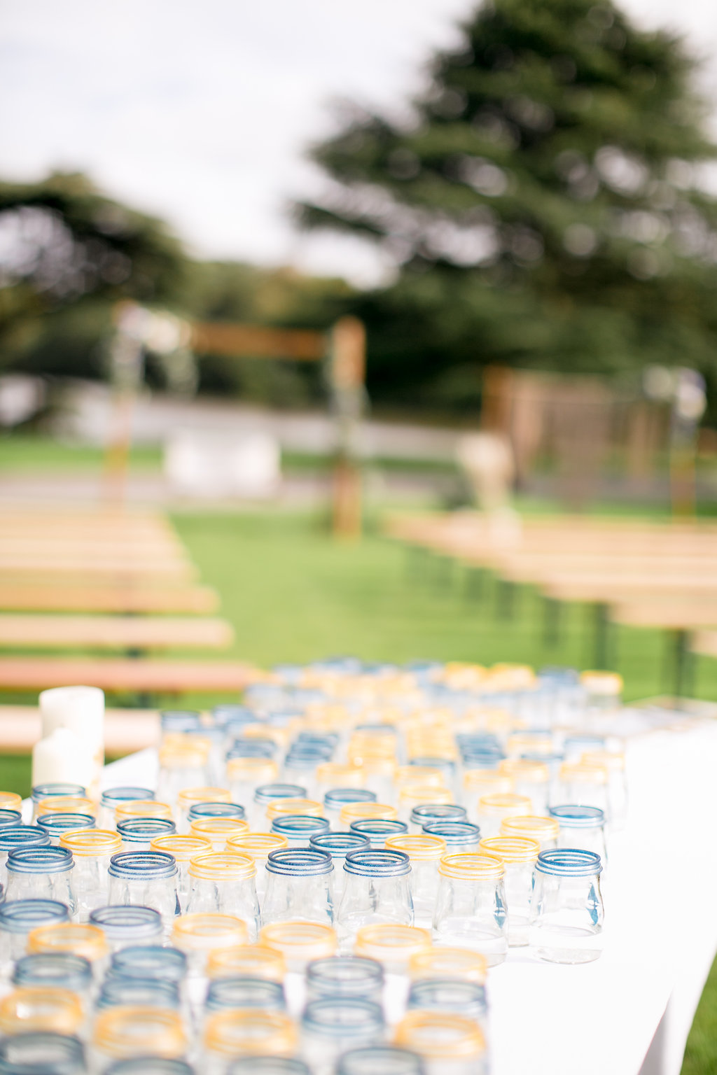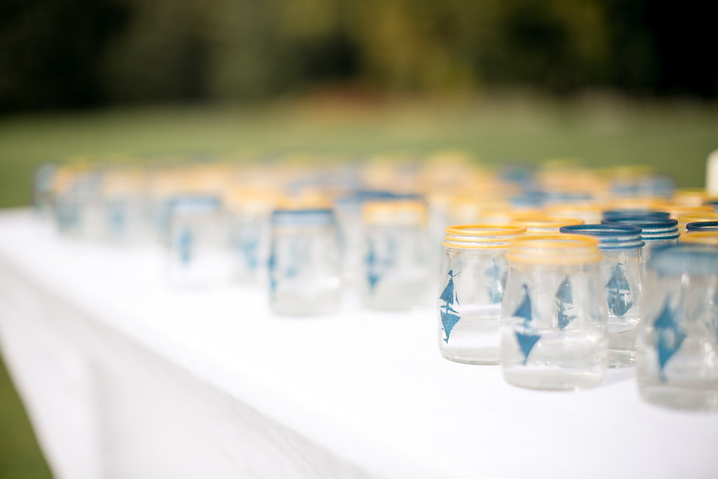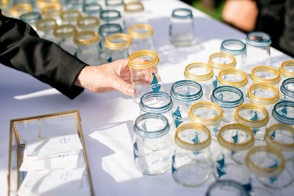Anouk nous a proposé deux trames dont une avec « l’eau » comme élément central puisque nous vivons au bord de la mer et que Max aime la voile. L’eau est symbole de vie, de cycle … L’idée prenait tout son sens et permettait de faire fusionner tous les consentements de l’entourage et n’être plus qu’un cocon unique. Nous avons donc proposé à nos familles et amis de venir avec un peu d’eau d’un endroit qui avait une symbolique. Nous avions également été chercher de l’eau de mer à côté de la maison pour ceux qui n’avaient pas d’eau symbolique. Et j’ai commandé plein de pots de yaourts vides au papa d’une amie afin de les décorer avec notre dessin de mariage pour servir de contenant lors de la cérémonie.