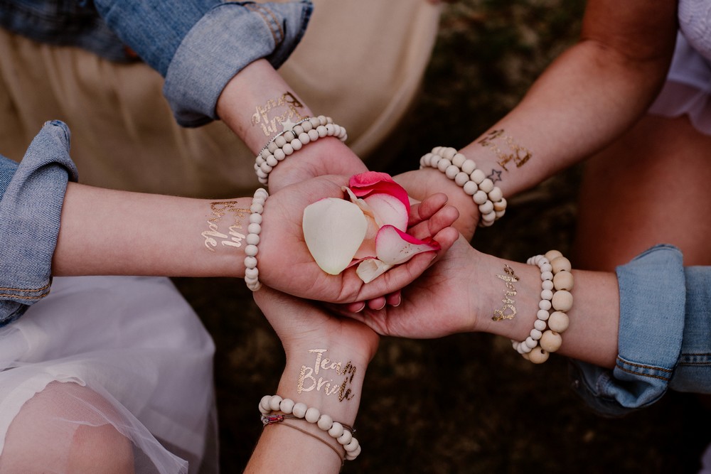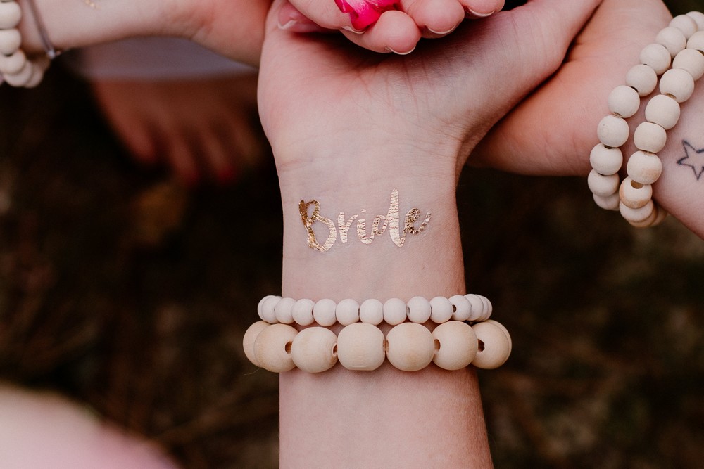 Qui n’a jamais rêvé de franchir le pas ? Trêves de plaisanteries, il s’agit bien évidemment de tatouages éphémères ! Dorés, blancs, argentés, vous pouvez opter pour toutes les originalités. Ici, la « Team Bride » est à l’honneur avec des tatouages dorés collés sur chaque poignet des participantes.