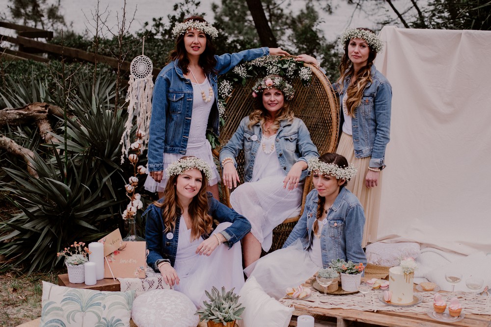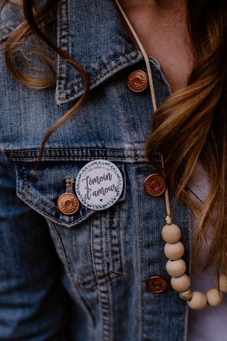 Les vêtements sont une passion féminine que l’on partage souvent entre copines ! Alors pour le fun de la journée et pour faire des photos super sympas, rien ne vaut que l’adoption d’un dress code ! Ici, le thème était « jean et blanc ». La journée a commencé en t-shirt blanc, pantalon et veste en jean avant de finir en petite robe blanche (avec la veste en jean évidement) ! Pour différencier la future mariée du groupe, cette dernière peut porter un t-shirt personnalisé ! Pour les témoins et copines, des petits badges ont été confectionnés (et pourront même être reportés le jour du mariage !).