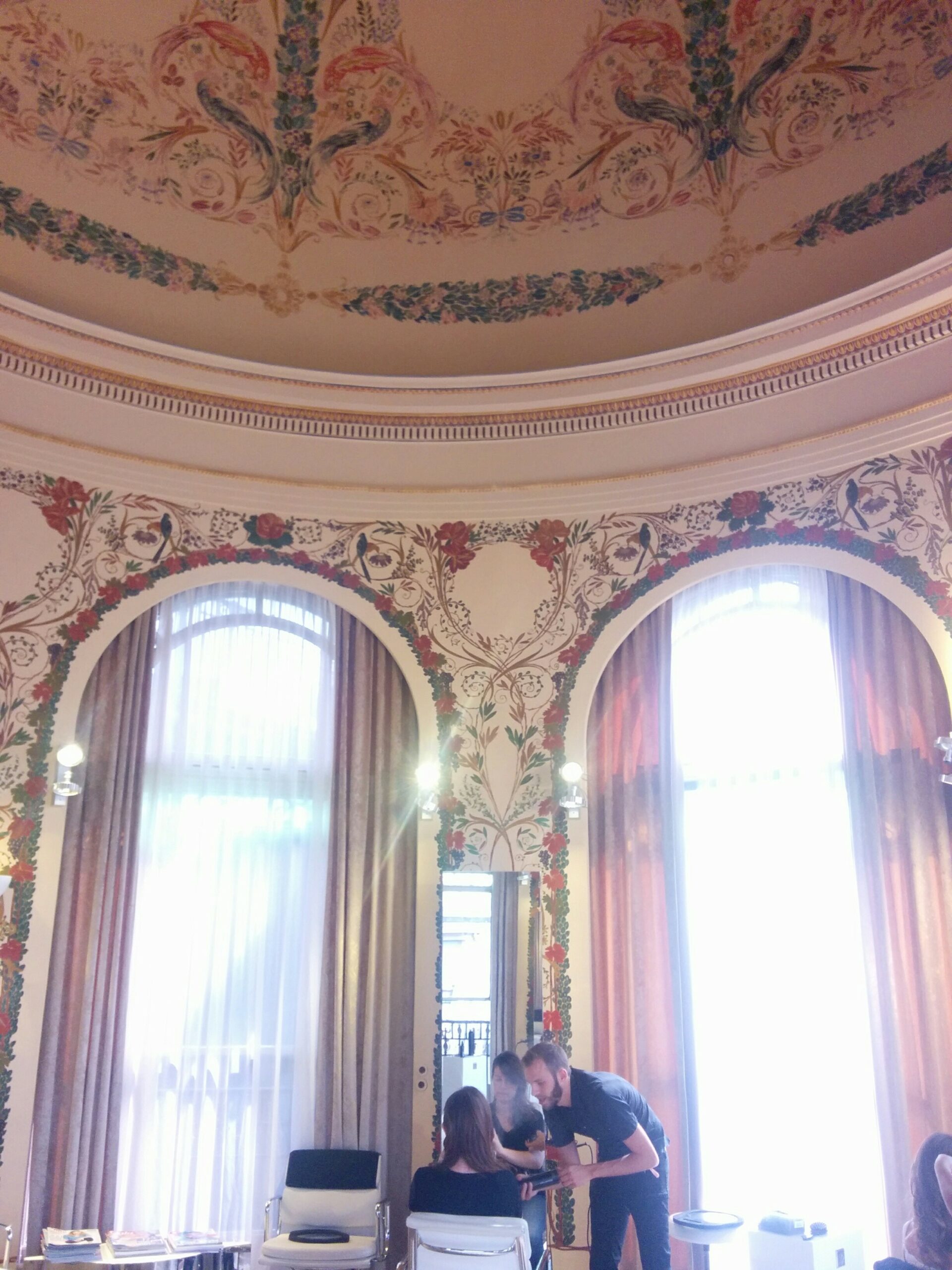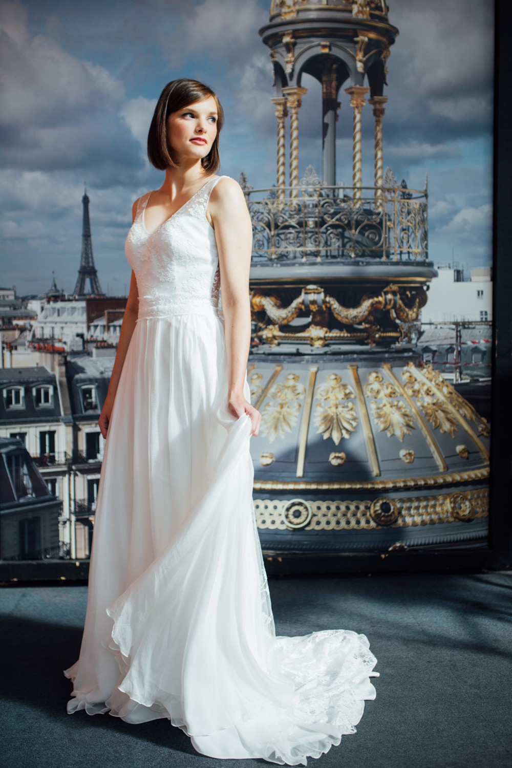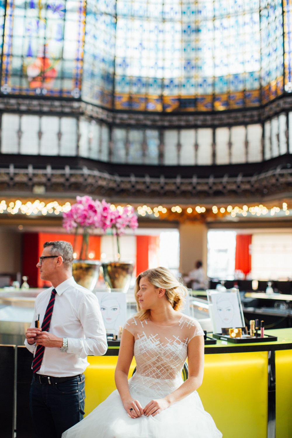 À ma grande surprise, j’ai non pas découvert un simple show-room mais un vrai espace réservé à la préparation des futurs époux. Dans l’une des magnifiques rotondes des Galeries Haussmann, on y trouve un salon de coiffure, Coiff1rst, avec une vue sublime de Paris. Des « suites » sont réservées pour les essayages. Le Jour J, les futurs mariés peuvent ainsi se faire habiller, coiffer et maquiller sur place dans un cadre idyllique mais aussi entourés des meilleurs professionnels de la beauté.