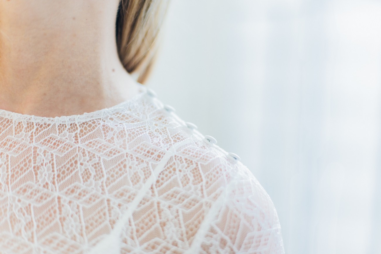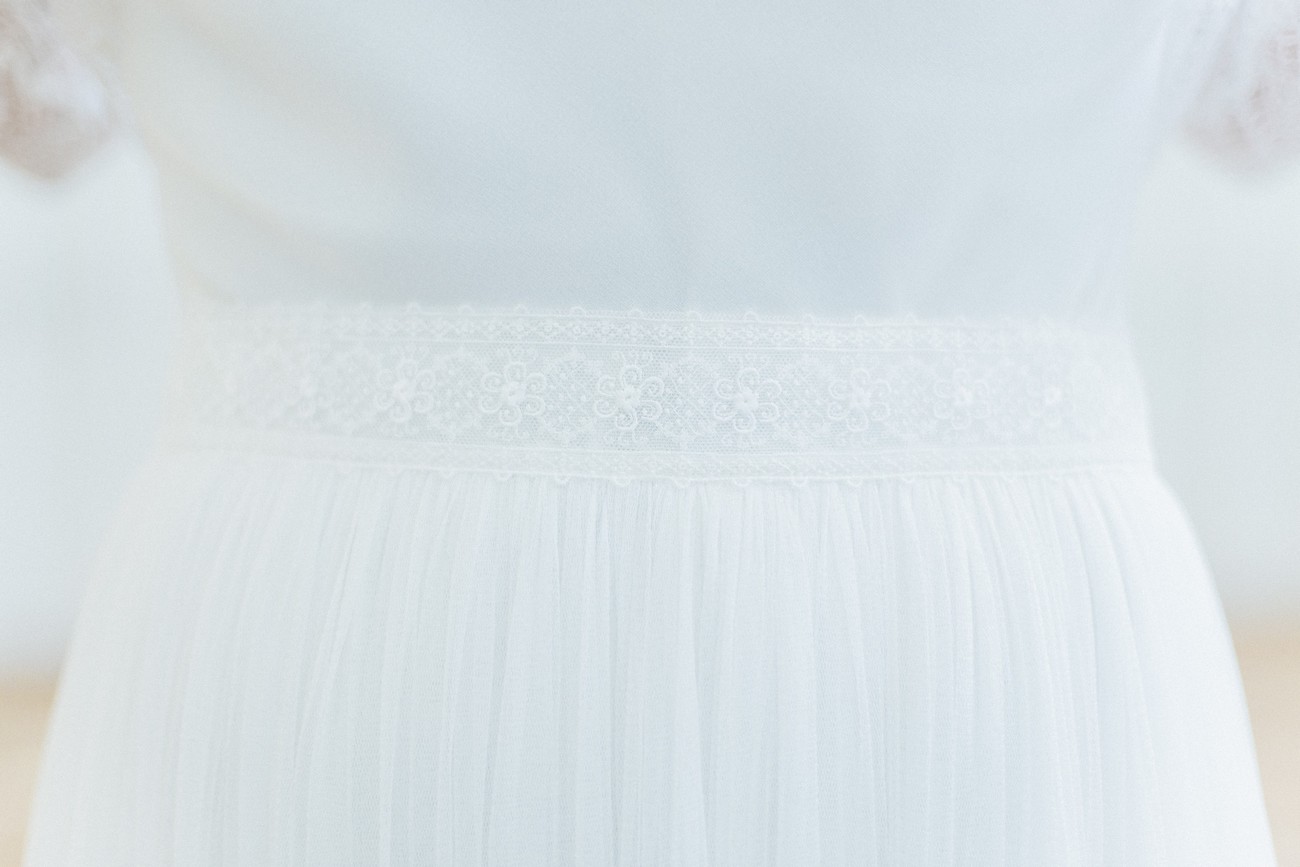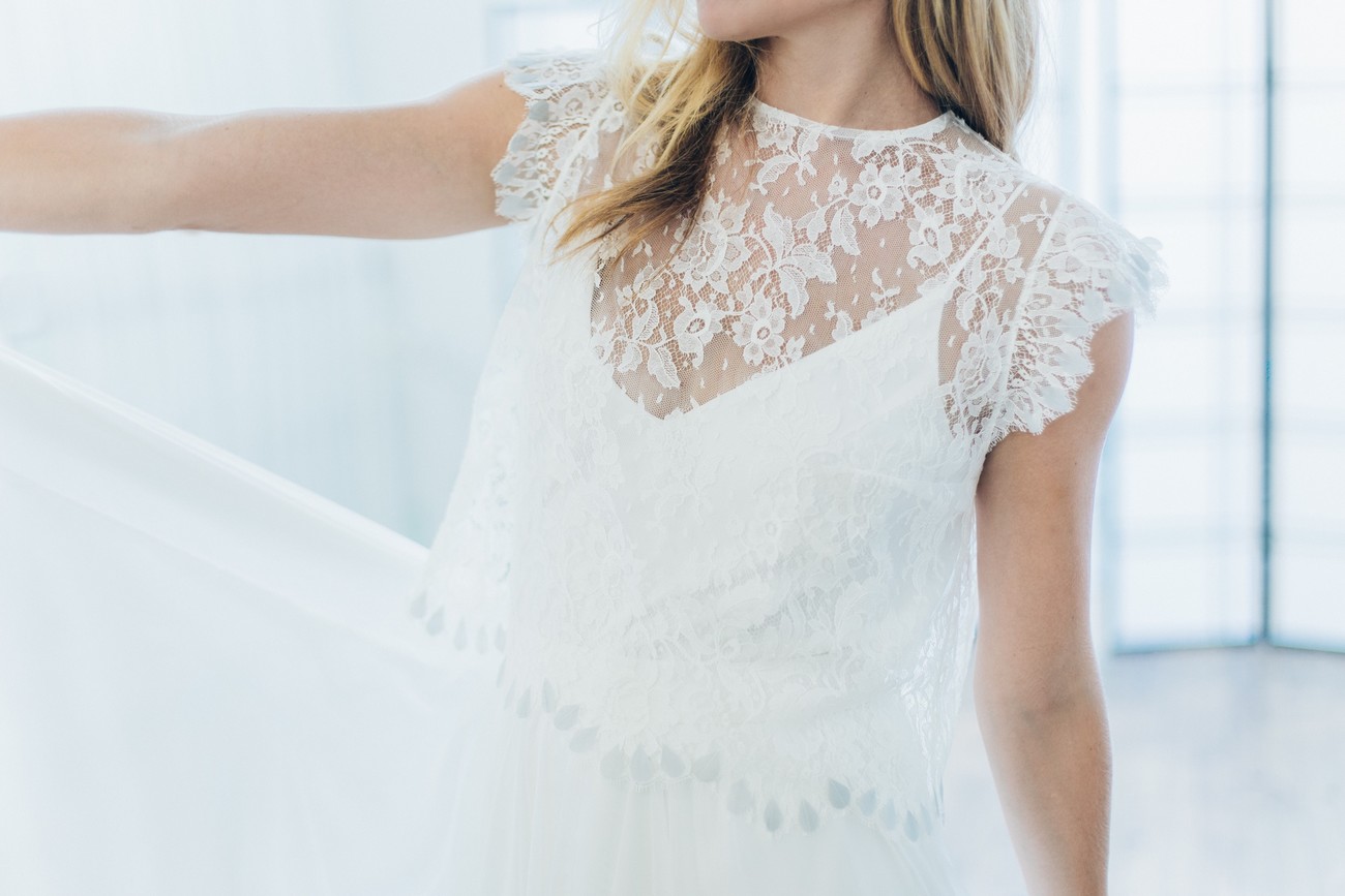 Difficile de choisir mais je dois avouer que ma favorite est la robe YUNA. J’adore le dos nu qui joue sur la transparence avec la dentelle de Chantilly, elle-même brodée de plume et de perles Swarovski (que l’on peut voir sur le buste). Le tout donne un ensemble très chic mais aussi un peu bohème. Tout ce que j’aime !