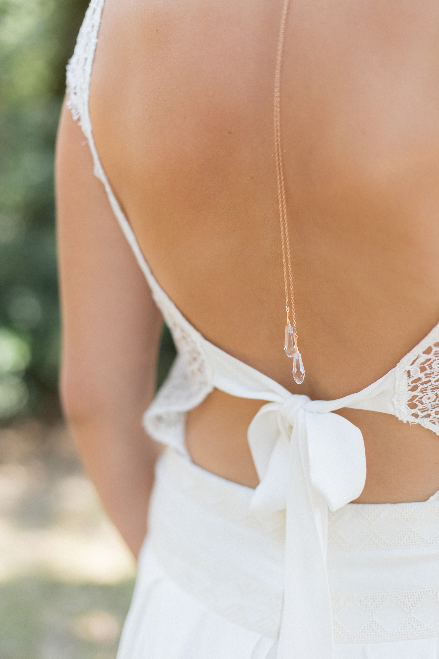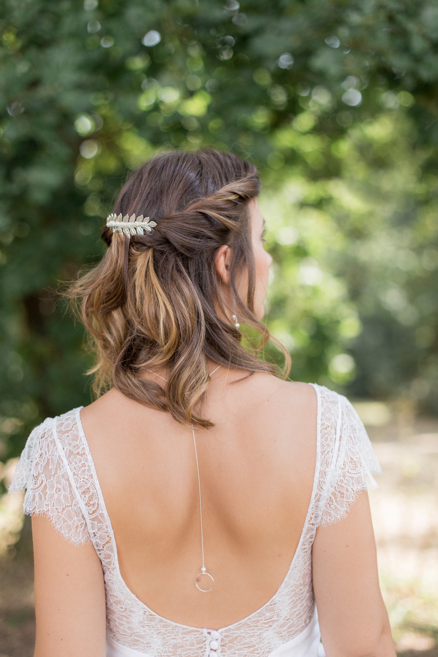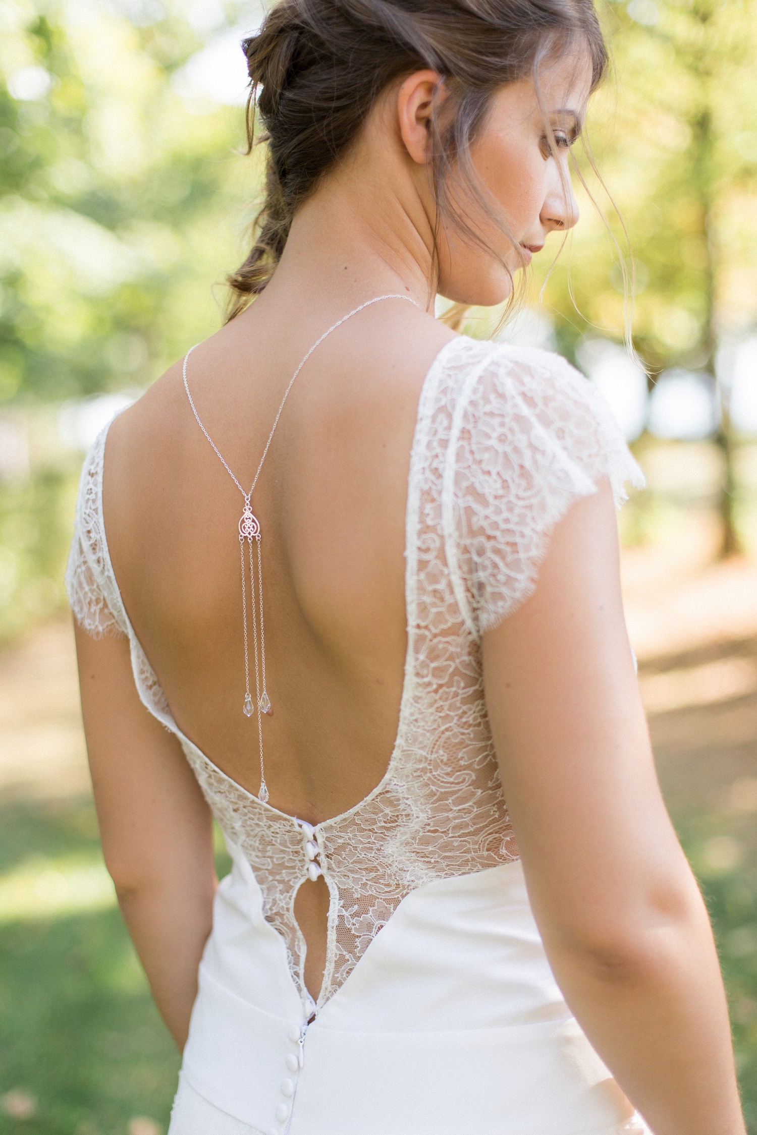 Pour sa nouvelle collection « Sweet Romance », la créatrice propose des colliers, des bracelets, des boucles d’oreilles mais aussi des bijoux de dos pour sublimer les dos nus de la mariée (la grande tendance chez les créateurs de robes de mariée, qui je l’espère ne s’arrêtera pas). Pour compléter sa parure, la mariée pourra choisir parmi une sélection de peignes, pics, couronnes et ornements qui tirent leur délicatesse des éléments de la nature.