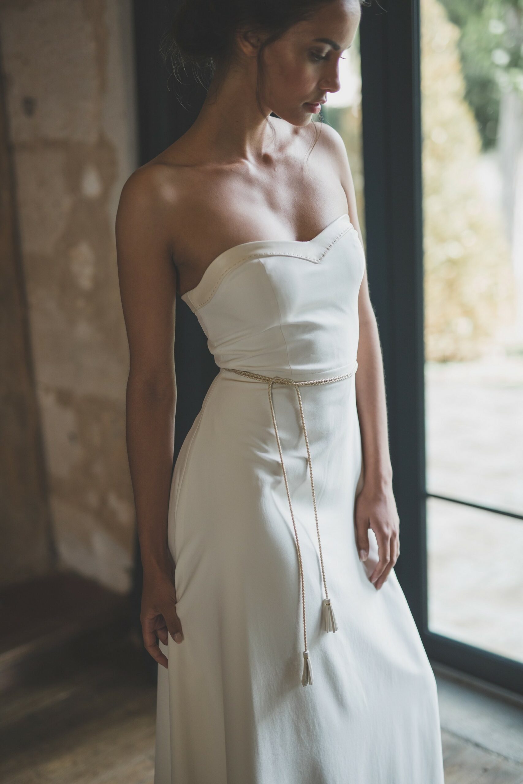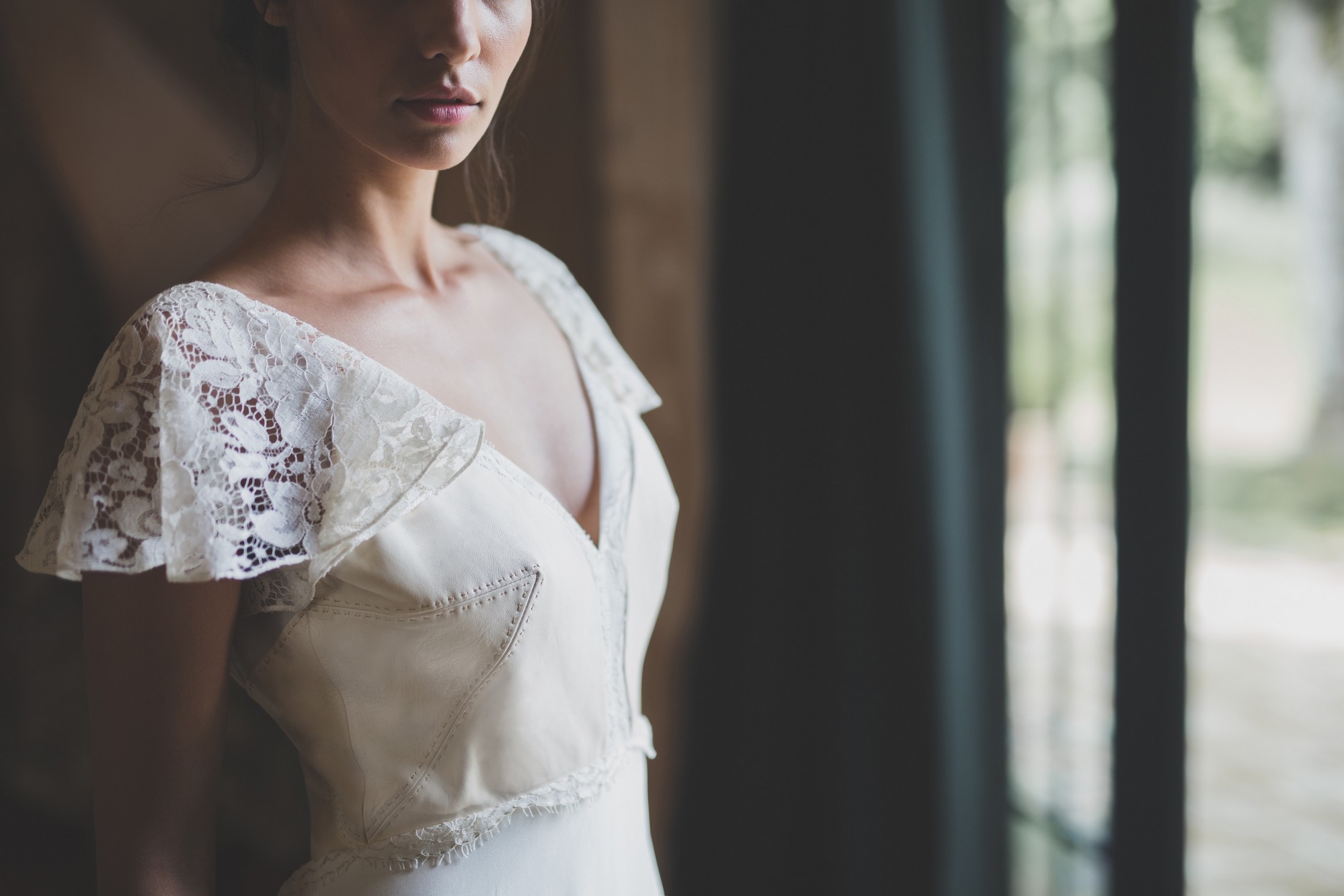 Les robes Elina et Louise se parent de pièces de cuir blanc, brodées au fil doré pour un effet rock tout en conservant la délicatesse et le romantisme de la robe de mariée. Le cuir est surpiqué à la main dans la pure tradition de l’artisanat français et pour un rendu de qualité. Pour adoucir la robe bustier, le modèle peut se parer d’un top en dentelle fleurie de Calais.