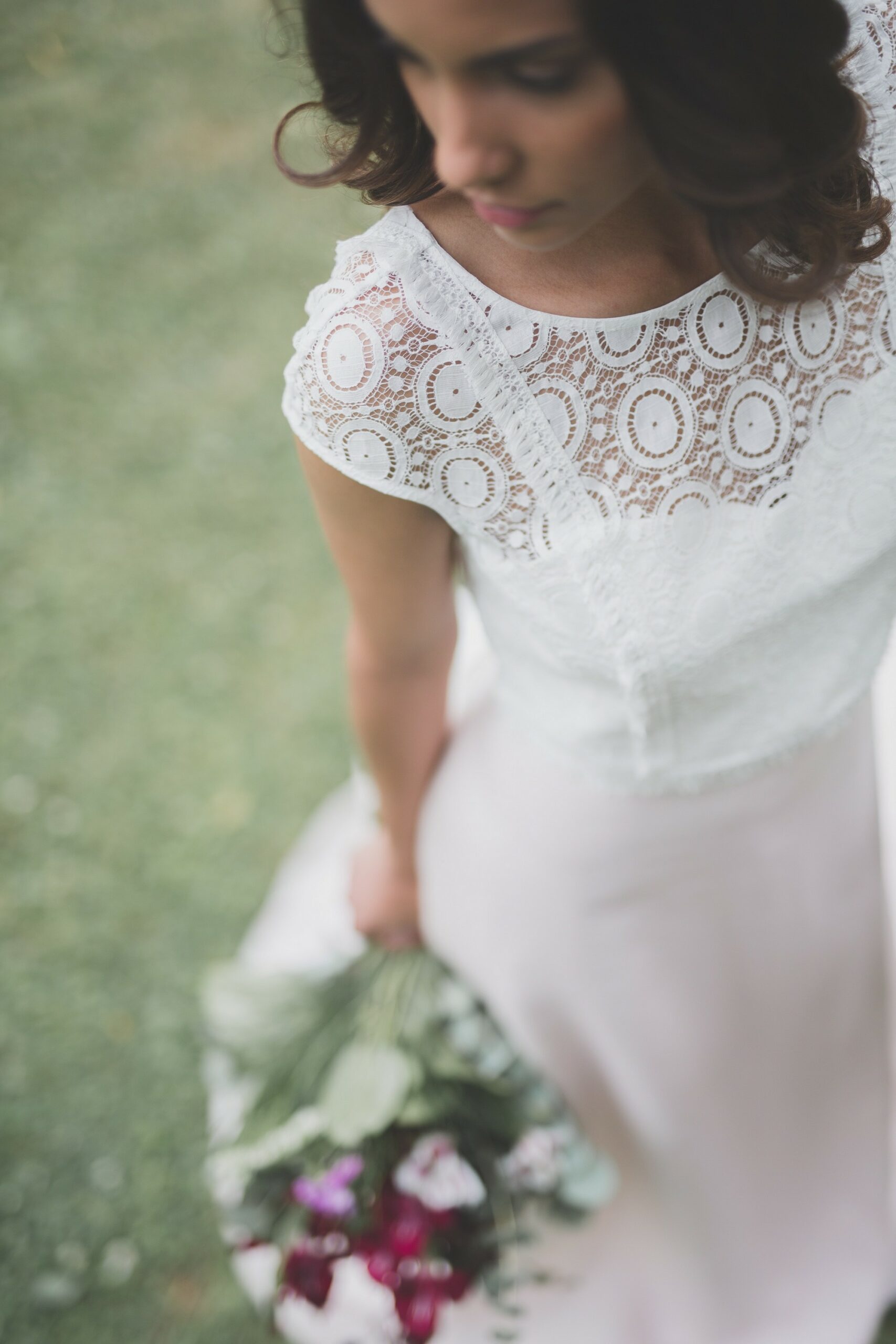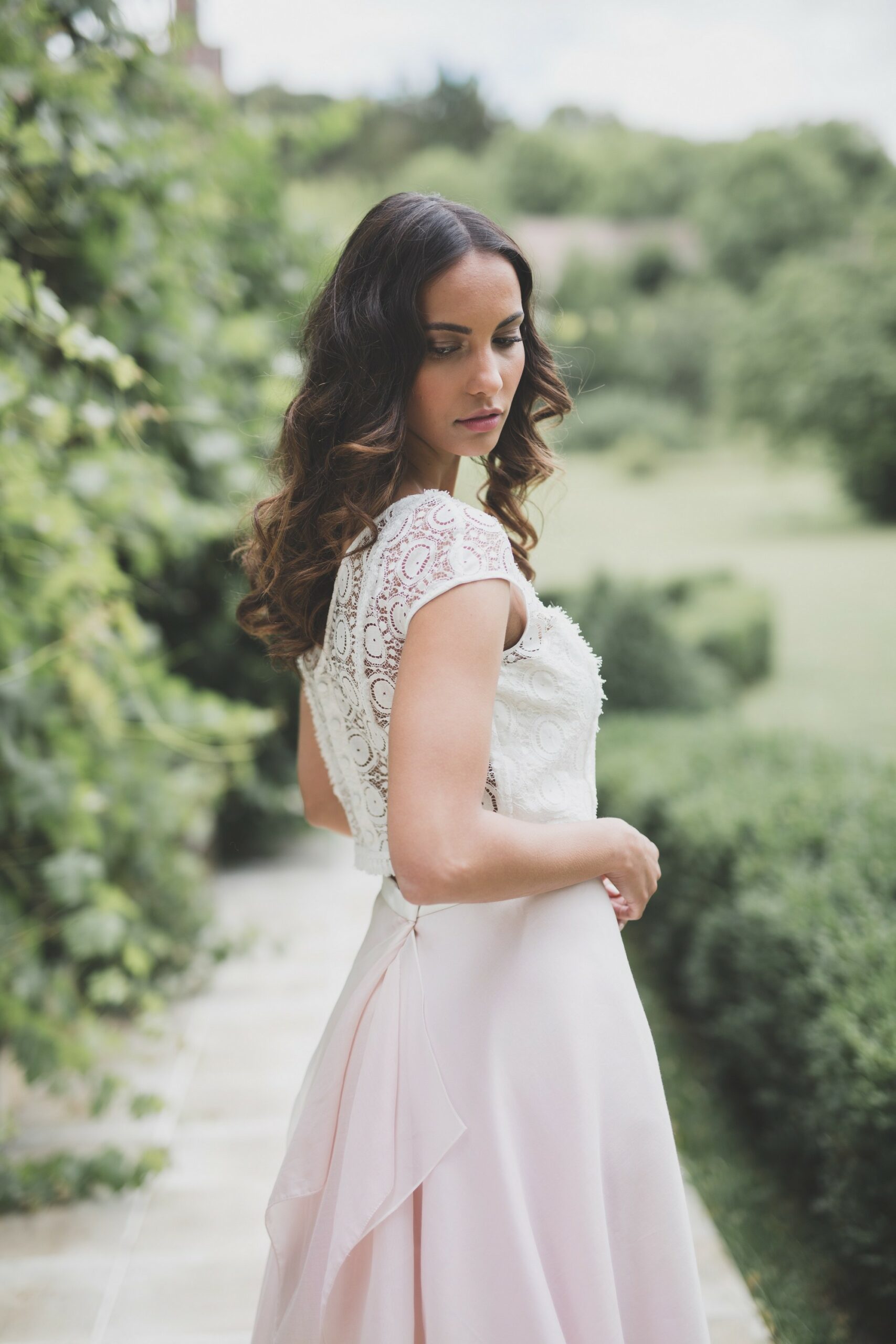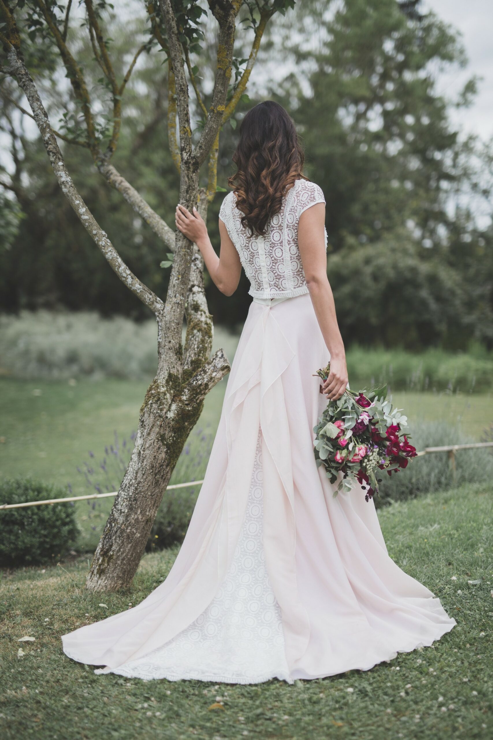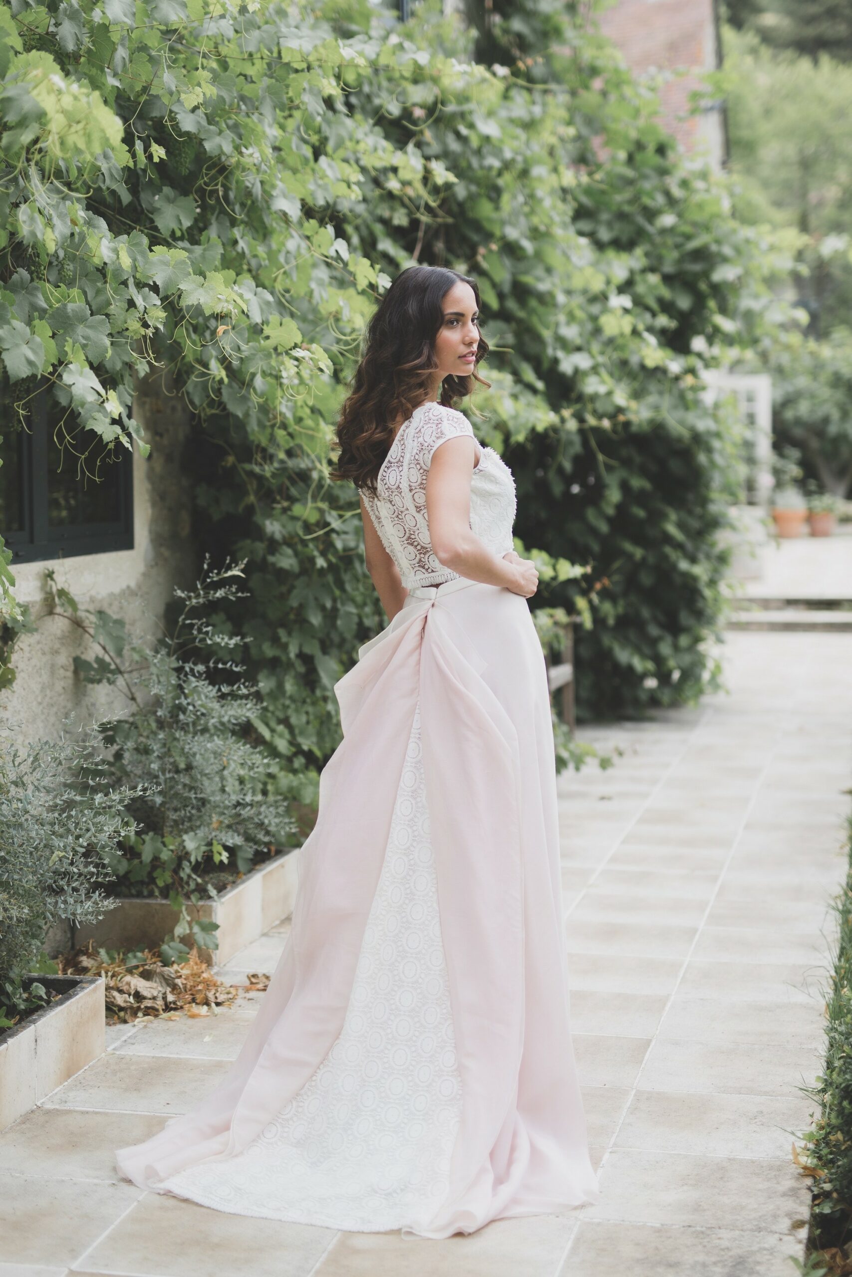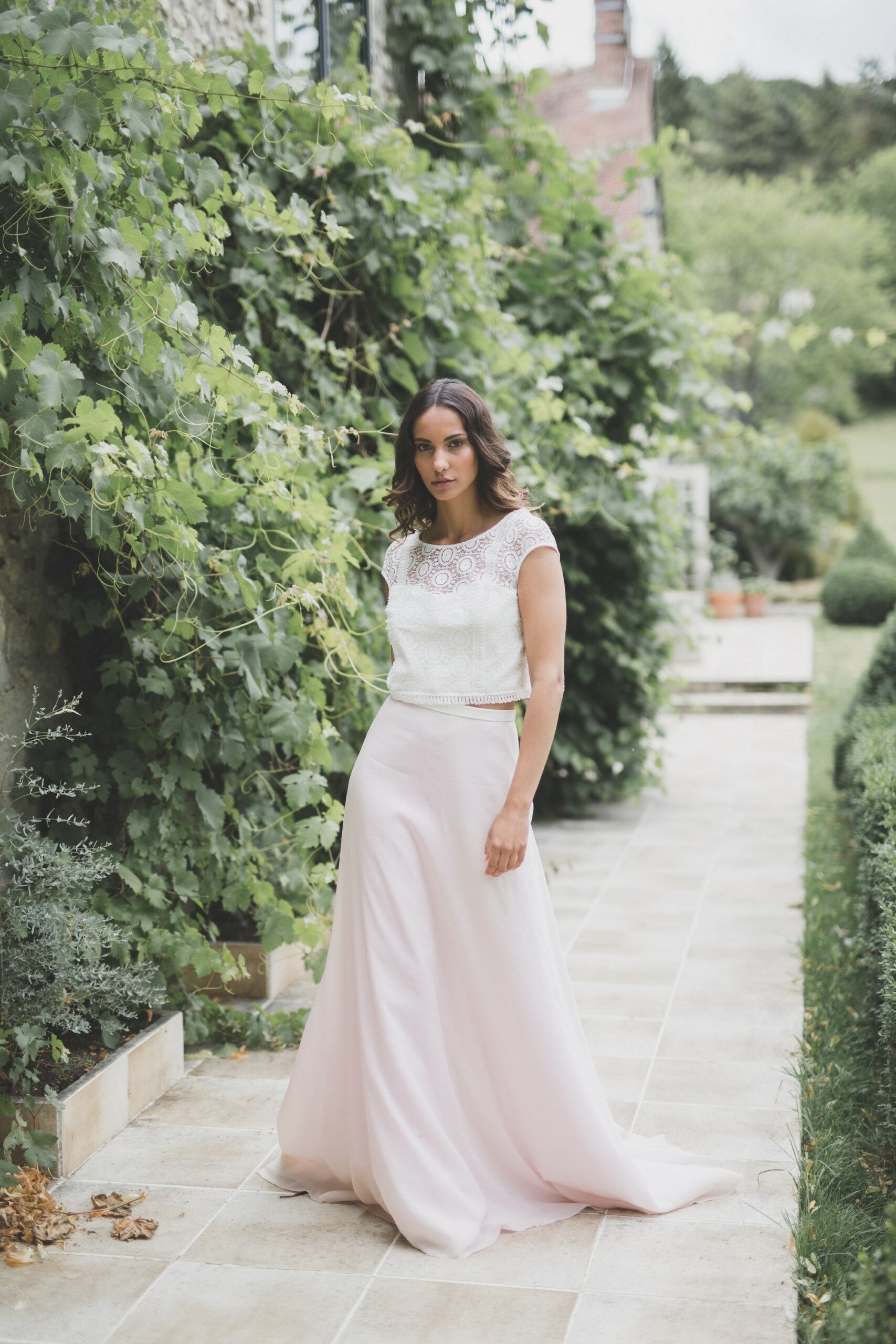 Je vous avais déjà parlé de mon amour pour les robes de mariée roses. Je ne peux donc que tomber amoureuse de l’ensemble ROSE des Mariées Fox. Un mélange audacieux composé d’un top à franges et dentelle de Cluny, associé à une jupe vaporeuse en organza champagne et voile de coton de soie. Un doux mélange que j’adore !