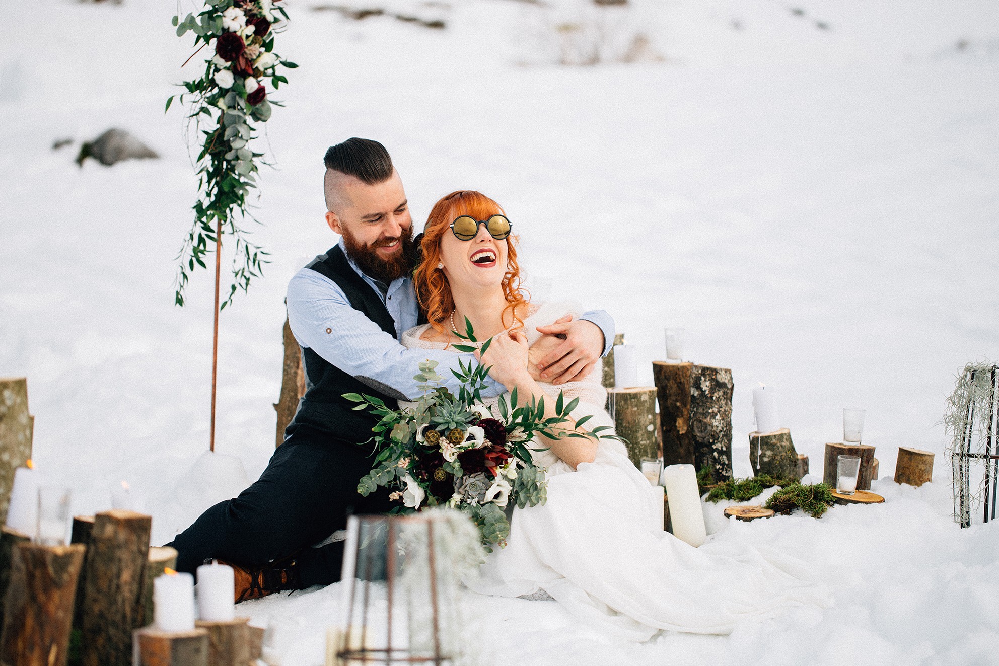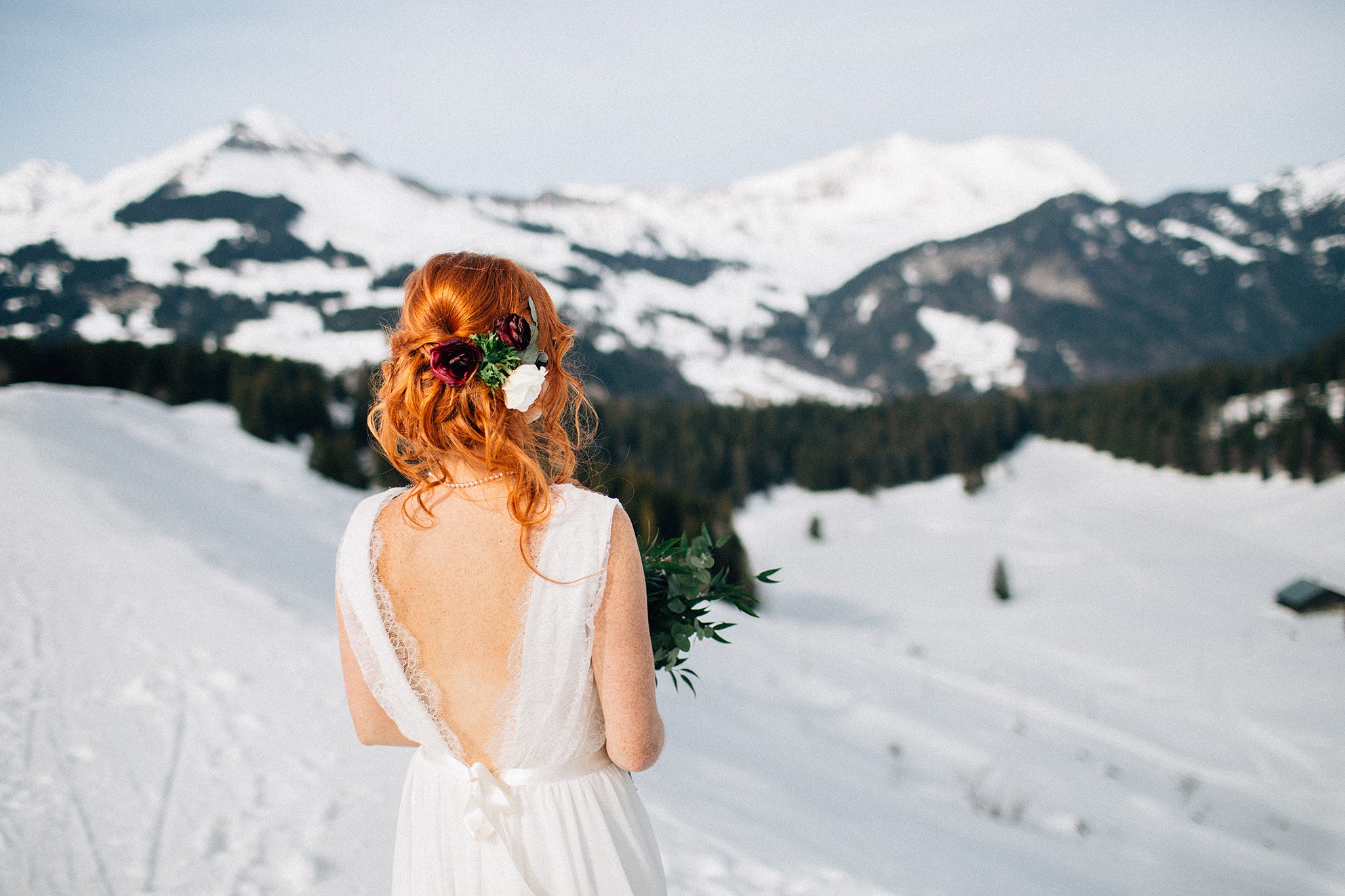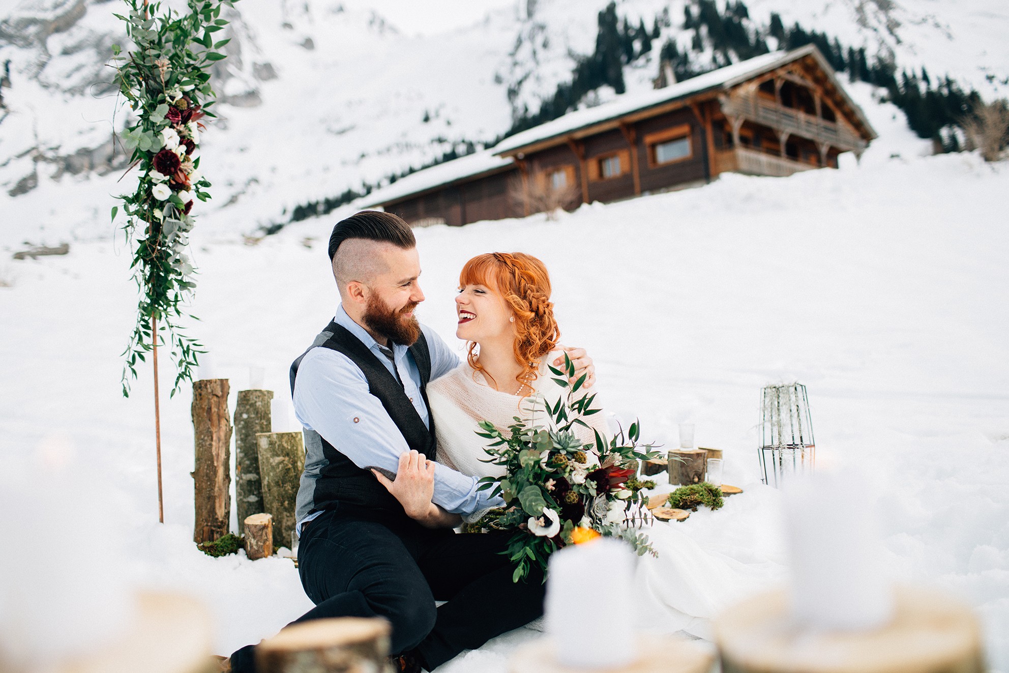 Certes, il ne faut pas être frileux mais il faut avouer qu’une cérémonie au milieu des montagnes est aussi magique d’un mariage en bord de mer. La beauté sauvage des monts, la pureté de la neige, la chaleur douce du bois… Encore mieux si une belle journée s’annonce, comme ici pendant ce shooting, où notre jolie mariée a pu revêtir des lunettes de soleil ! L’accessoire ultime lorsque l’on est un peu hipster.