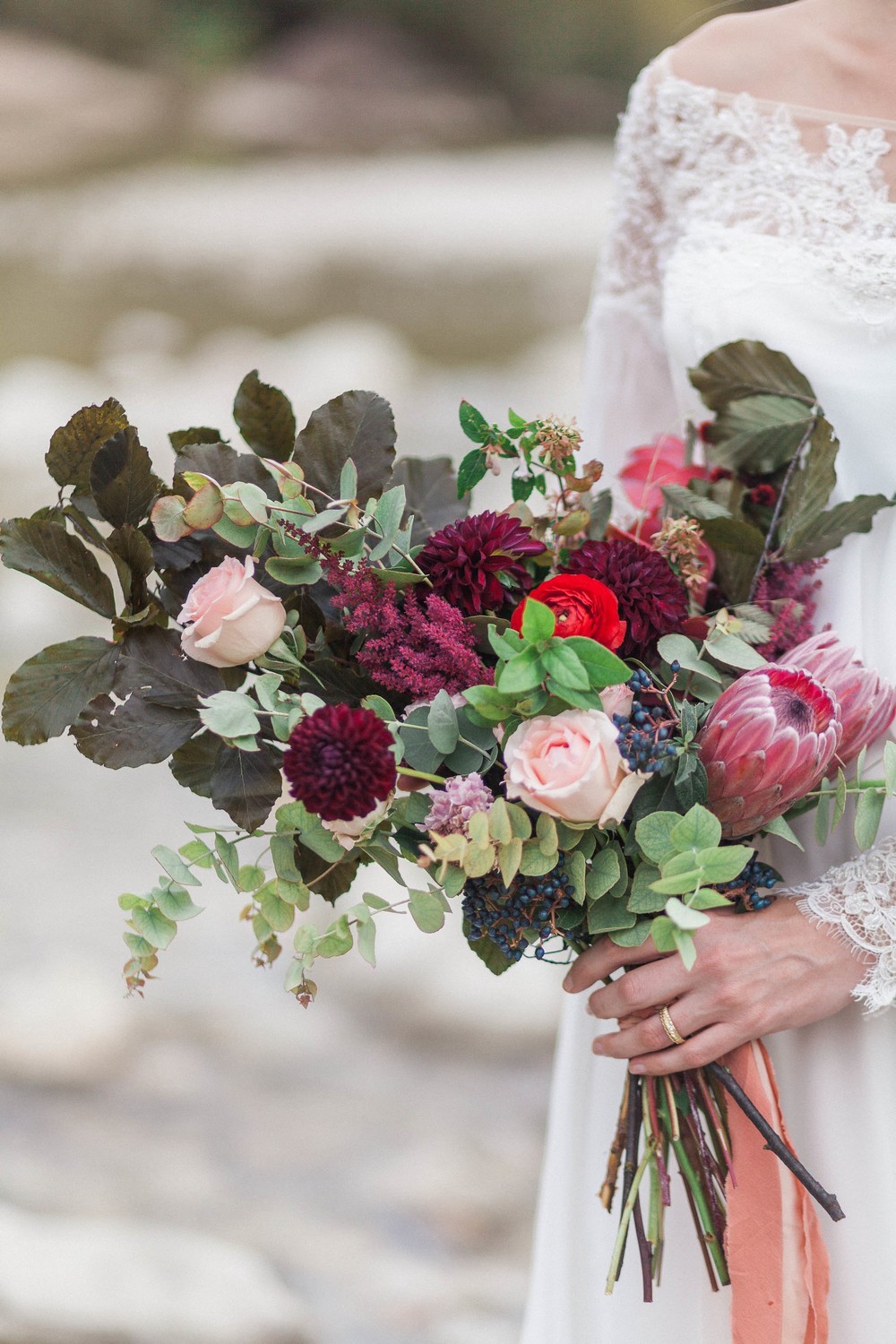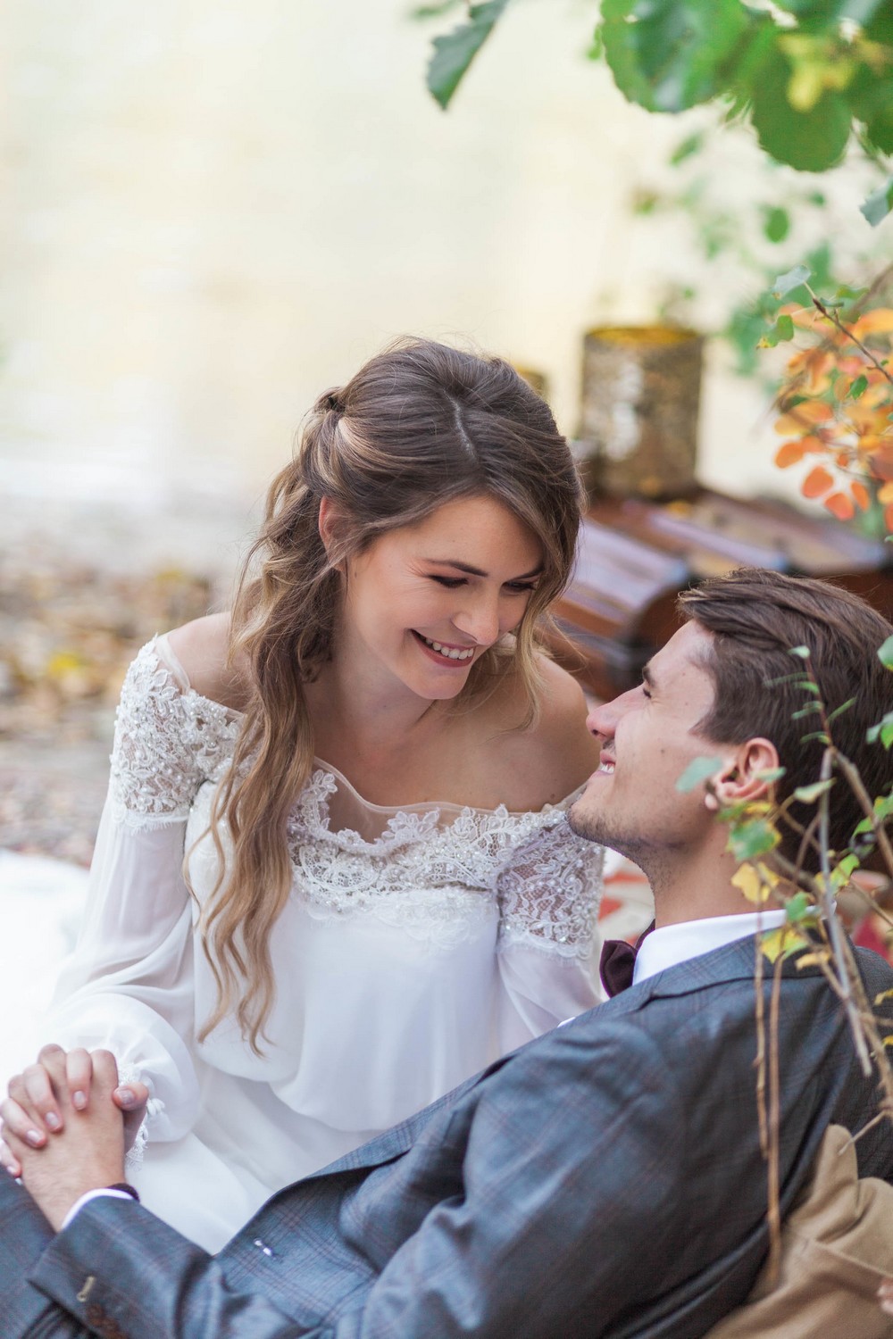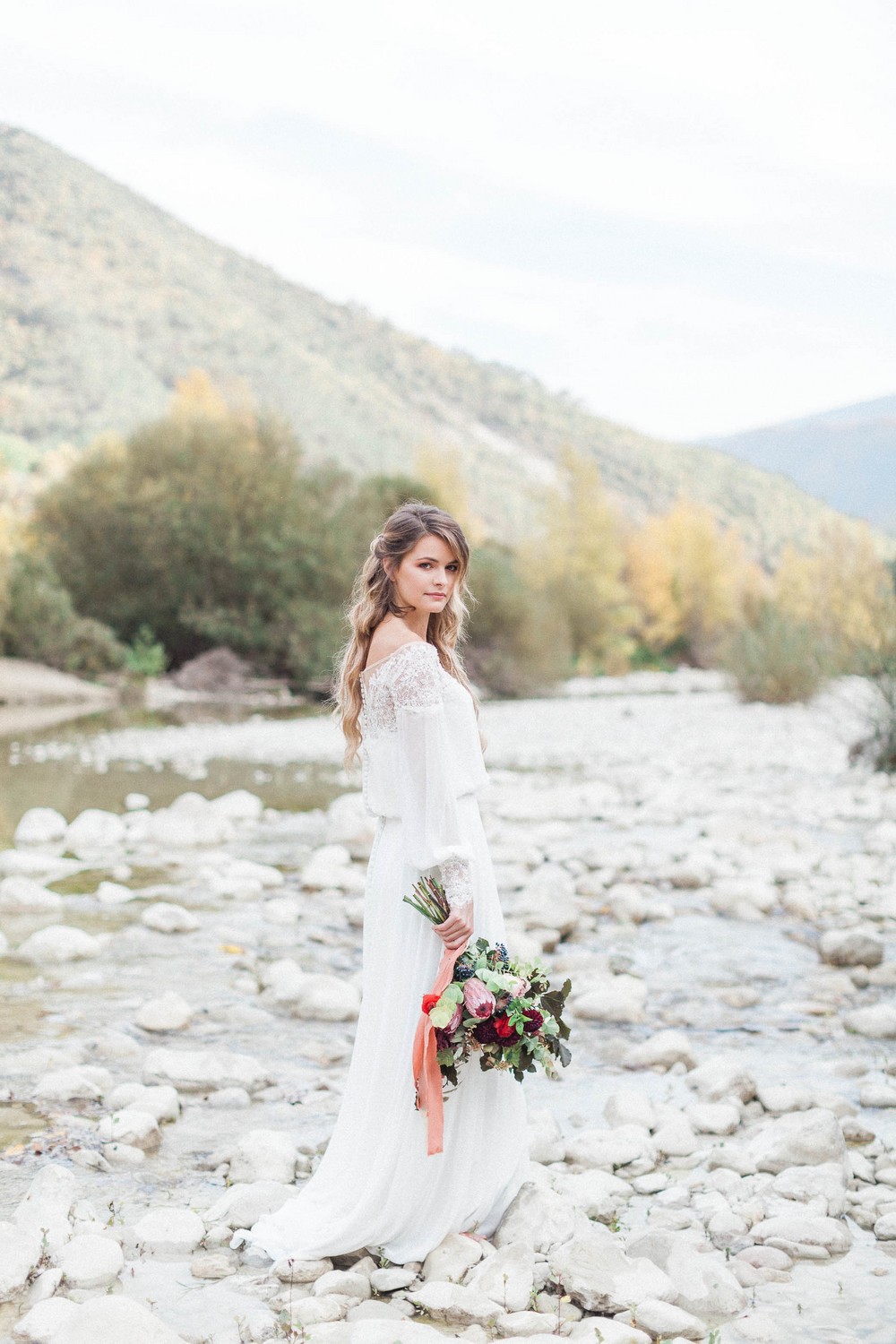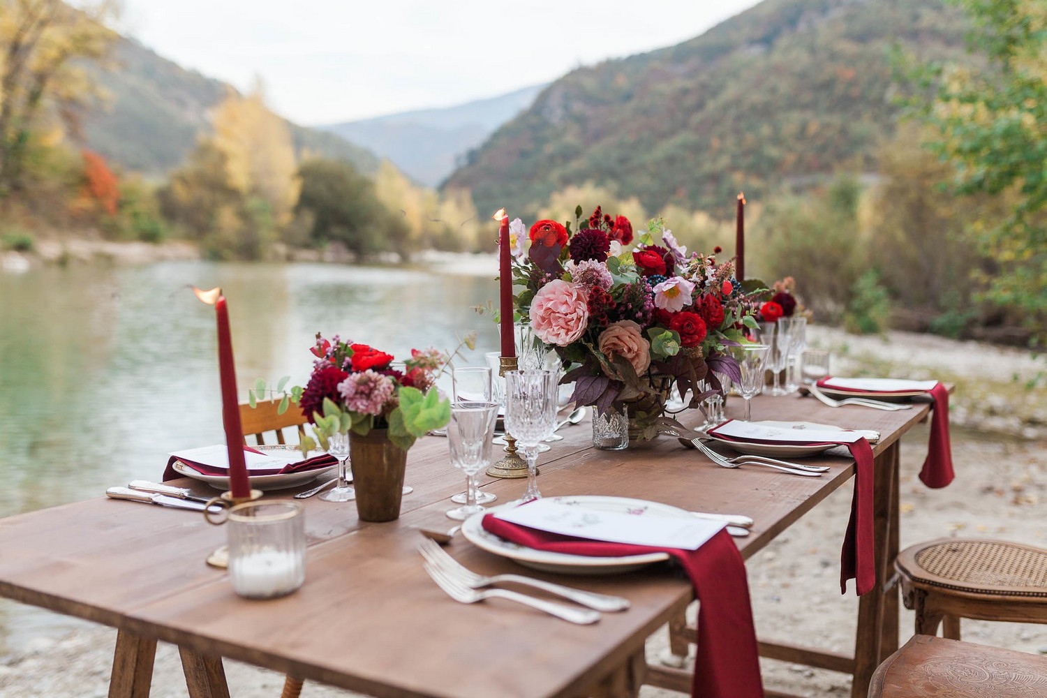 Lorsque l’on parle de Nice, nous pensons souvent à la promenade des Anglais et à ces bords de mer. Pourtant, la région regorge d’autres beautés naturelles, nichées au cœur des montagnes. Comme à l’image de la Vésubie, petite rivière d’un bleu transparent, qui traverse des jolis petits villages de charme. C’est dans ce décor aux pierres blanches que l’équipe a décidé de s’installer pour nous offrir un mariage aux influences automnales.