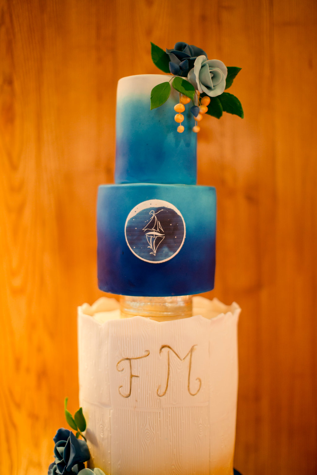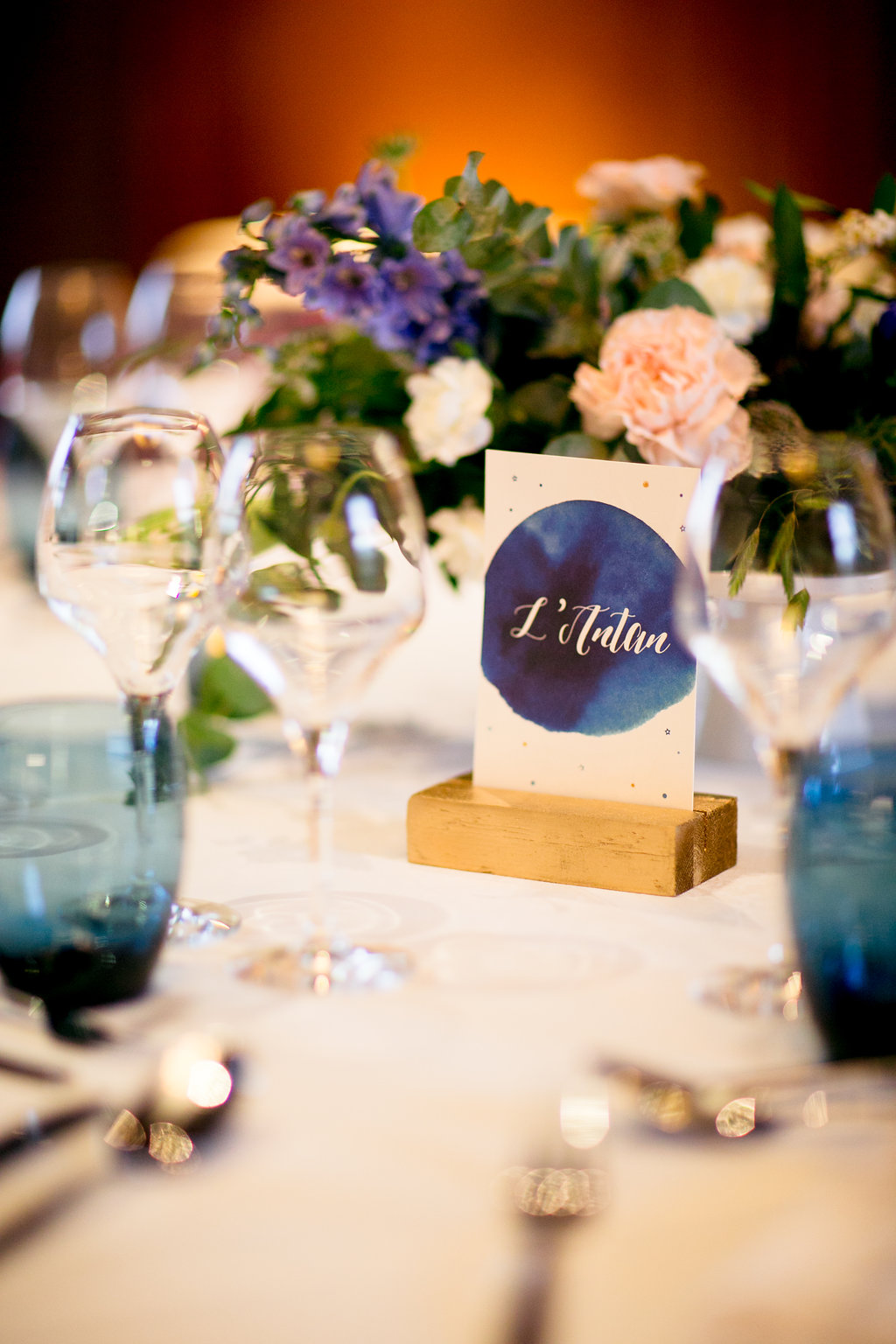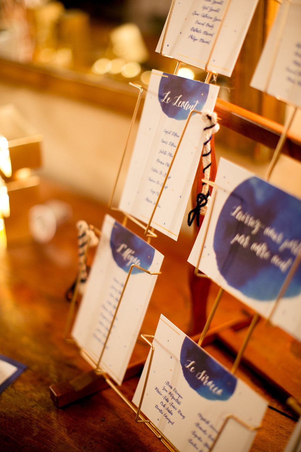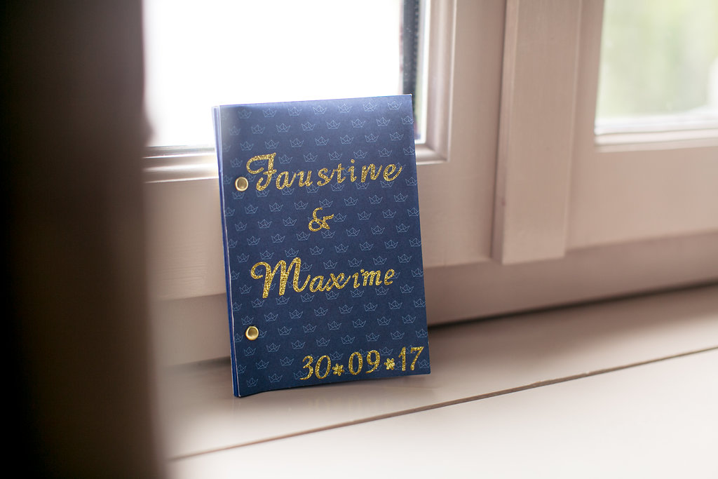 Nous voulions faire un mariage qui nous ressemble. J’ai été prendre quelques idées sur Pinterest mais c’est surtout nos imaginations respectives qui ont fait le reste ! En commençant par notre « blason », comme le disait si bien Anouk Autier, notre maître de cérémonie laïque et fleuriste, nous avions en tête de partir sur l’idée du dessin de « la jeune fille et la vieille dame » que l’on voit selon le point de vue que l’on prend sur le dessin. Etant une danseuse et Max un marin, nous avions l’idée d’entremêler une danseuse et un bateau afin de créer une unité (notre future famille) en réunissant nos deux symboles. Virginie de River Fabric a bien cerné notre idée et nous a proposé un très joli visuel pour nos faire-part et déclinaisons lors du jour J. Quant à la thématique couleur, le bleu marine pour la mer et le doré pour les paillettes des spectacles de danse !