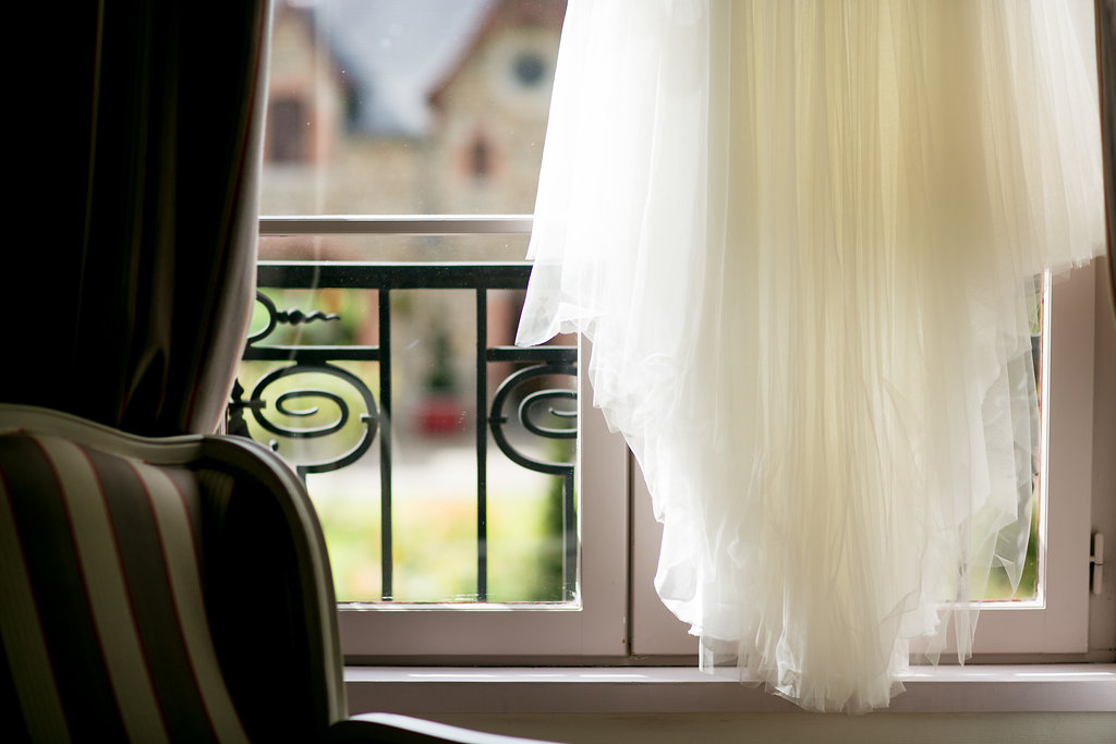 Dans les deux premiers magasins sélectionnés, j’ai essayé beaucoup de robes et j’étais accompagnée de trois à quatre personnes. Trop de choix, trop d’avis …. Je n’ai pas eu de réel coup de cœur. J’ai trouvé ma robe vraiment par hasard avec ma mère dans une boutique où j’allais seulement pour essayer un modèle vu sur internet et que je voulais voir pour ne pas avoir de regret. J’avais pris rdv en fin de journée avant de partir pour Paris pour les fêtes de fin d’année et j’avais laissé Max dans un café à côté de la boutique en lui disant que j’en avais pour une demi-heure maxi ! Il a attendu presque deux heures et au moment de sortir de la boutique, il s’apprêtait à demander à une femme dans la rue de rentrer dans le magasin pour savoir si tout allait bien ! Marie-Claire, du magasin « Les Mariées d’Emilie » à Nantes a su cerner mes envies inconscientes (une robe pas si bohème que ça et plutôt moderne et légèrement princesse puisqu’il y avait un château collé au domaine de la réception !). Faites confiance aux vendeuses, elles ont l’expérience et l’œil pour savoir ce qui vous va ! La petite histoire veut que j’ai essayé une robe que je pensais être celle que je m’étais imaginée être la bonne (joli dos tout ouvert, bohème …) mais Marie-Claire m’a dit de continuer les essayages parce que les futures mariées hésitaient toujours entre deux choix. Je lui ai fait confiance mais avec les robes suivantes, je revenais toujours sur cette robe-là. Pourtant, la dernière robe que j’ai essayée (Ma fameuse robe) a tout remis en question. Marie-Claire m’a fait réessayer mon premier choix et là j’ai dit « ah nan, elle est fade » et j’ai su que la dernière robe était MA robe. Je n’ai plus voulu la quitter !