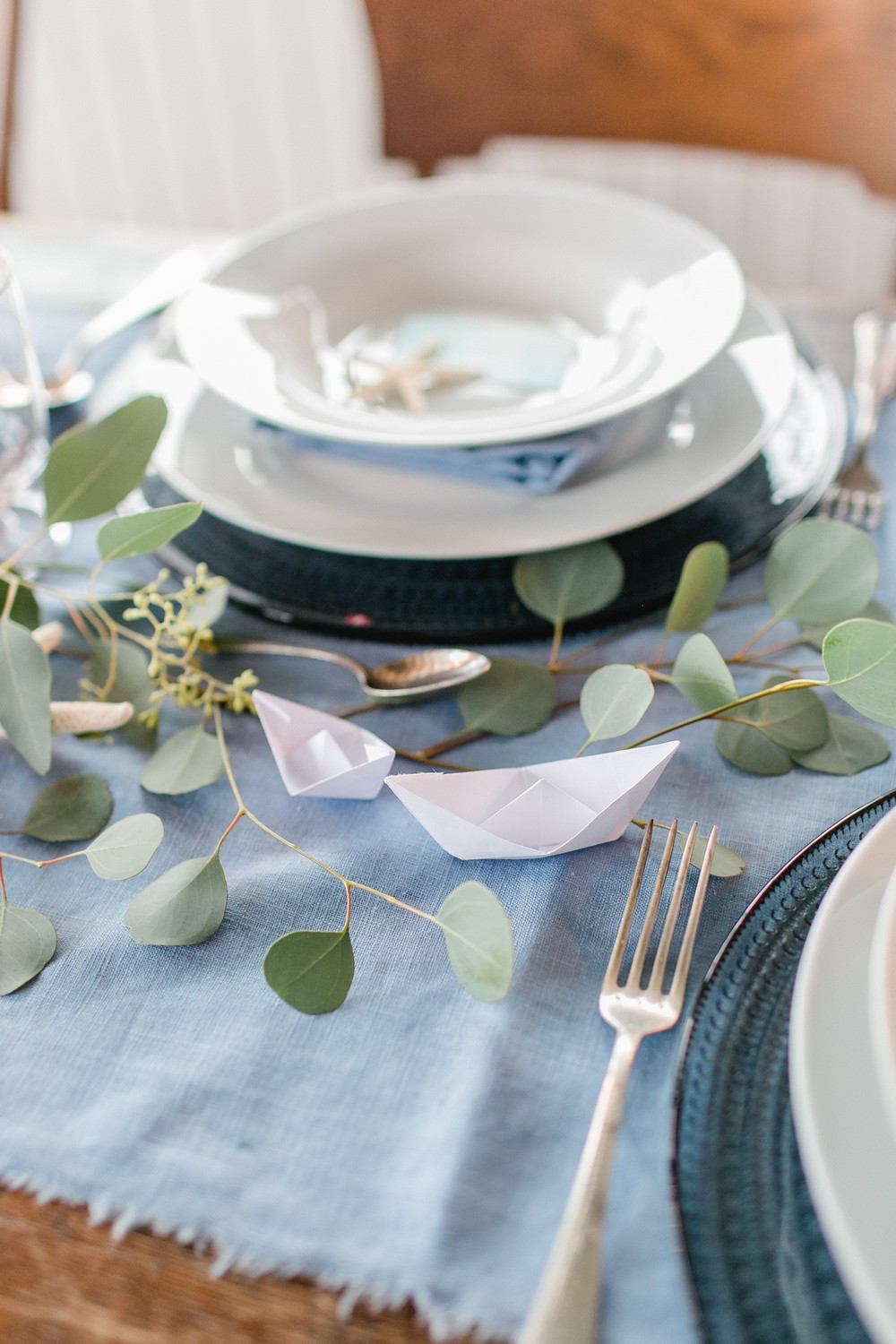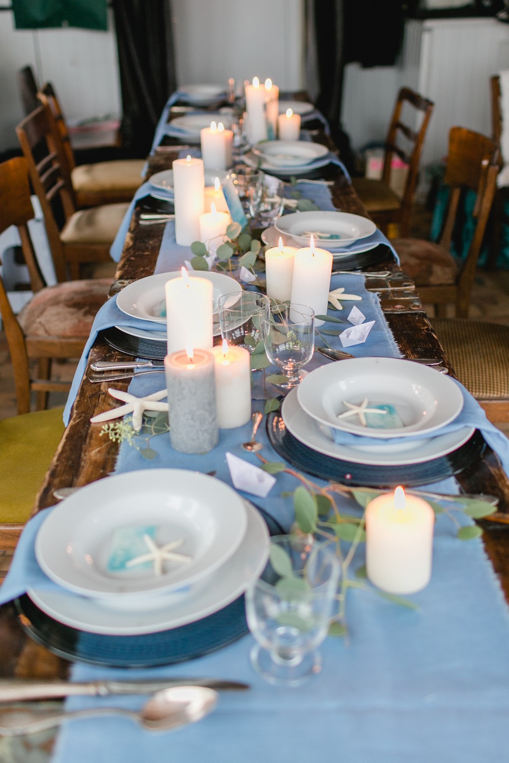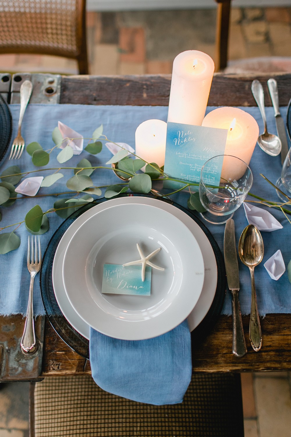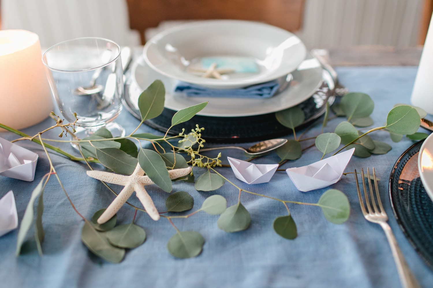 La décoration se veut minimaliste mais terriblement belle ! Le bois brut se marie avec un centre de table en lin bleu, partiellement décoré de bateaux en papier et de branches d’eucalyptus. Quelques étoiles de mer et des bougies blanches complètent une décoration de table douce et légère.