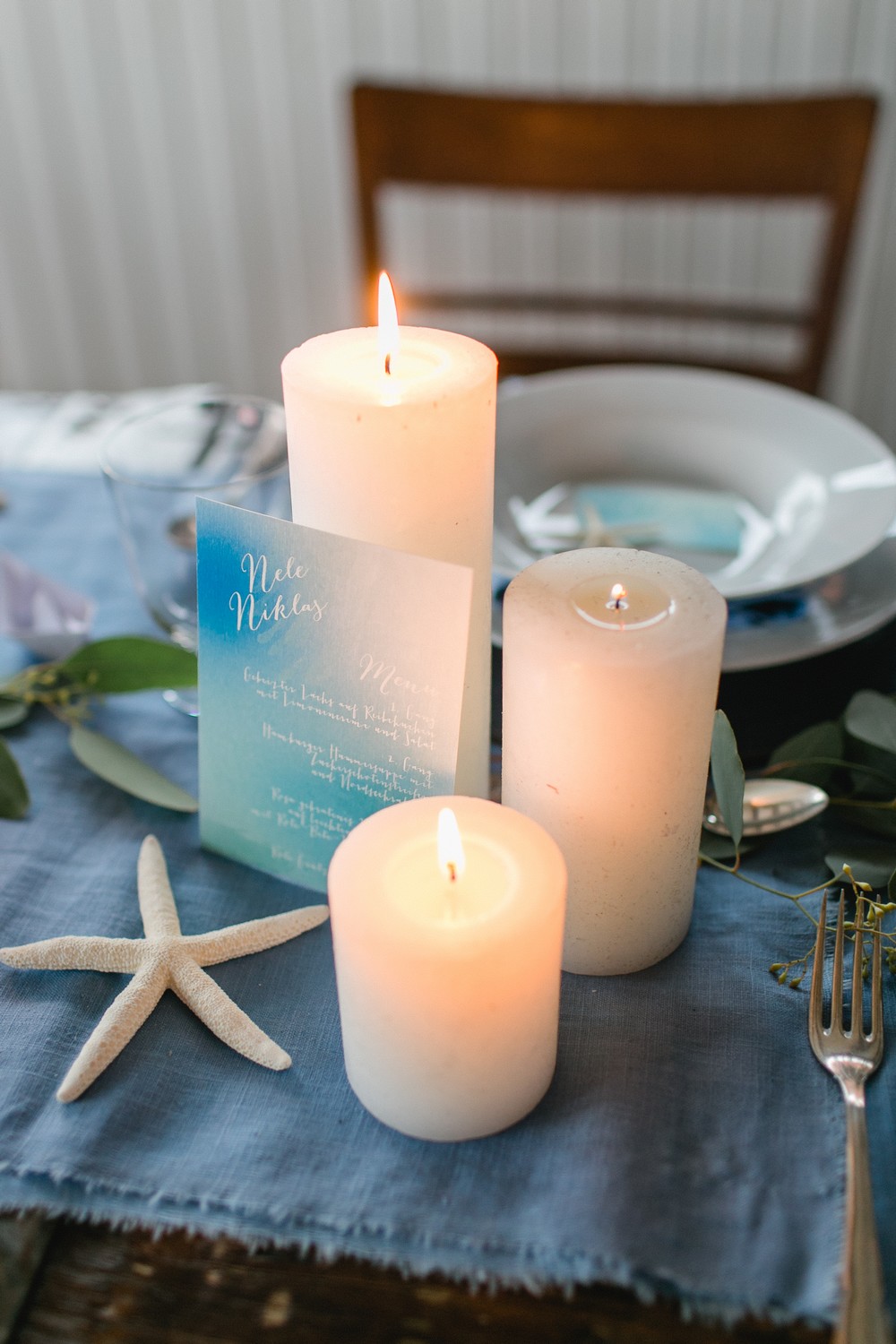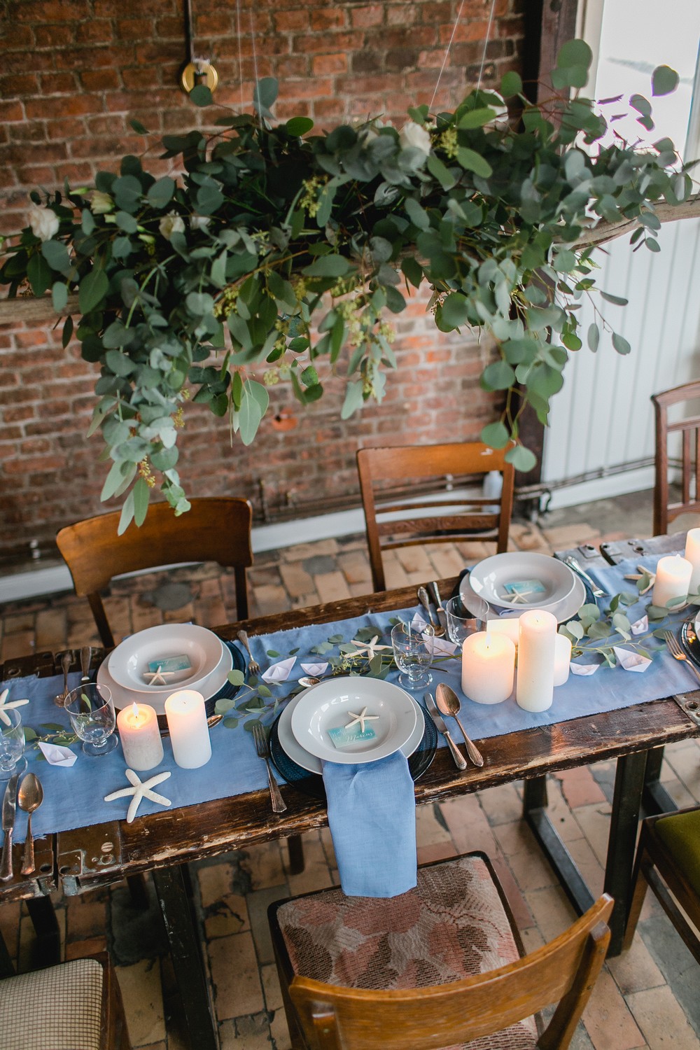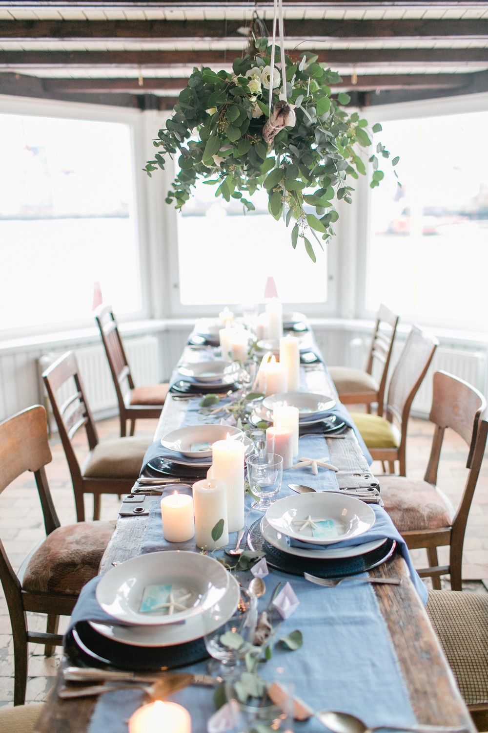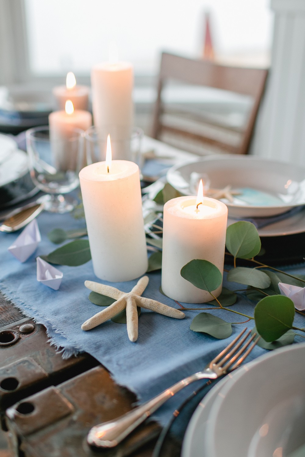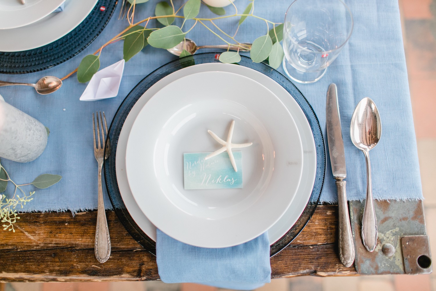 La décoration se veut minimaliste mais terriblement belle ! Le bois brut se marie avec un centre de table en lin bleu, partiellement décoré de bateaux en papier et de branches d’eucalyptus. Quelques étoiles de mer et des bougies blanches complètent une décoration de table douce et légère.