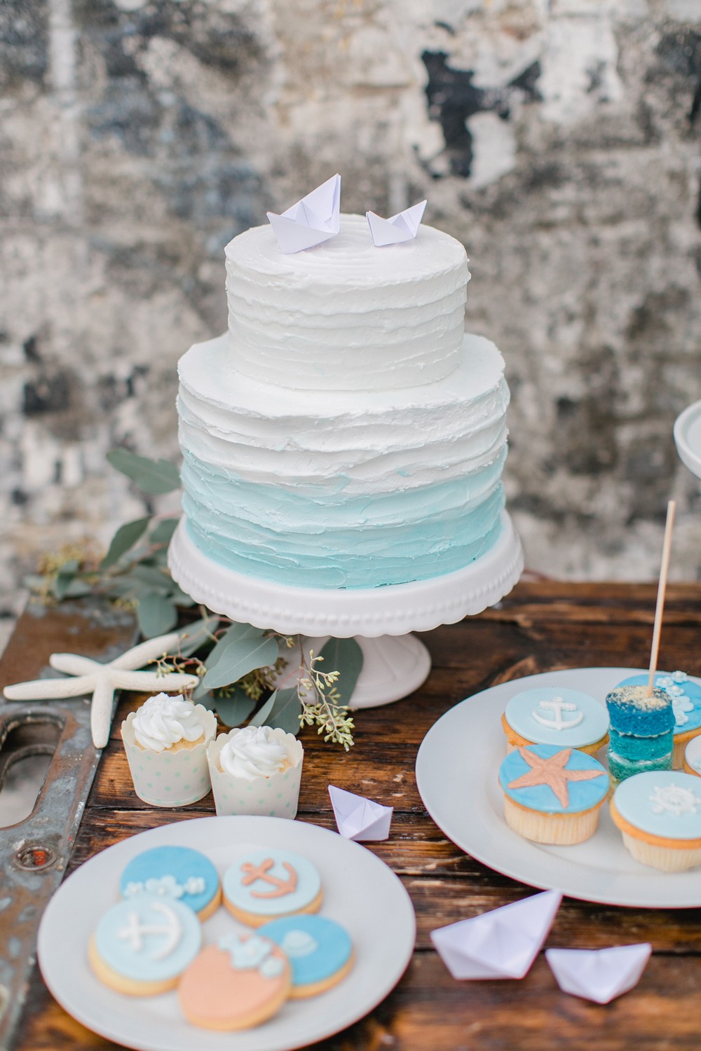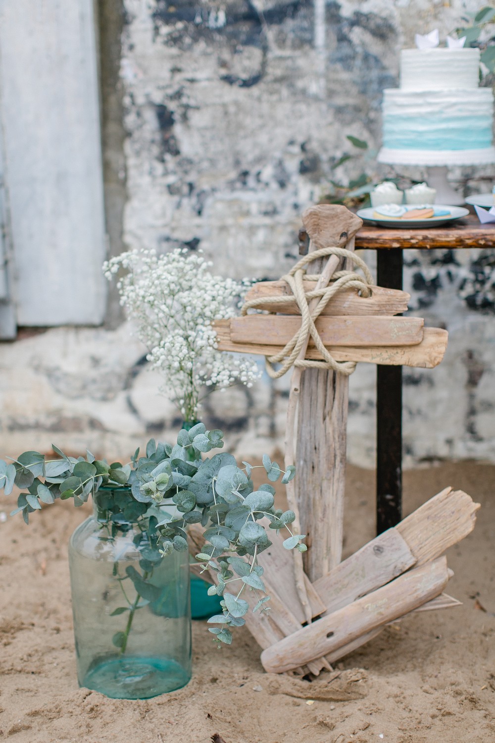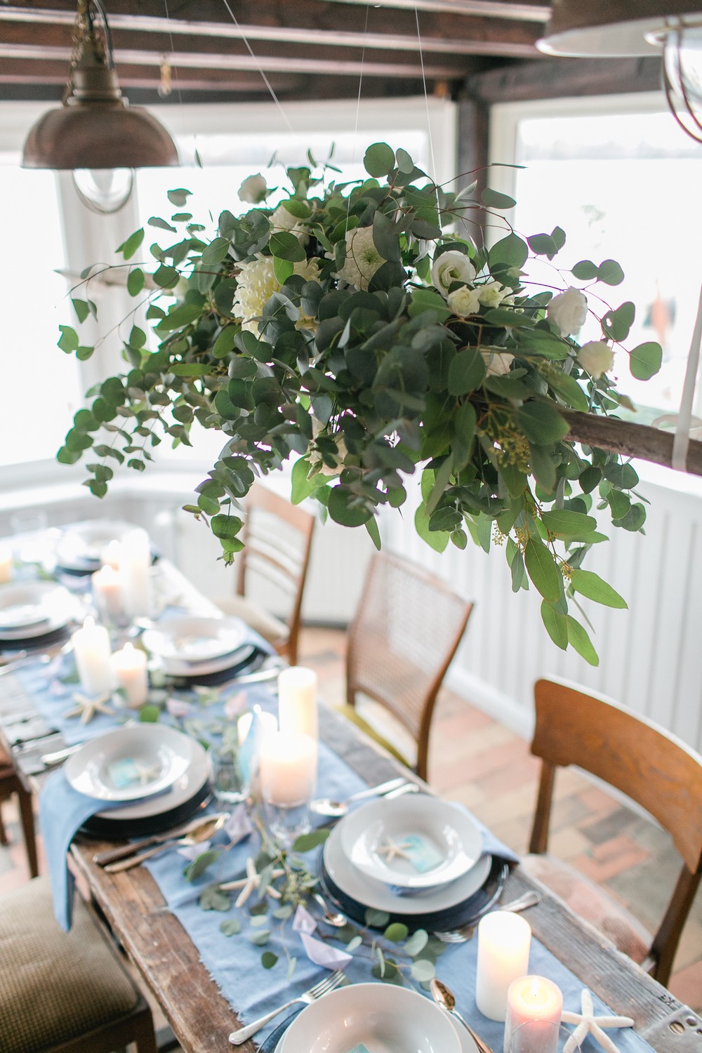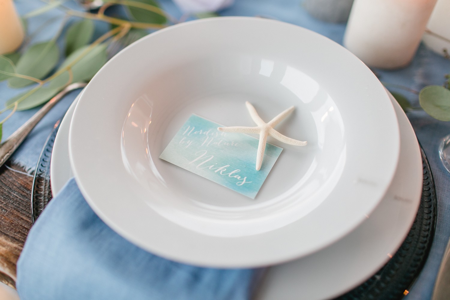 La décoration se veut minimaliste mais terriblement belle ! Le bois brut se marie avec un centre de table en lin bleu, partiellement décoré de bateaux en papier et de branches d’eucalyptus. Quelques étoiles de mer et des bougies blanches complètent une décoration de table douce et légère.