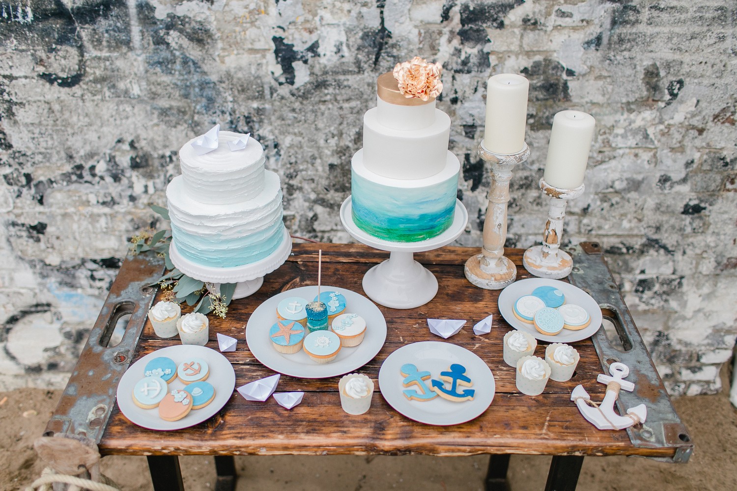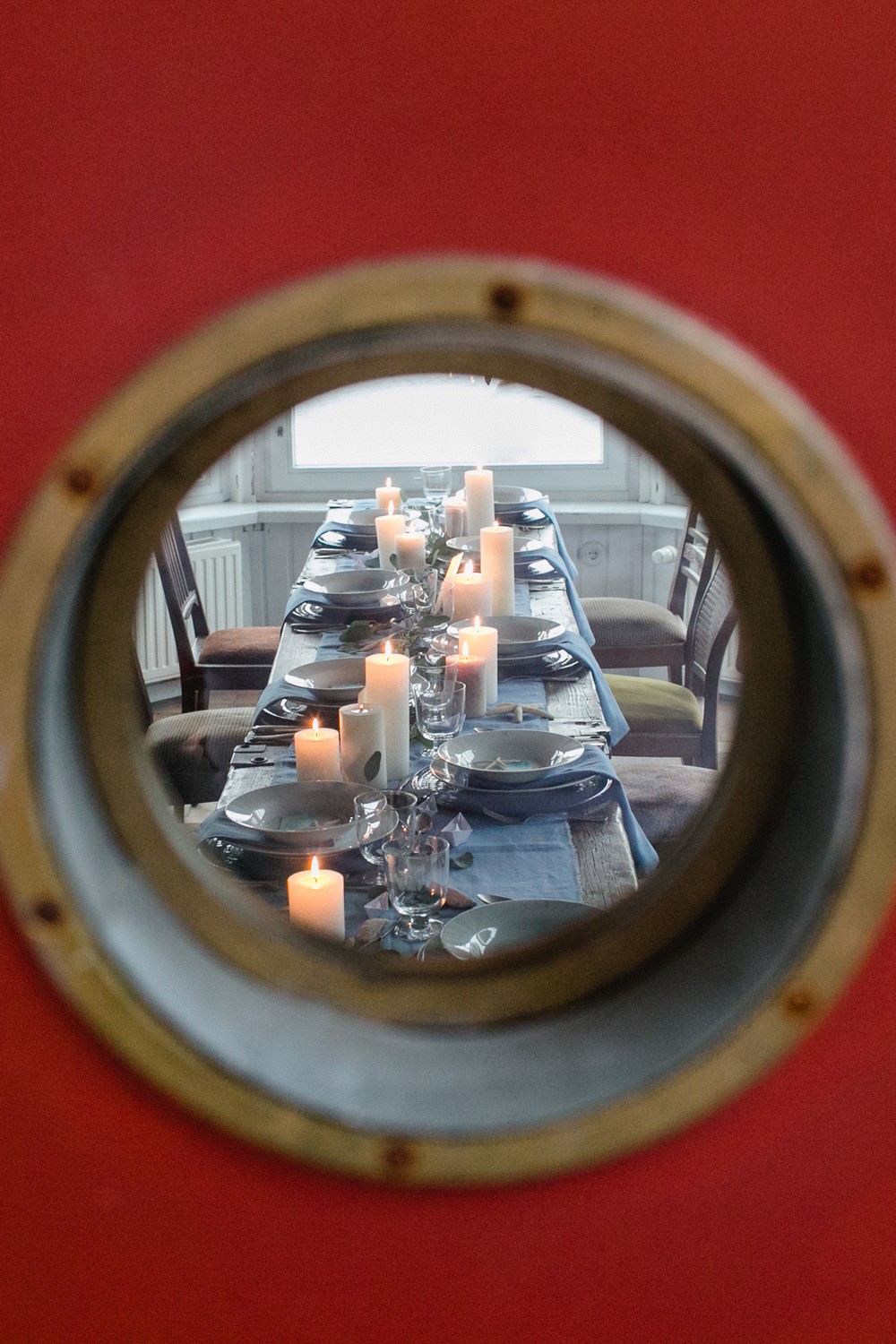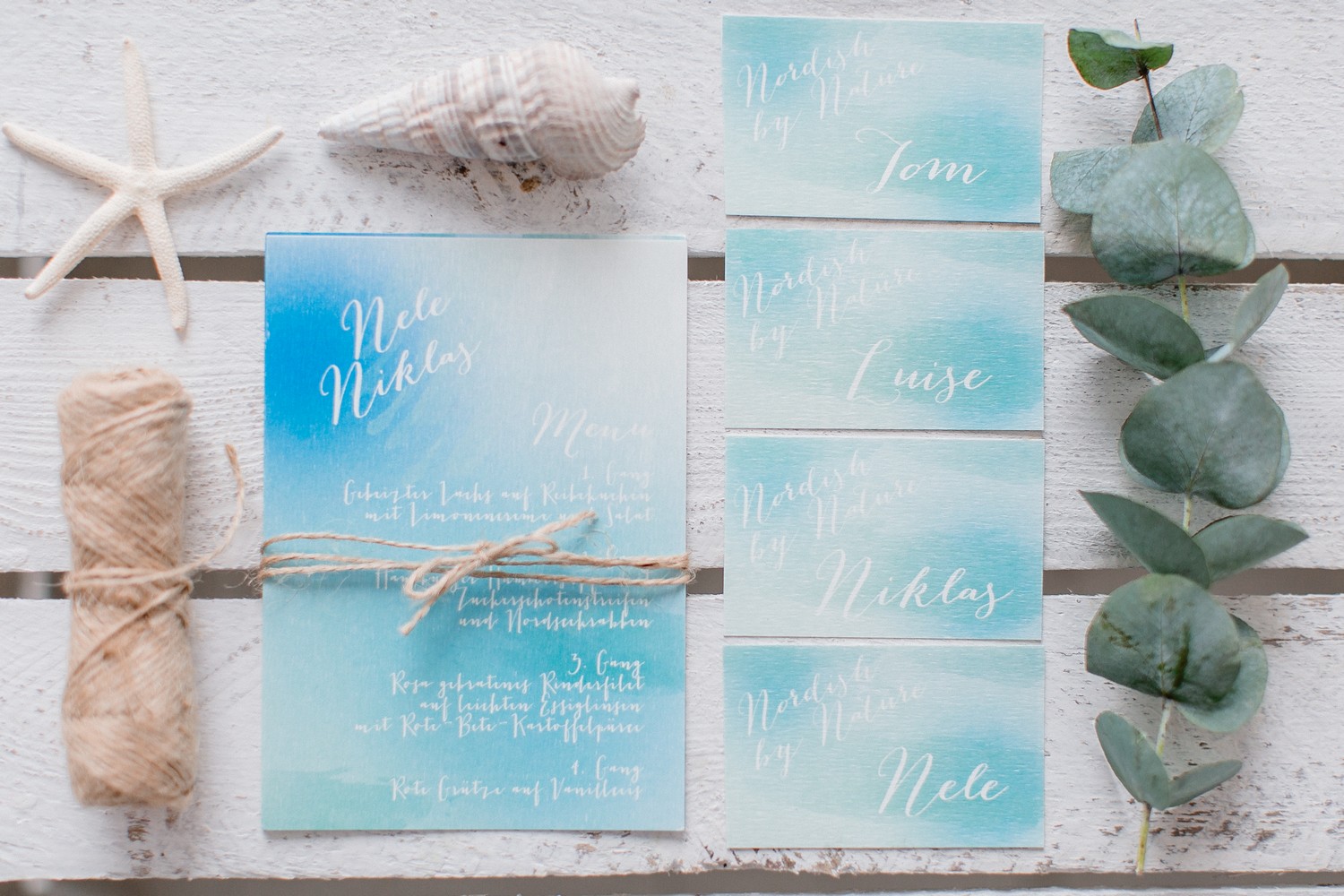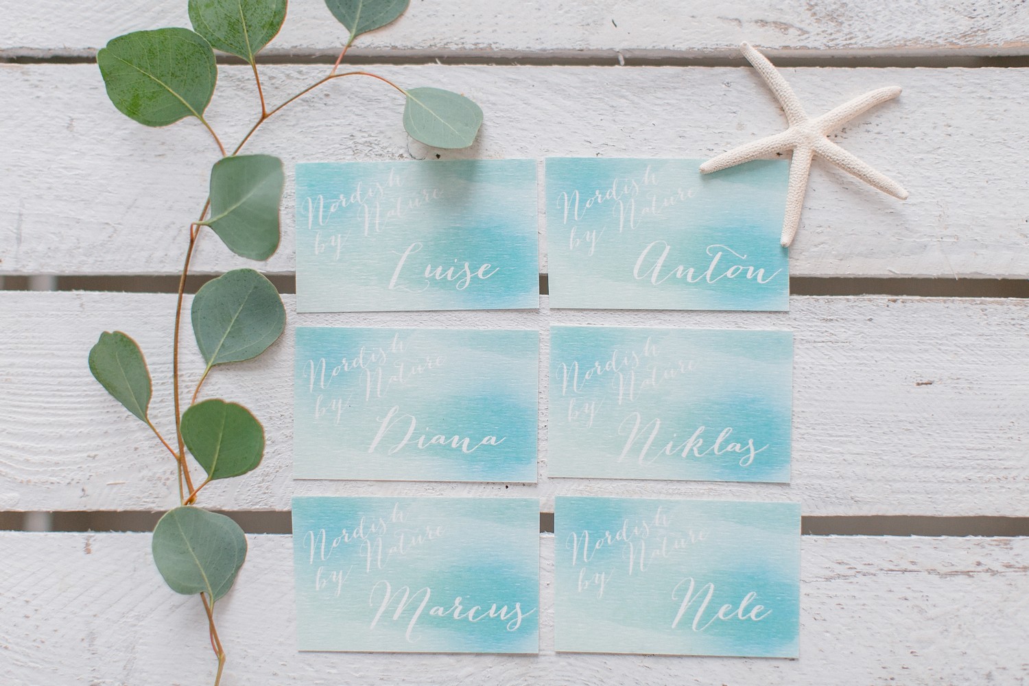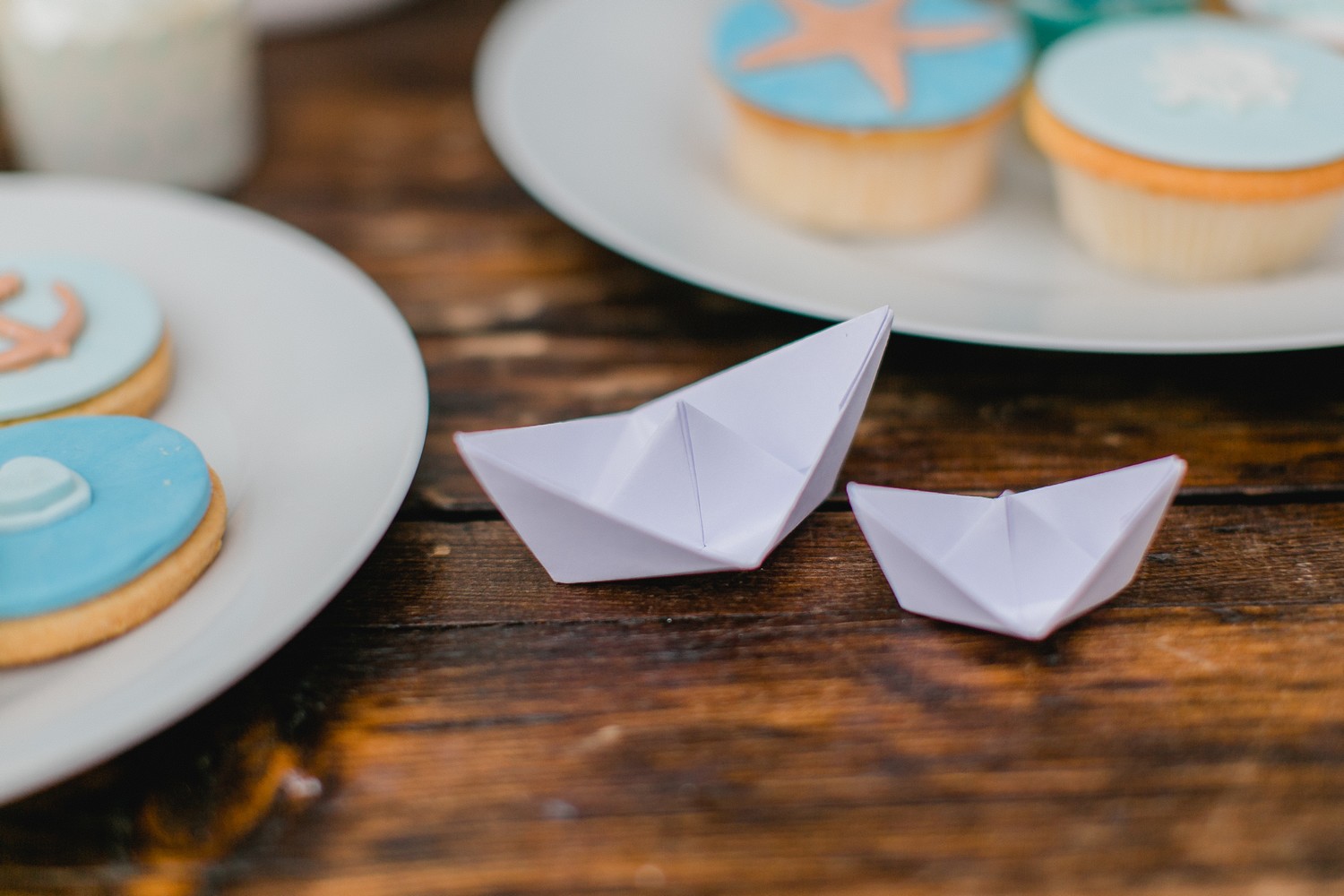 La décoration se veut minimaliste mais terriblement belle ! Le bois brut se marie avec un centre de table en lin bleu, partiellement décoré de bateaux en papier et de branches d’eucalyptus. Quelques étoiles de mer et des bougies blanches complètent une décoration de table douce et légère.