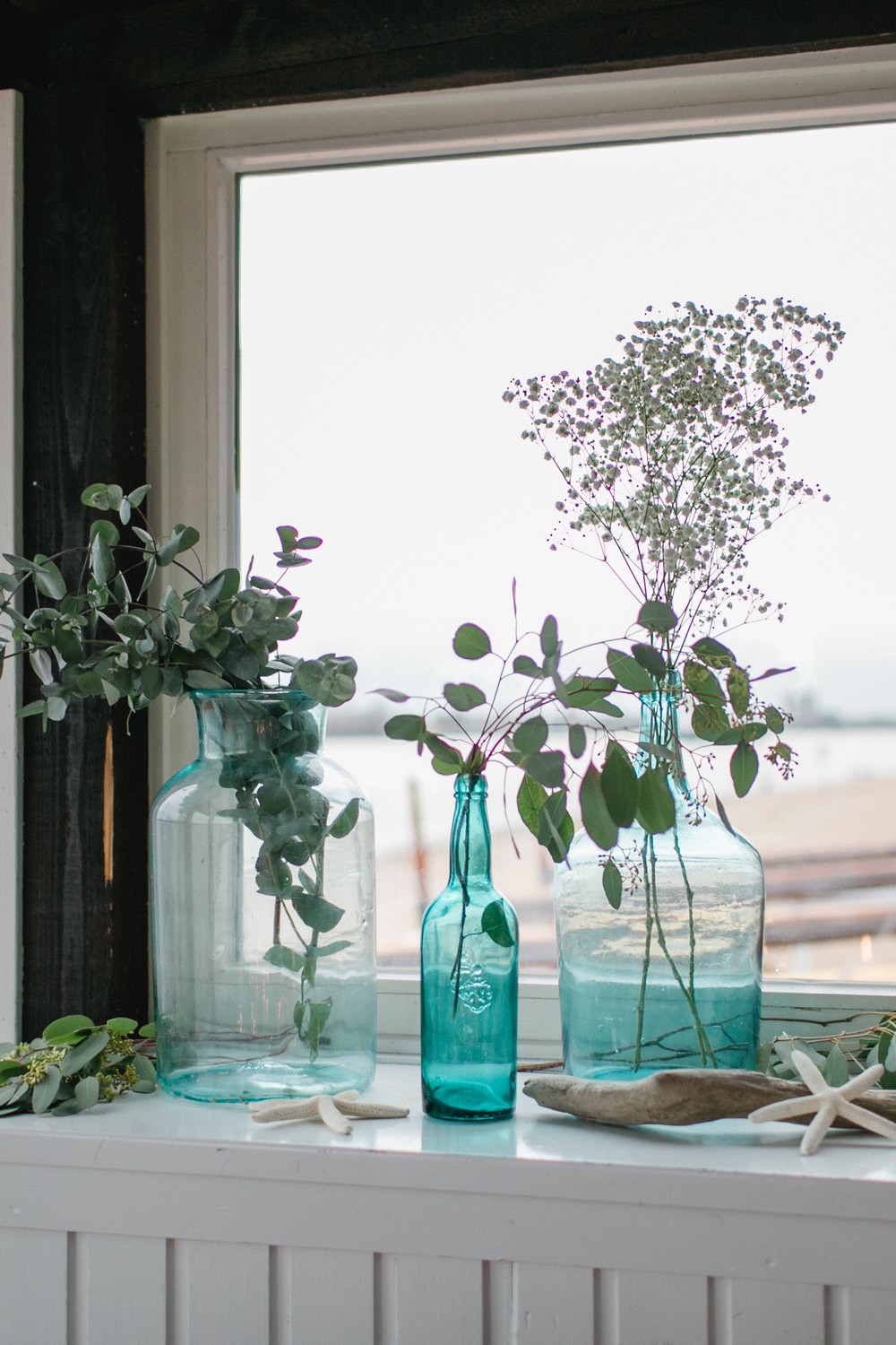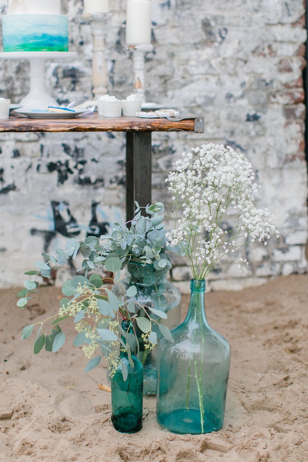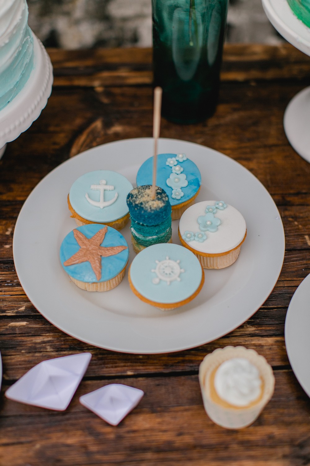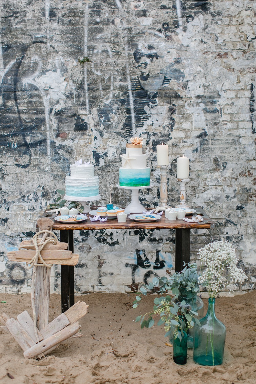 La décoration se veut minimaliste mais terriblement belle ! Le bois brut se marie avec un centre de table en lin bleu, partiellement décoré de bateaux en papier et de branches d’eucalyptus. Quelques étoiles de mer et des bougies blanches complètent une décoration de table douce et légère.