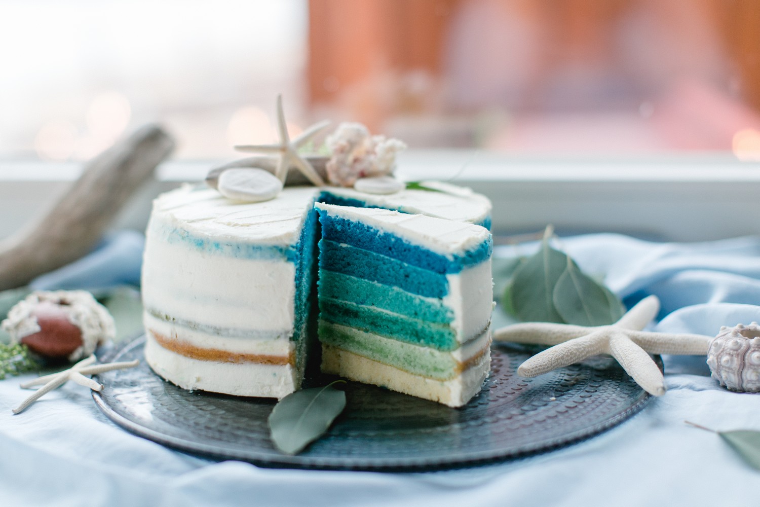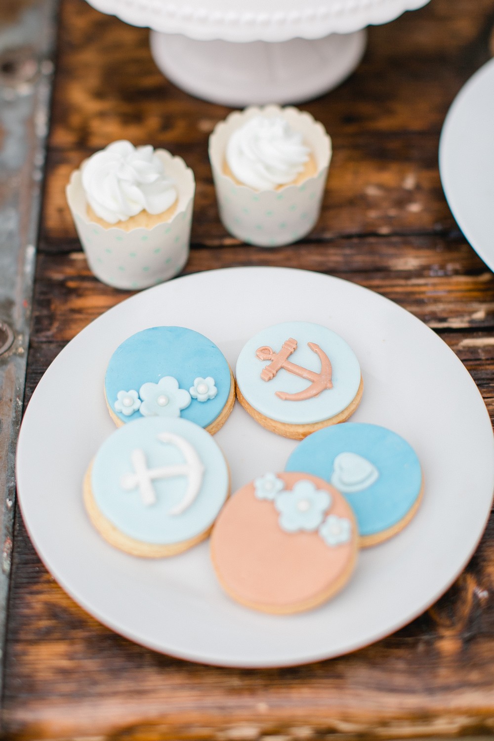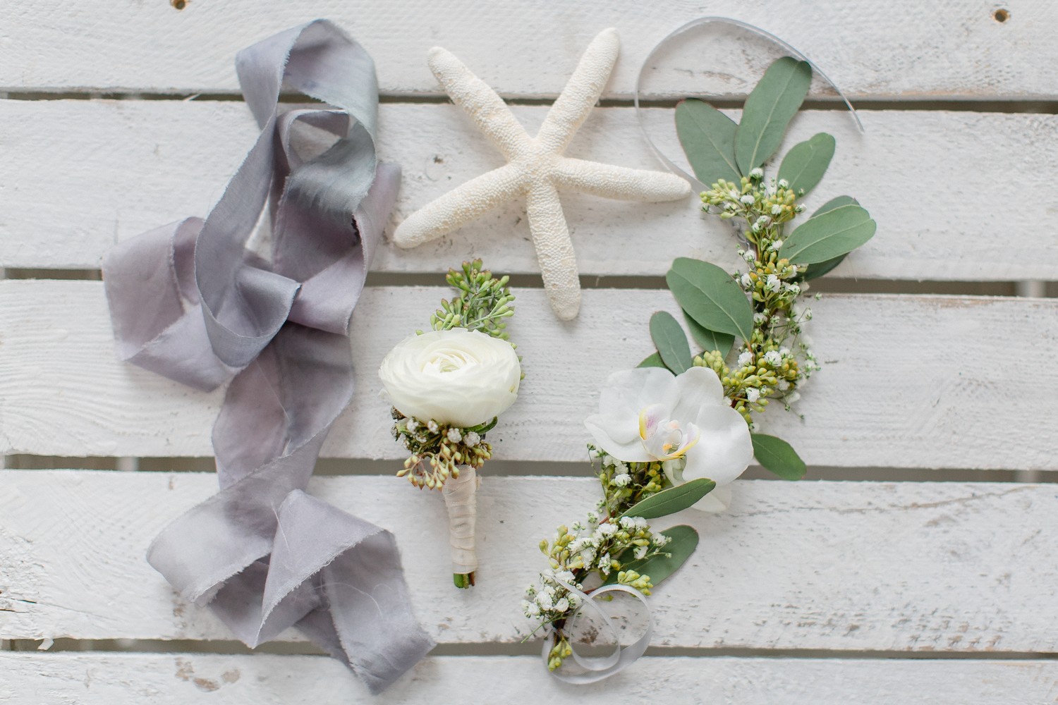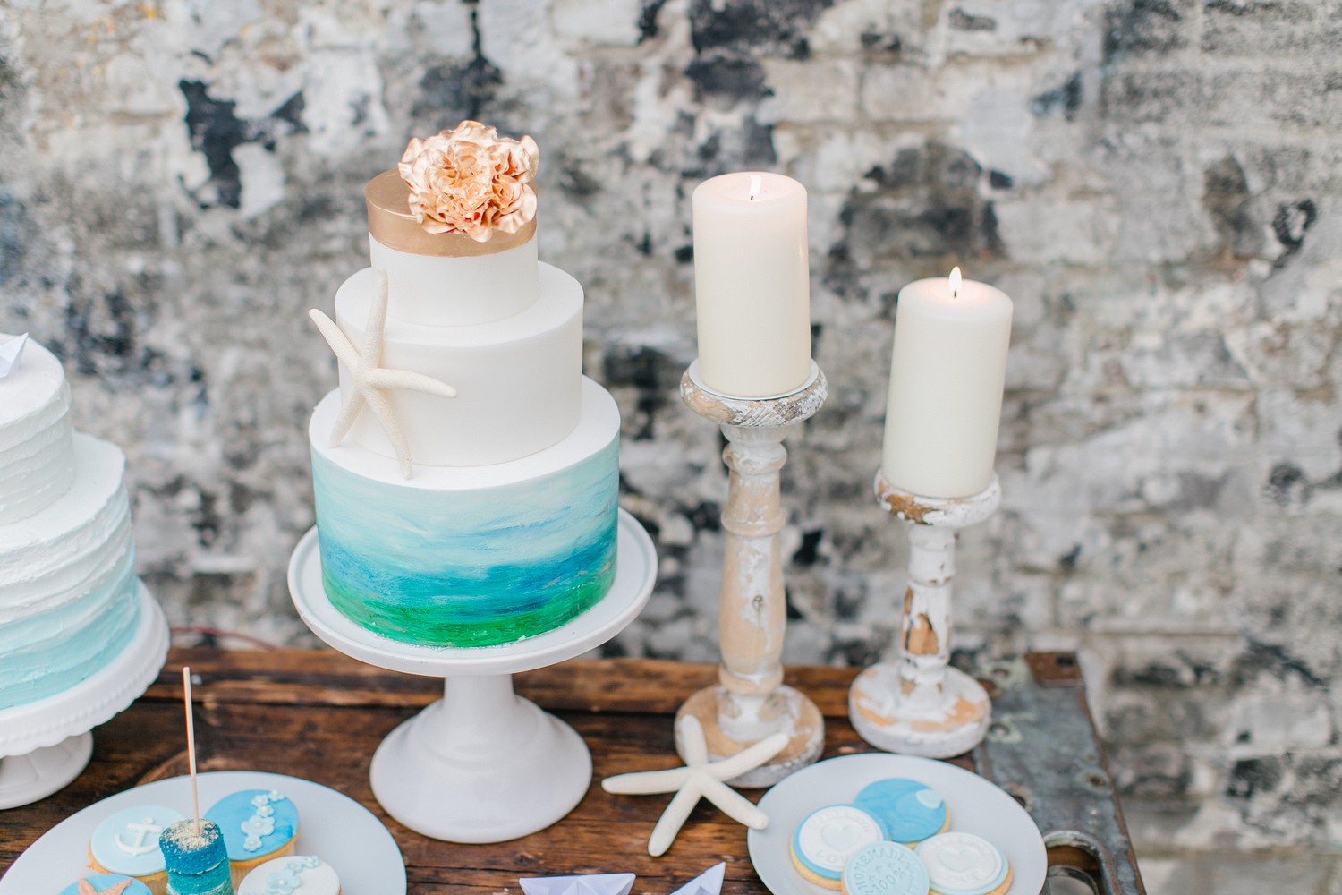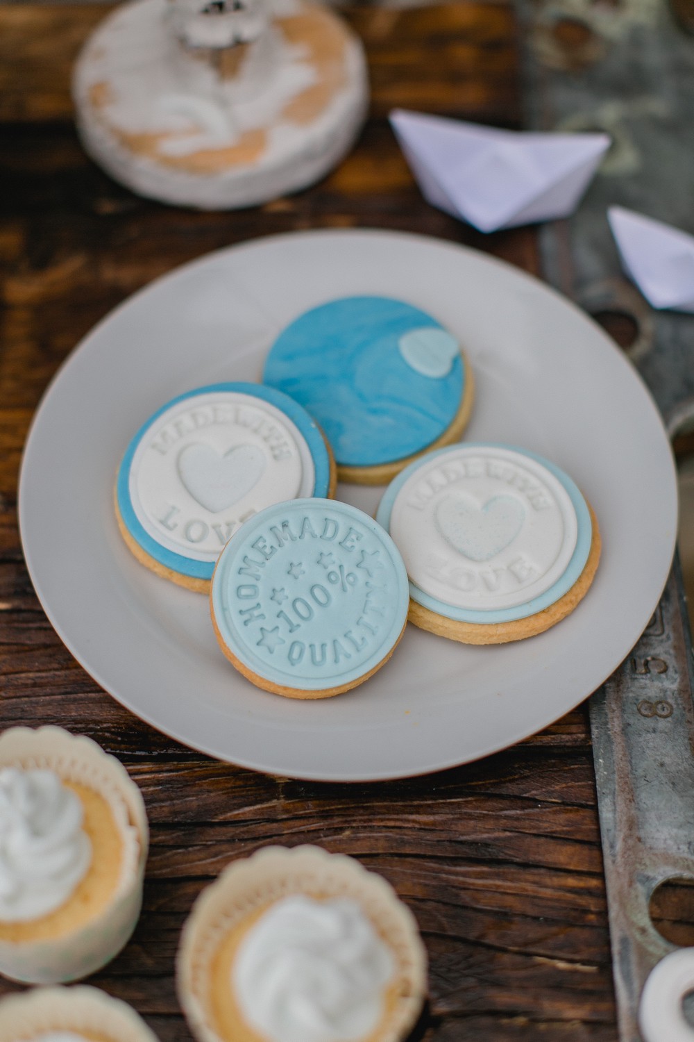 La décoration se veut minimaliste mais terriblement belle ! Le bois brut se marie avec un centre de table en lin bleu, partiellement décoré de bateaux en papier et de branches d’eucalyptus. Quelques étoiles de mer et des bougies blanches complètent une décoration de table douce et légère.