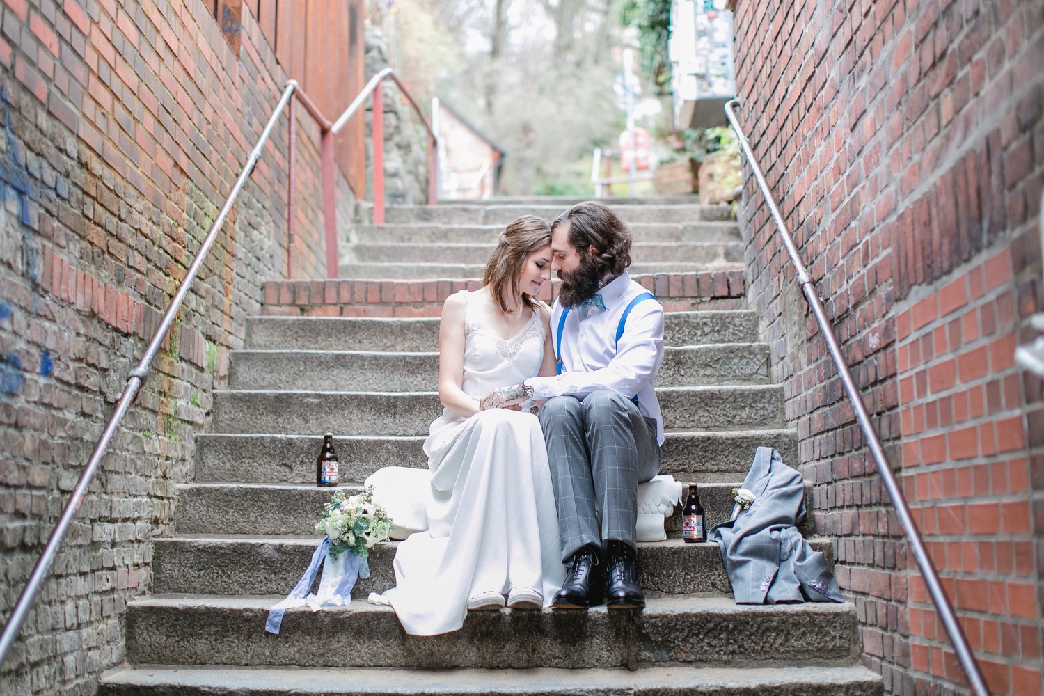 La simplicité est au rendez-vous avec une mariée au pied nus (ou en Converse !) avec les cheveux lâchés au vent. On y retrouve des accents naturels mêlés au mode de vie urbain, avec par exemple, un couple qui célèbre leur union à la bière (allemande, bien sûr !).
