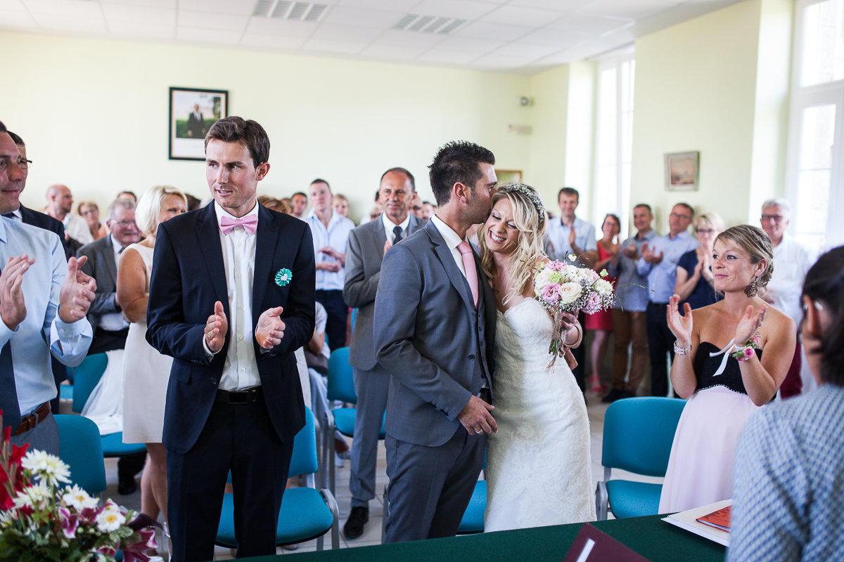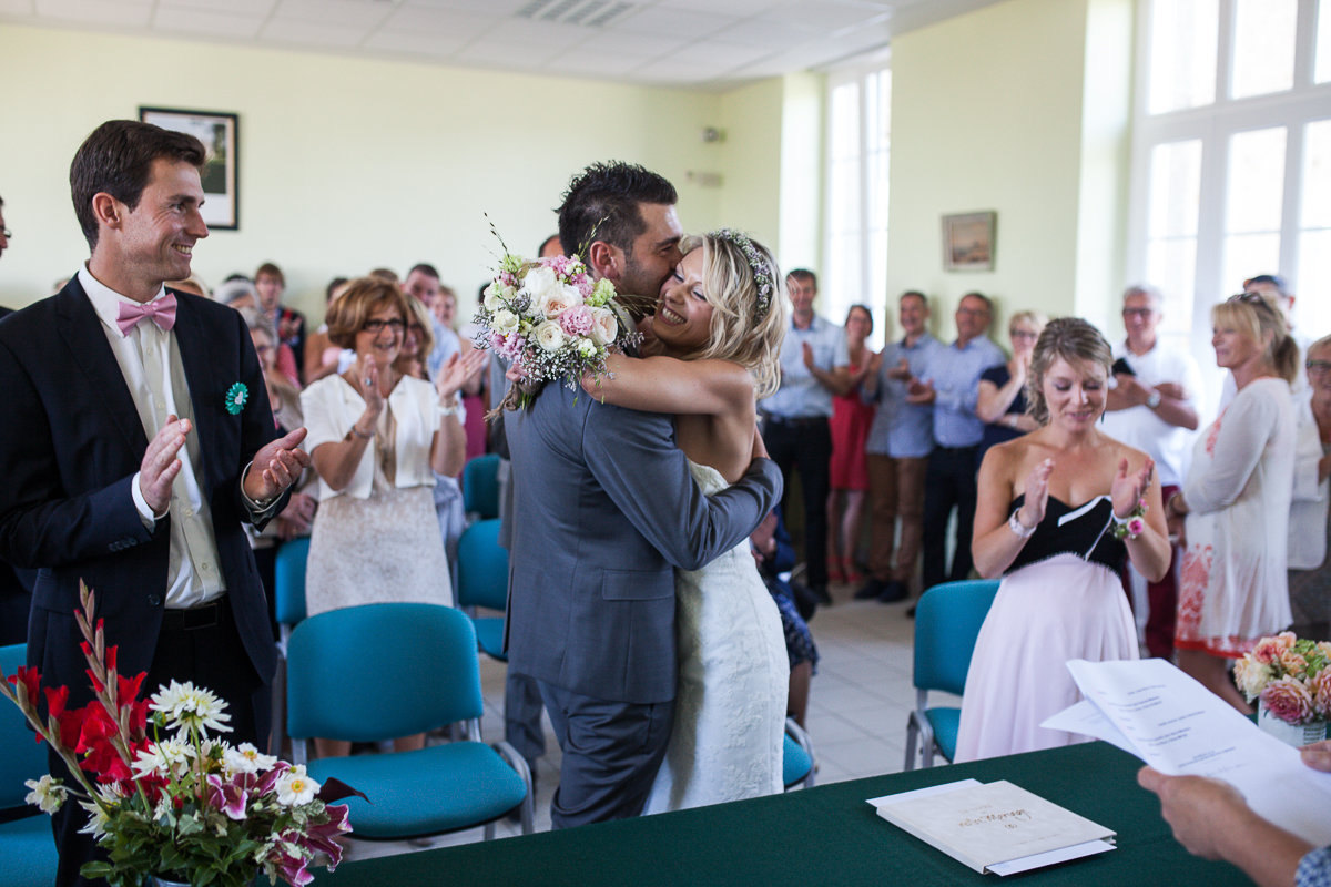 Julien avait deux témoins, dont un qui est DJ pour un groupe de musique. La veille du mariage, ce dernier jouait à Toulouse avec son groupe, il n’a pas pu être présent pour les préparatifs du marié. Il était prévu qu’il arrive à temps pour la cérémonie civile à la Mairie. Sauf que le moment venu, toujours pas de second témoin ! C’est donc un copain qui a dû prendre le relai et signer les registres à sa place en imitant sa signature ! Sans la présence des témoins annoncés dans notre dossier de mariage, le mariage ne pouvait être célébré, d’où cette improvisation de dernière minute. L’assemblée a beaucoup rigolé.