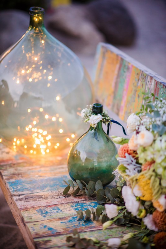 Mon coup de cœur ? Les guirlandes lumineuses dans les dames Jeanne qui les transforment en photophores romantiques ! Décoration idéale pour démarrer la soirée dans une ambiance cosy et chaleureuse.