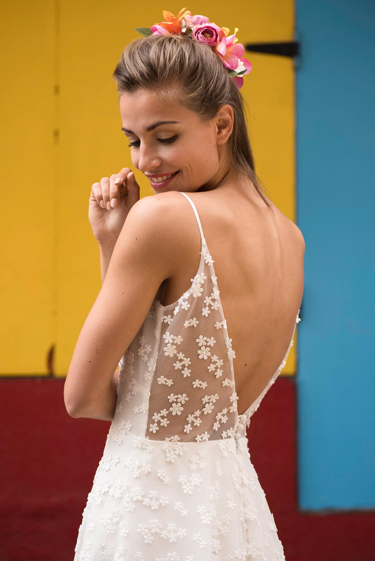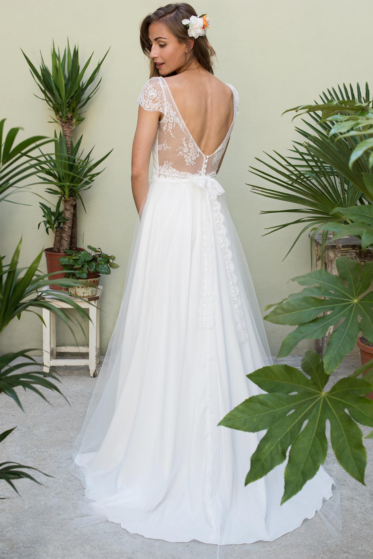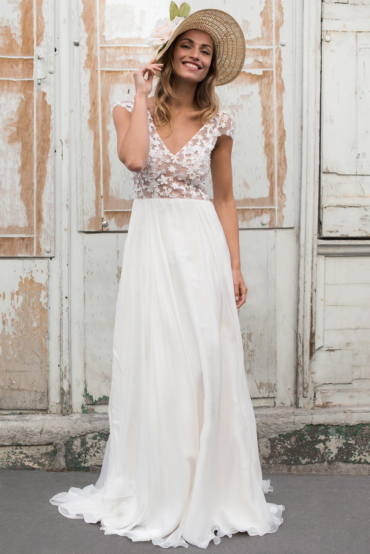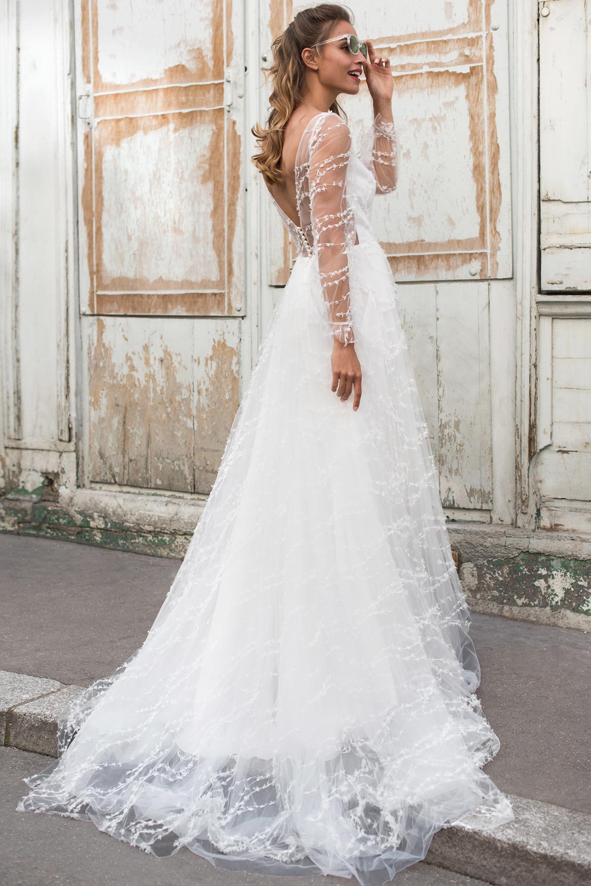 Pour cette collection 2018, la créatrice a imaginé de nouveaux modèles aux lignes vaporeuses et romanesques. Elle joue avec les transparences et les drapés. Ses matières fétiches ? La mousseline, les organzas de soie, les dentelles. Les dos sont nus ou juste habillés d’une dentelle fine ou d’un voile. Les tulles sont rebrodés de parures fleuries pour apporter un peu de fantaisie. Marie Laporte ne s’embarrasse ni des codes de la mode ni de froufrous. Ses créations sont le fruit des envies des mariées qu’elle a pu déjà rencontrer et de sa relation avec le tissu.