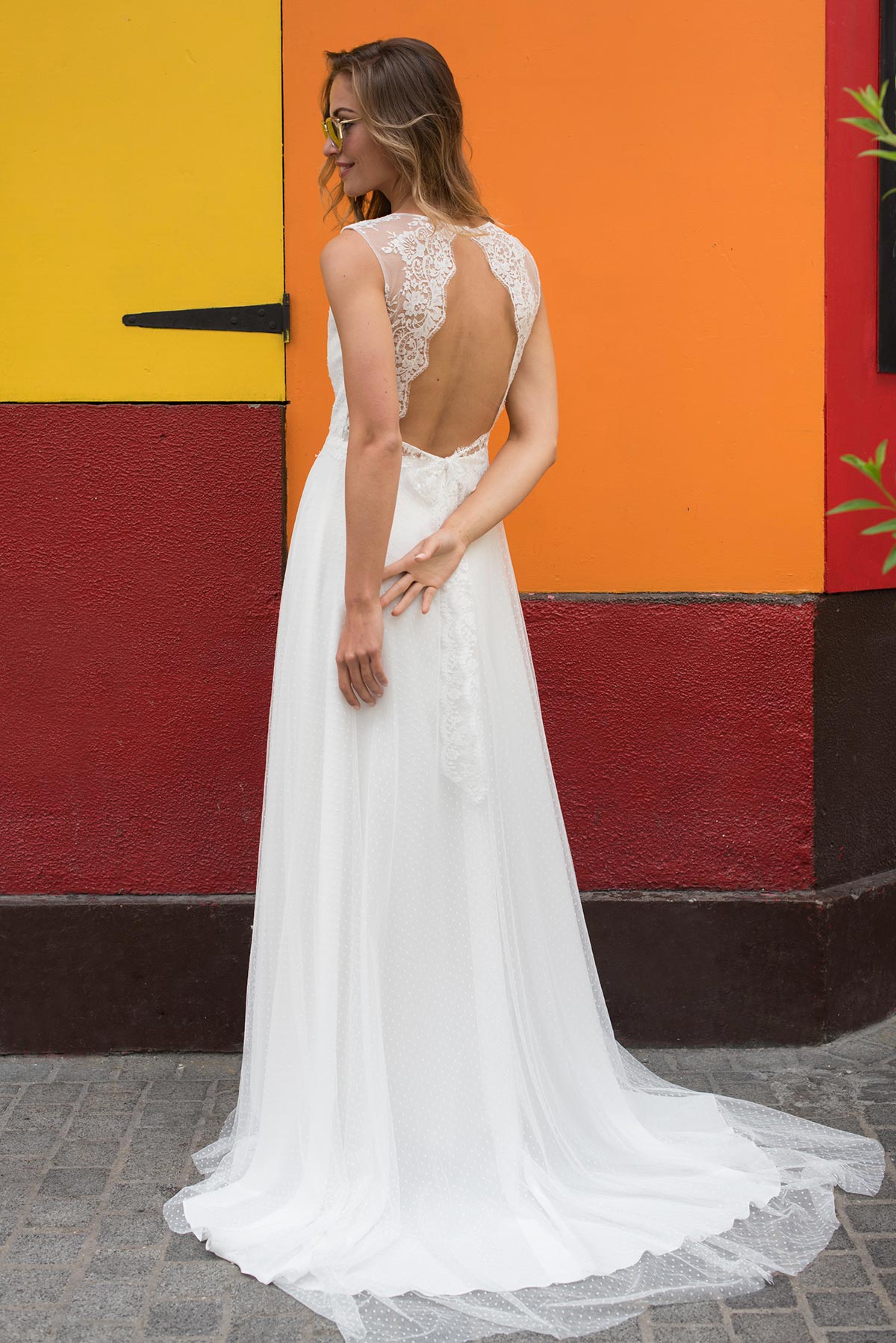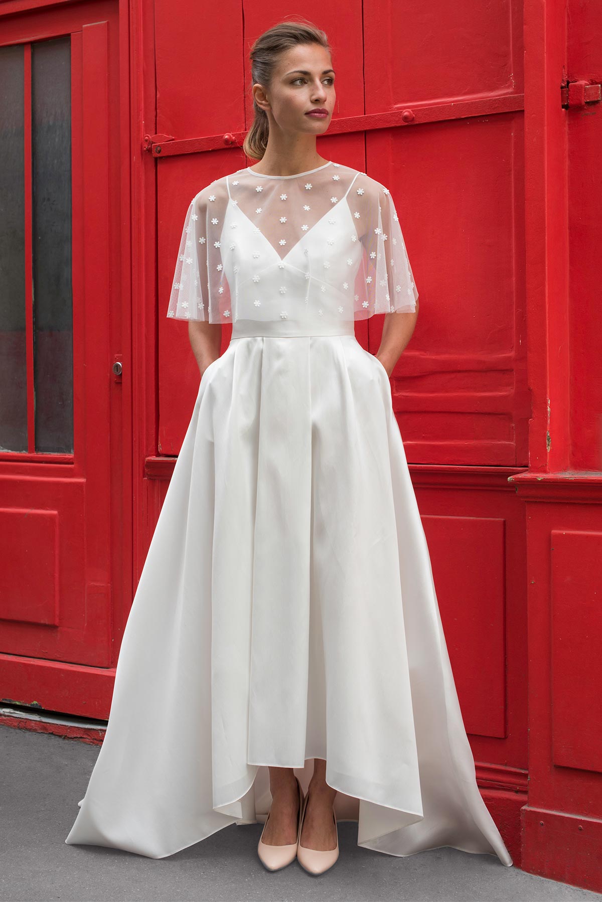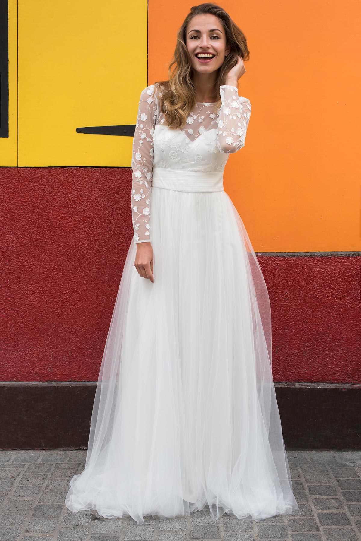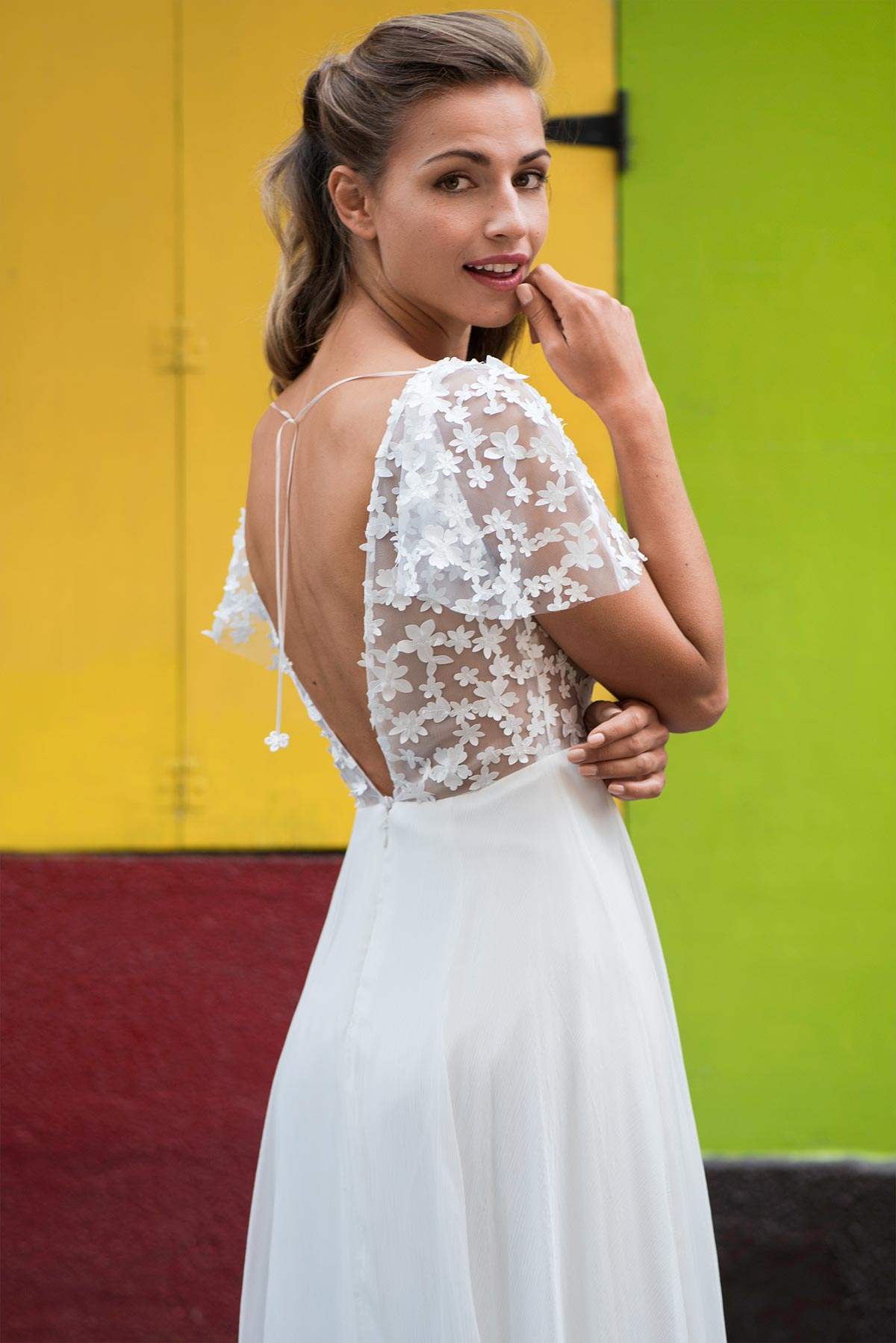 Pour cette collection 2018, la créatrice a imaginé de nouveaux modèles aux lignes vaporeuses et romanesques. Elle joue avec les transparences et les drapés. Ses matières fétiches ? La mousseline, les organzas de soie, les dentelles. Les dos sont nus ou juste habillés d’une dentelle fine ou d’un voile. Les tulles sont rebrodés de parures fleuries pour apporter un peu de fantaisie. Marie Laporte ne s’embarrasse ni des codes de la mode ni de froufrous. Ses créations sont le fruit des envies des mariées qu’elle a pu déjà rencontrer et de sa relation avec le tissu.