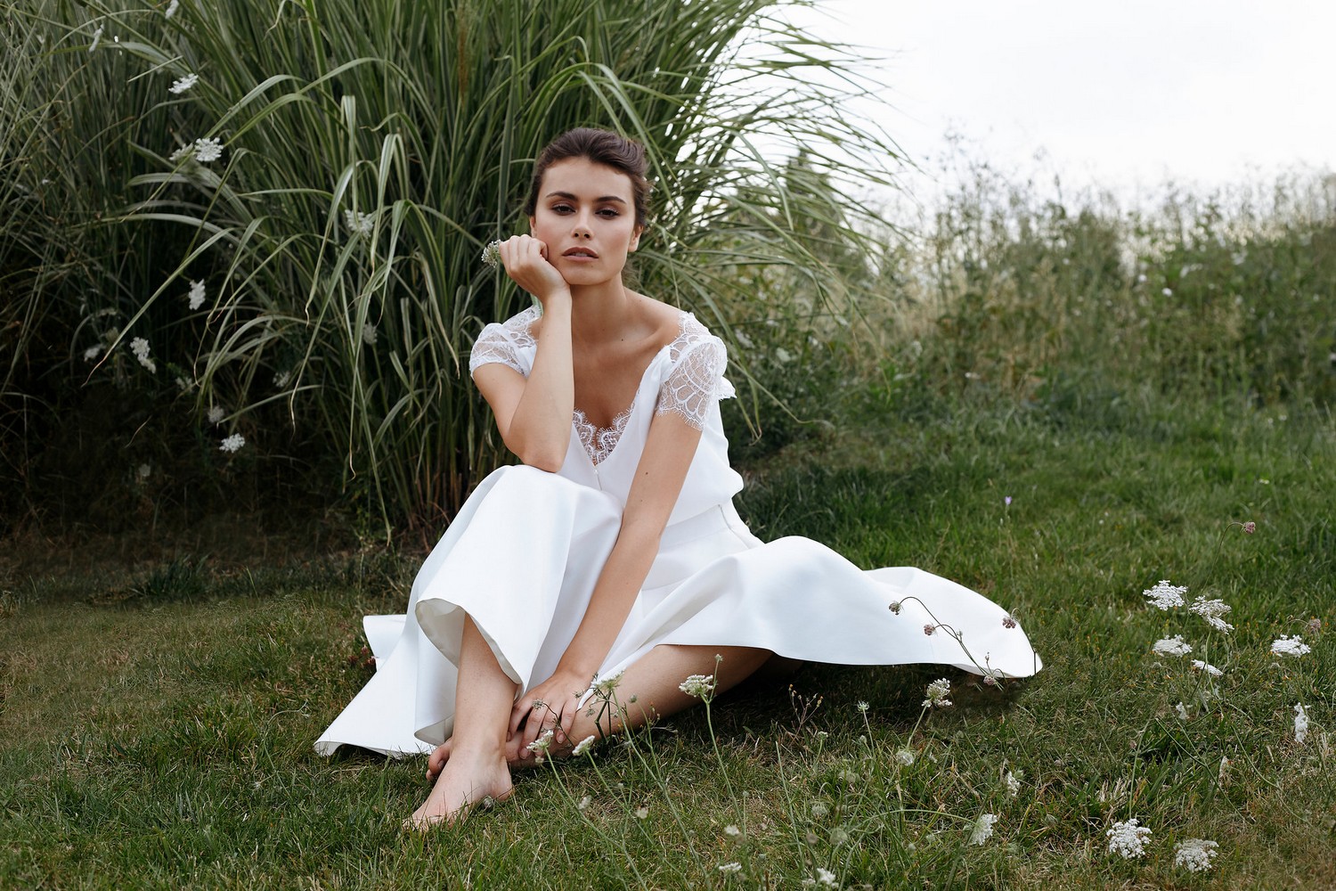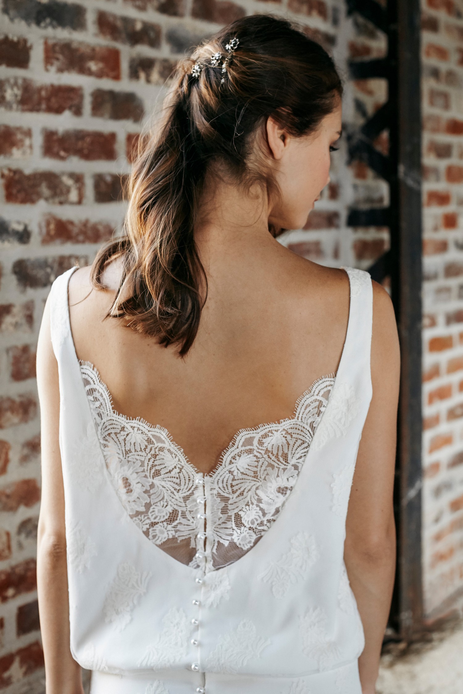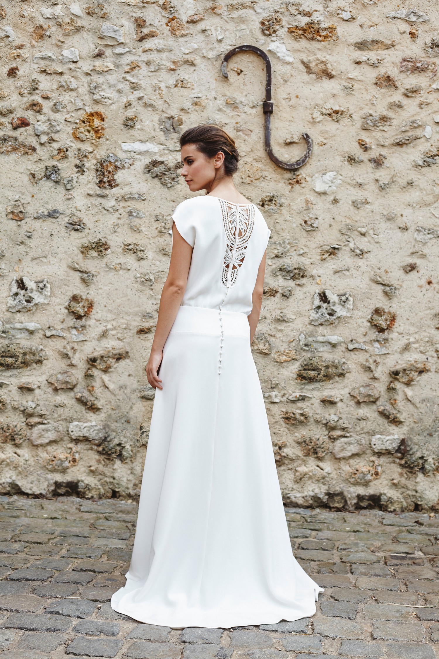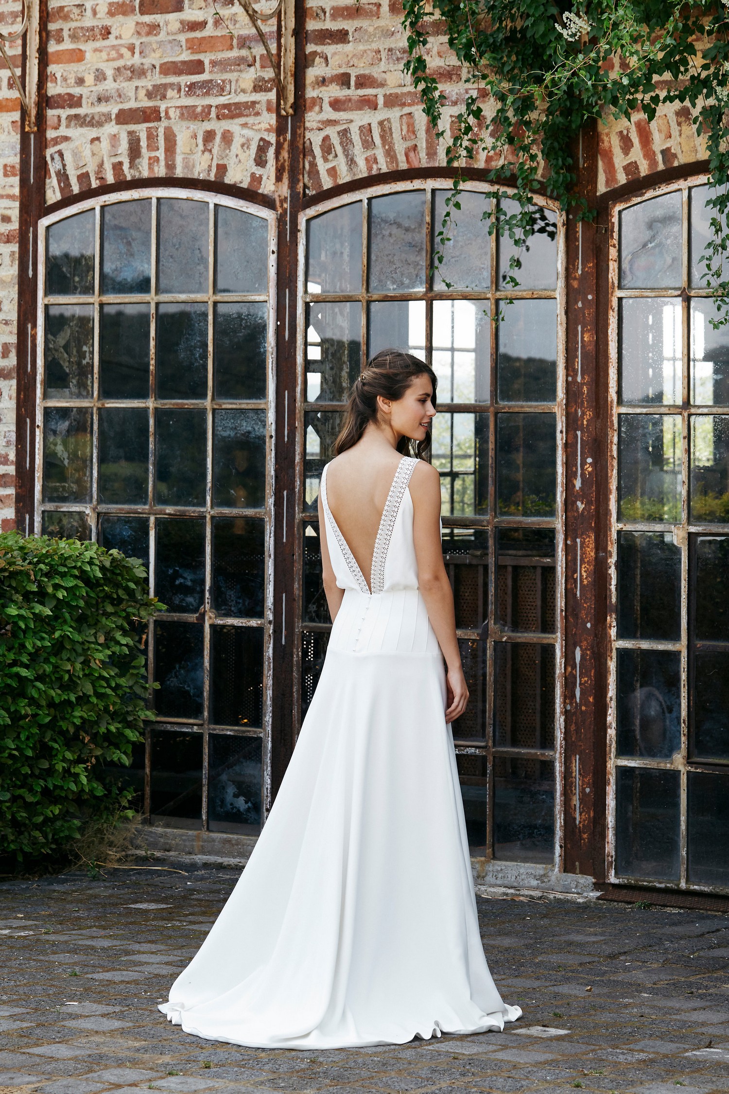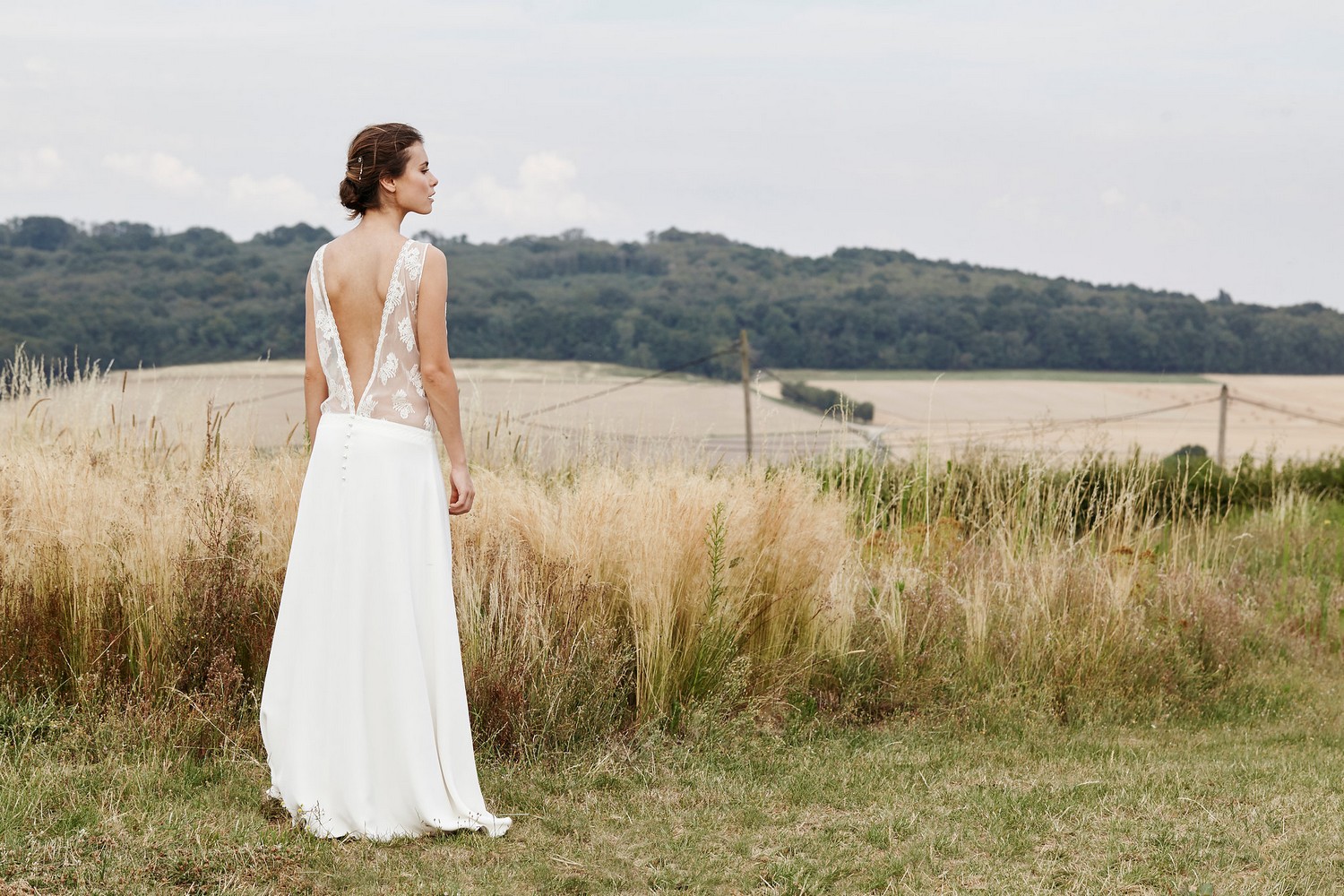 Pour cette collection 2018, mon cœur a chaviré de nombreuses fois, cependant j’ai eu un coup de foudre pour le modèle « Jeanne ». J’adore la taille haute sublimée par une rangée de petits boutons et ce dos nu en V, très élégant, sans en dévoiler trop, offre à la robe une délicate élégance.