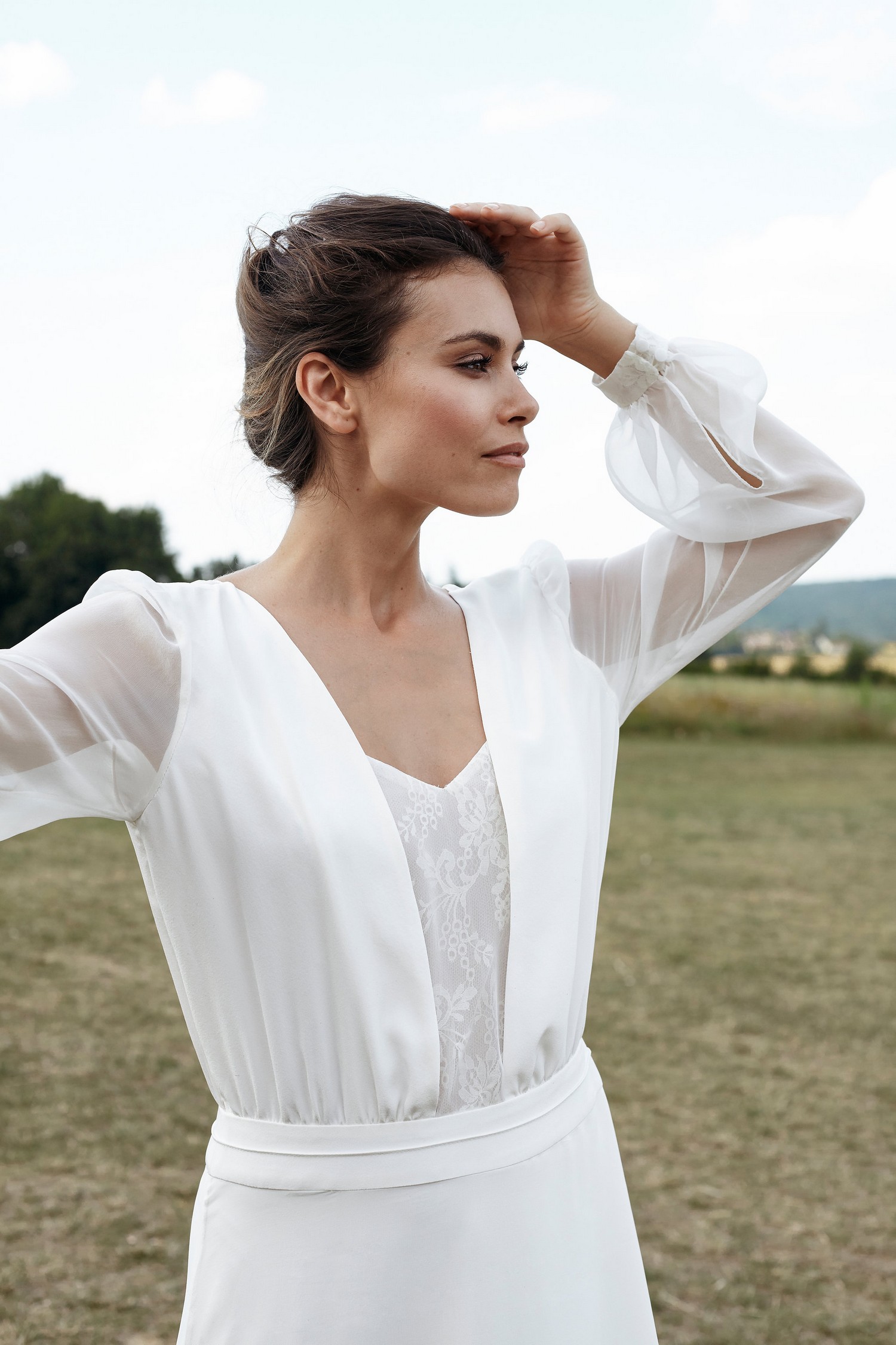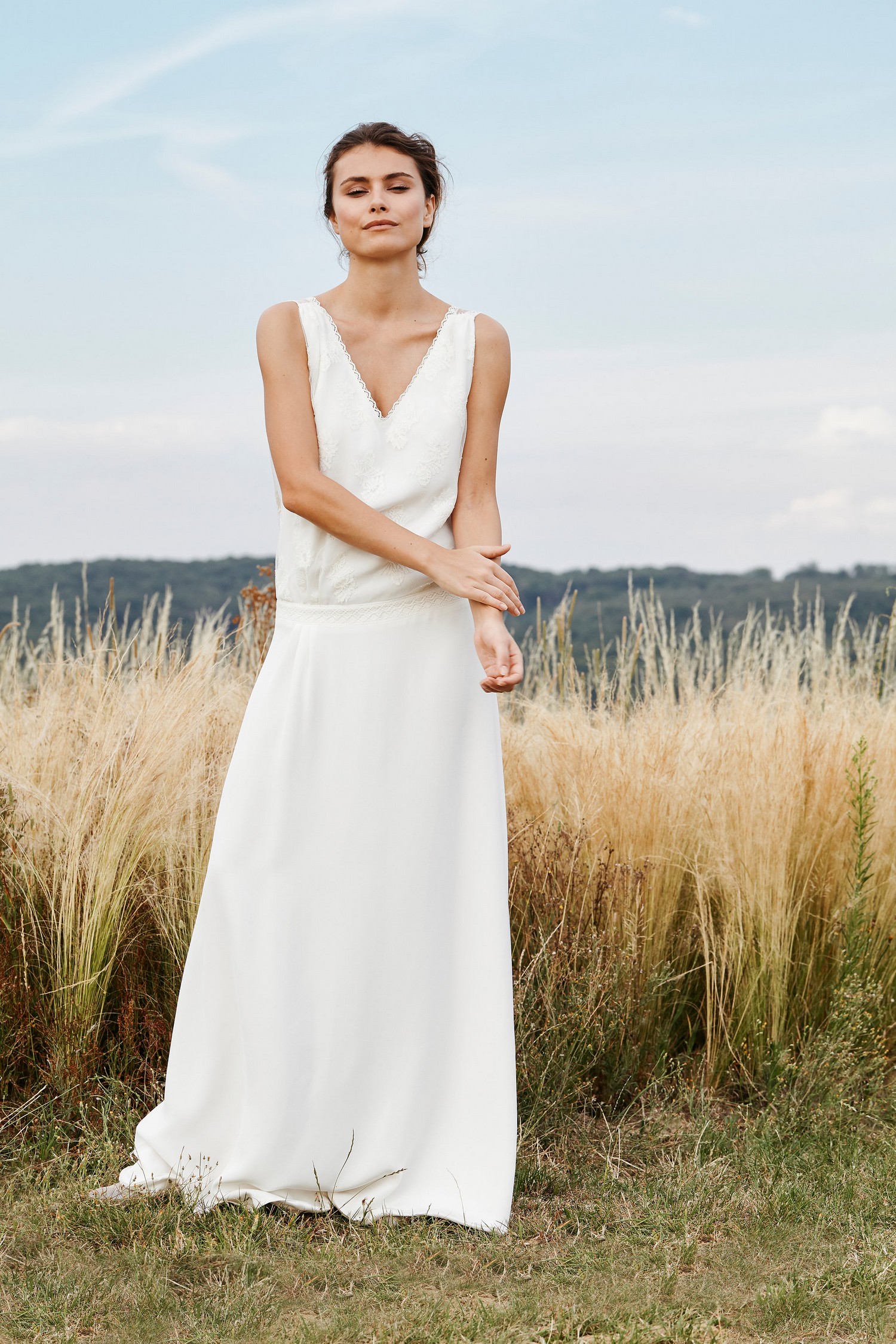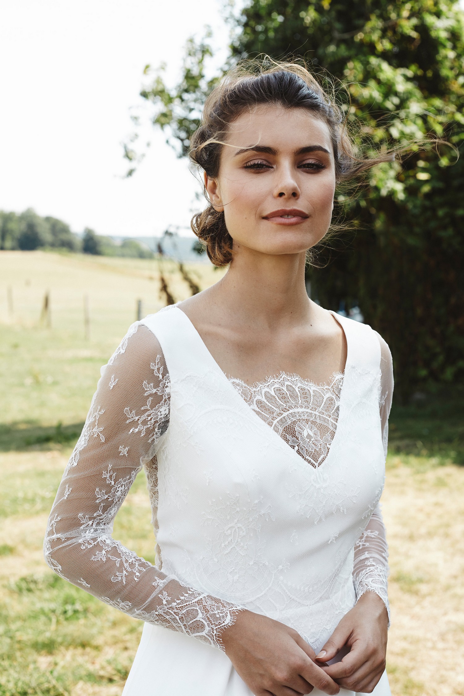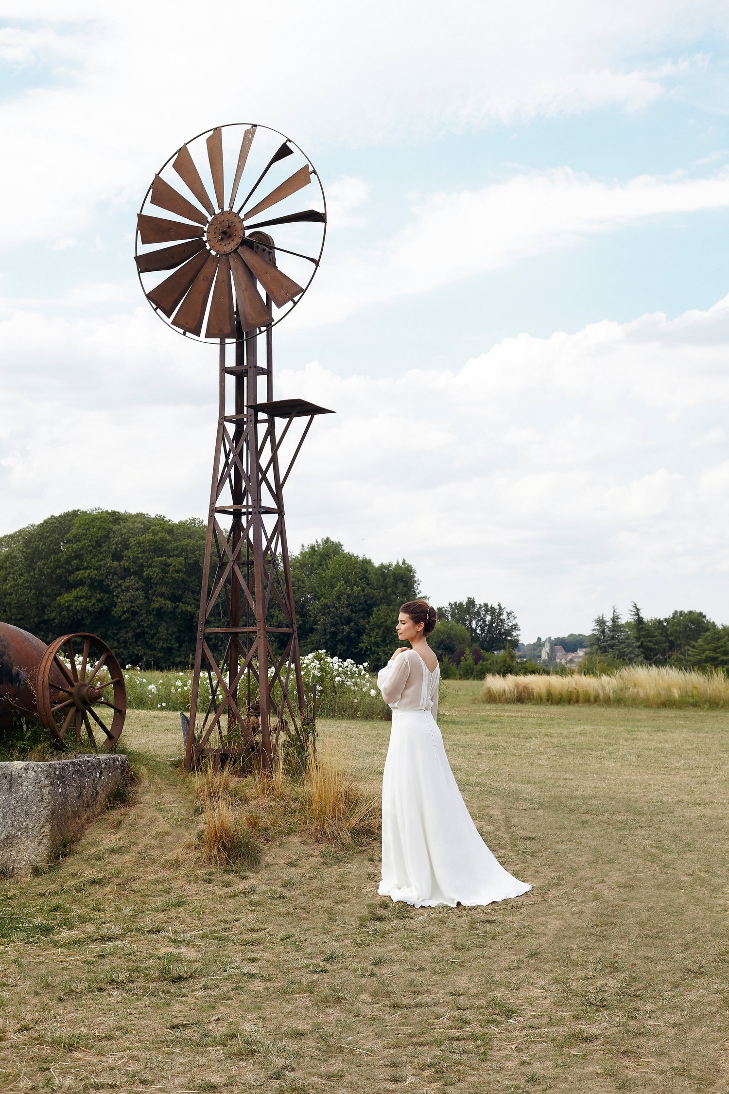 Bohème, on retrouvera dans ses nouvelles robes de mariées des manches bouffantes, des tops blousés, des jupes au drapé moderne, des dos nu et des dentelles graphiques. Les détails subtils d’autrefois se mêlent au goût d’aujourd’hui pour des robes de mariée à la fluidité légère et aux lignes épurées, véritable signature de Mathilde Marie.