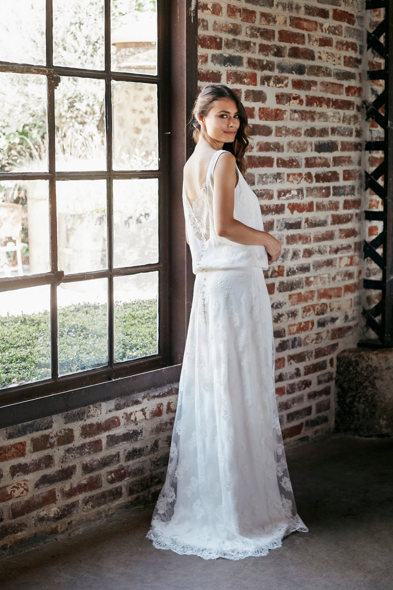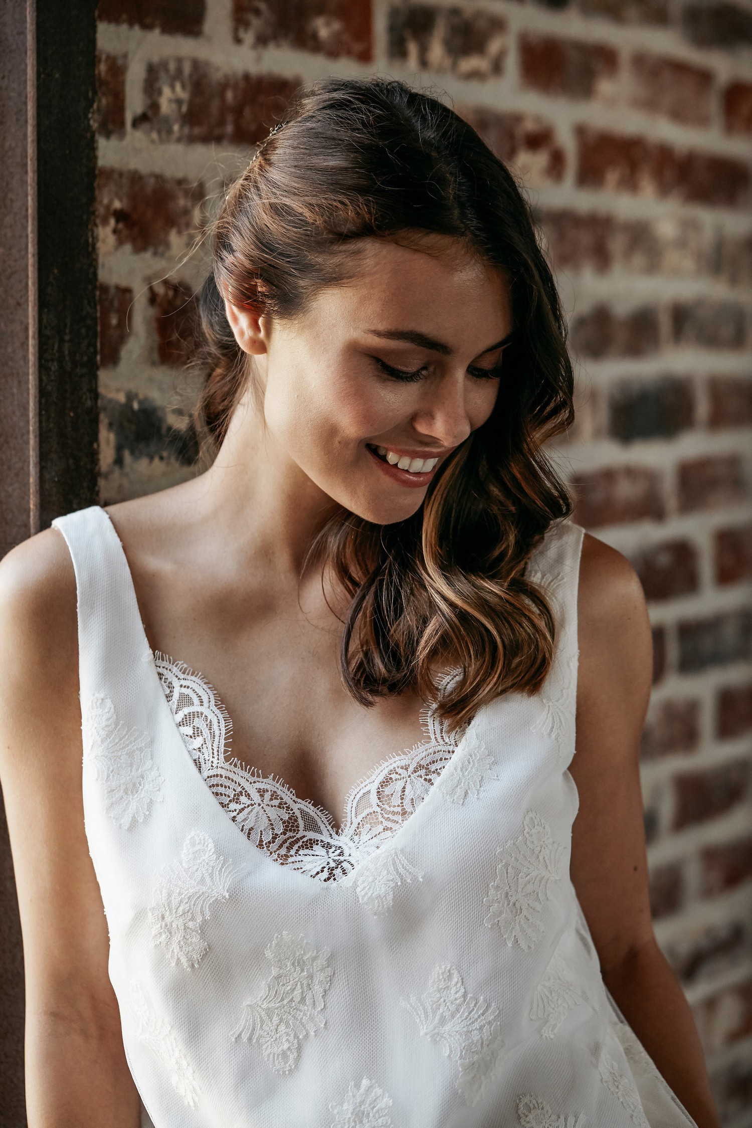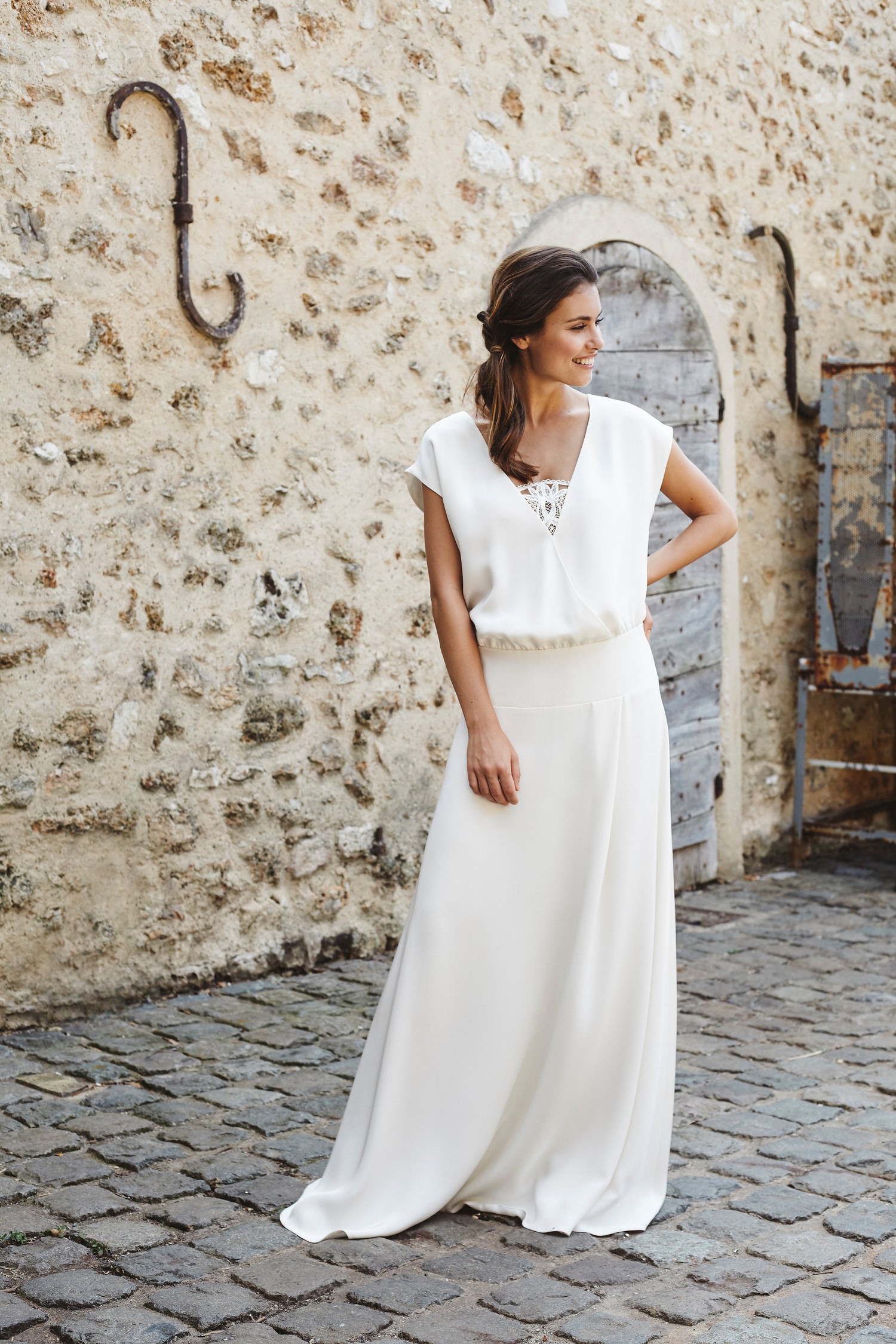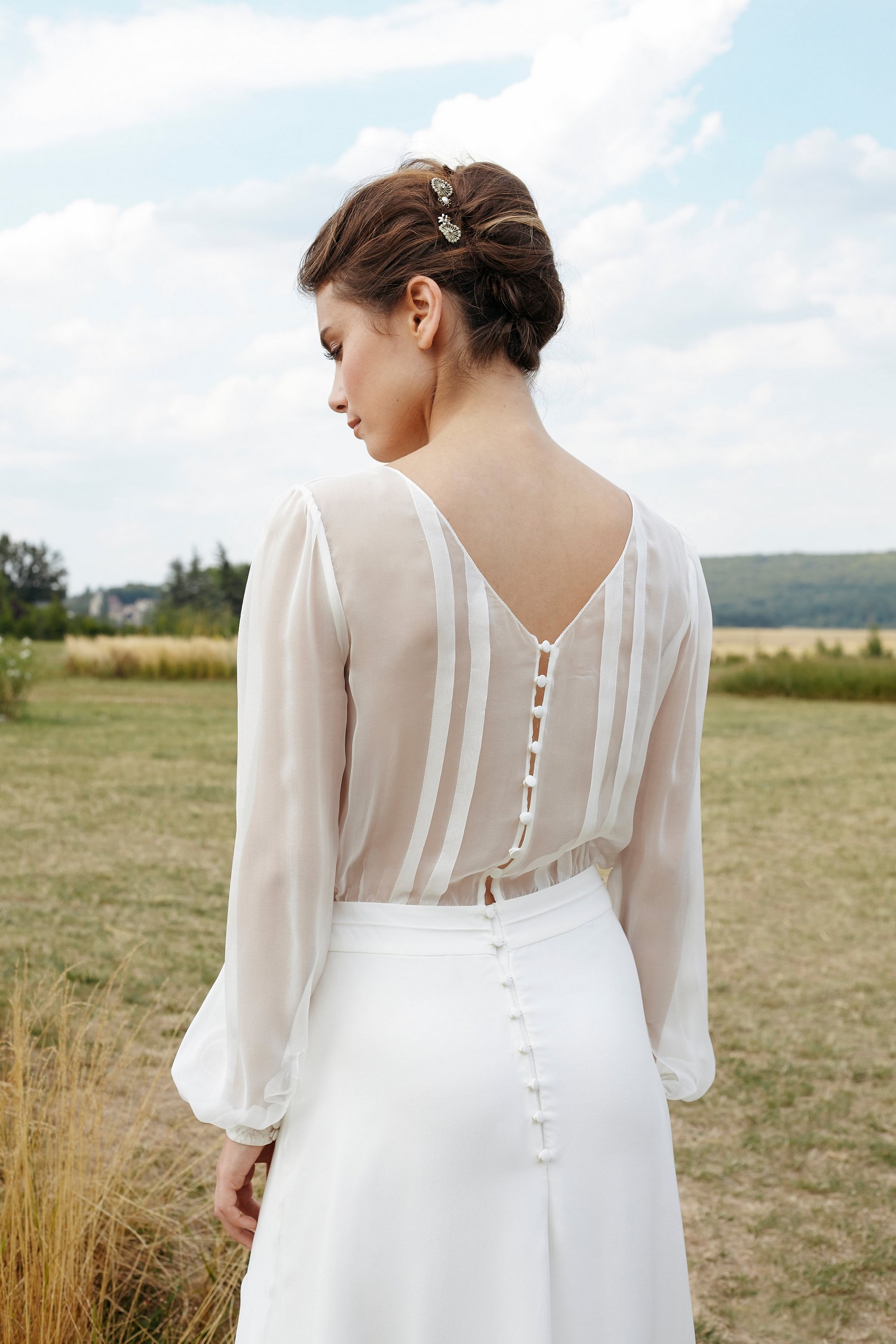 Bohème, on retrouvera dans ses nouvelles robes de mariées des manches bouffantes, des tops blousés, des jupes au drapé moderne, des dos nu et des dentelles graphiques. Les détails subtils d’autrefois se mêlent au goût d’aujourd’hui pour des robes de mariée à la fluidité légère et aux lignes épurées, véritable signature de Mathilde Marie.