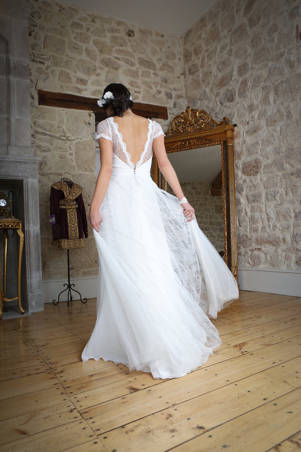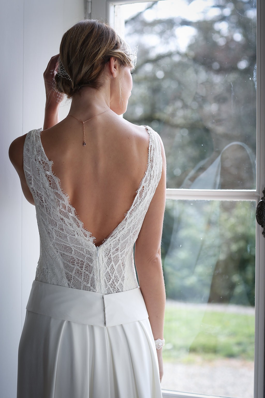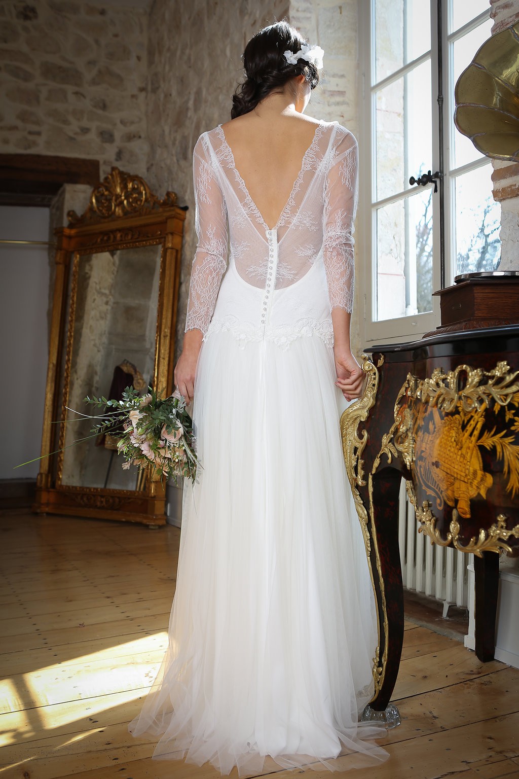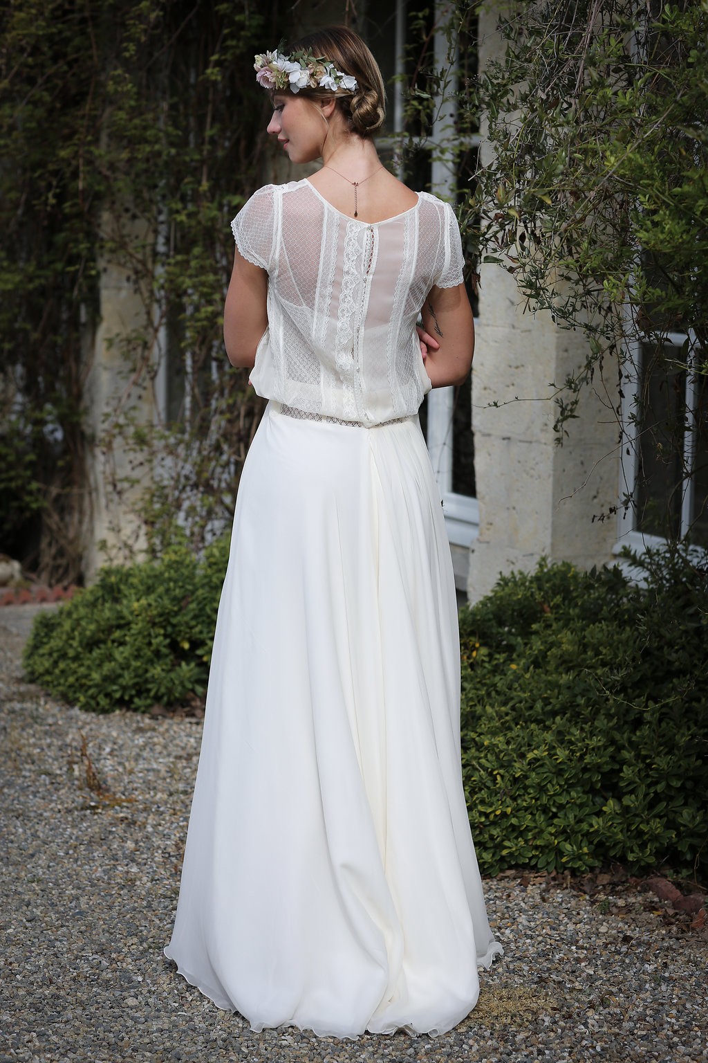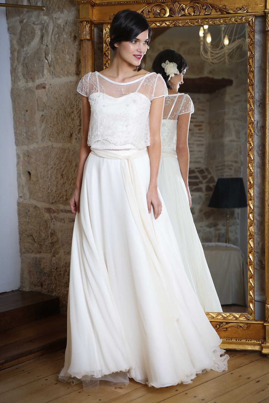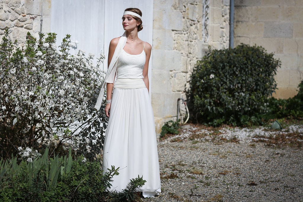 Cette année, la grande nouveauté est l’adaptabilité des robes ! Les créations se parent de manches amovibles pour les mariées d’hiver ou bien de tops, reportables après le mariage pour la vie quotidienne. Comme par exemple, le modèle Améthyste composée d’une robe près du corps un brin sexy qui se transforme en une création bohème avec son top transparent et ample.