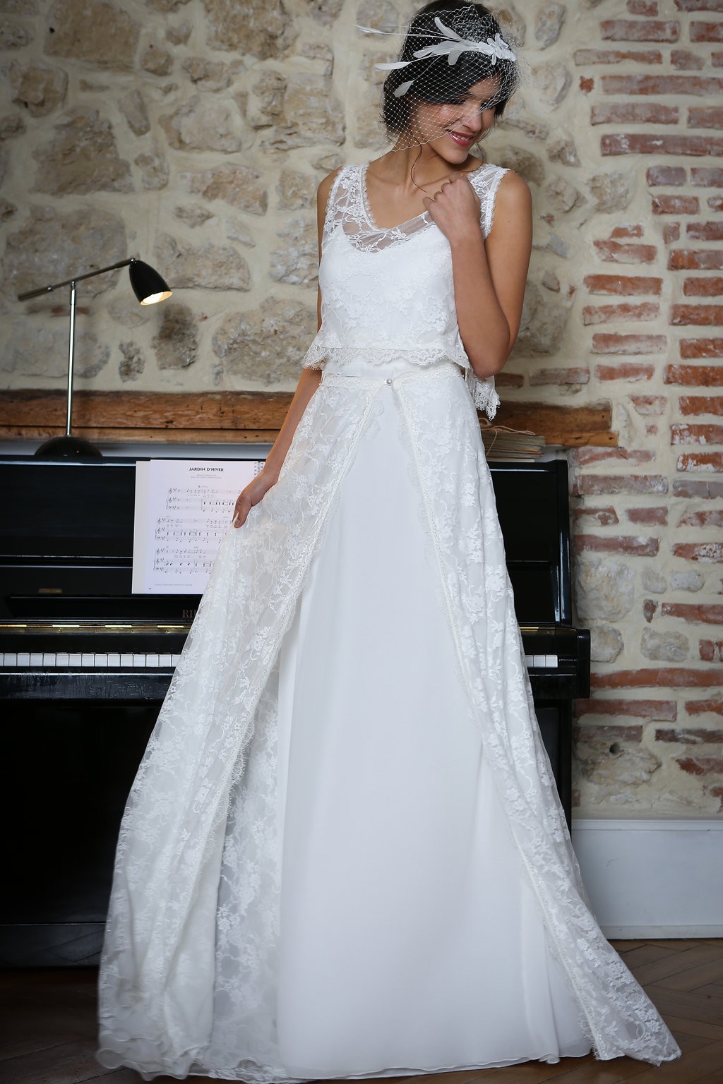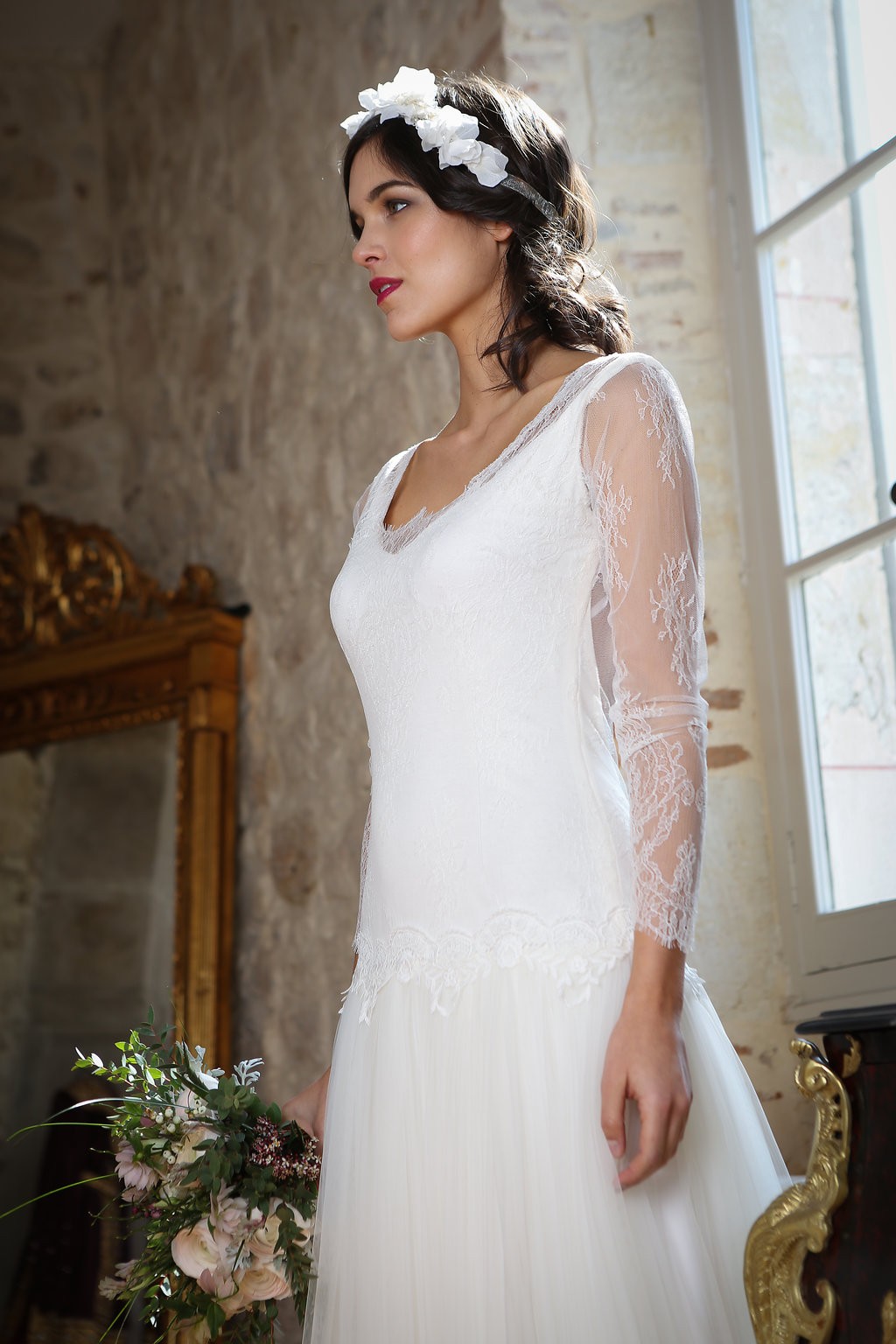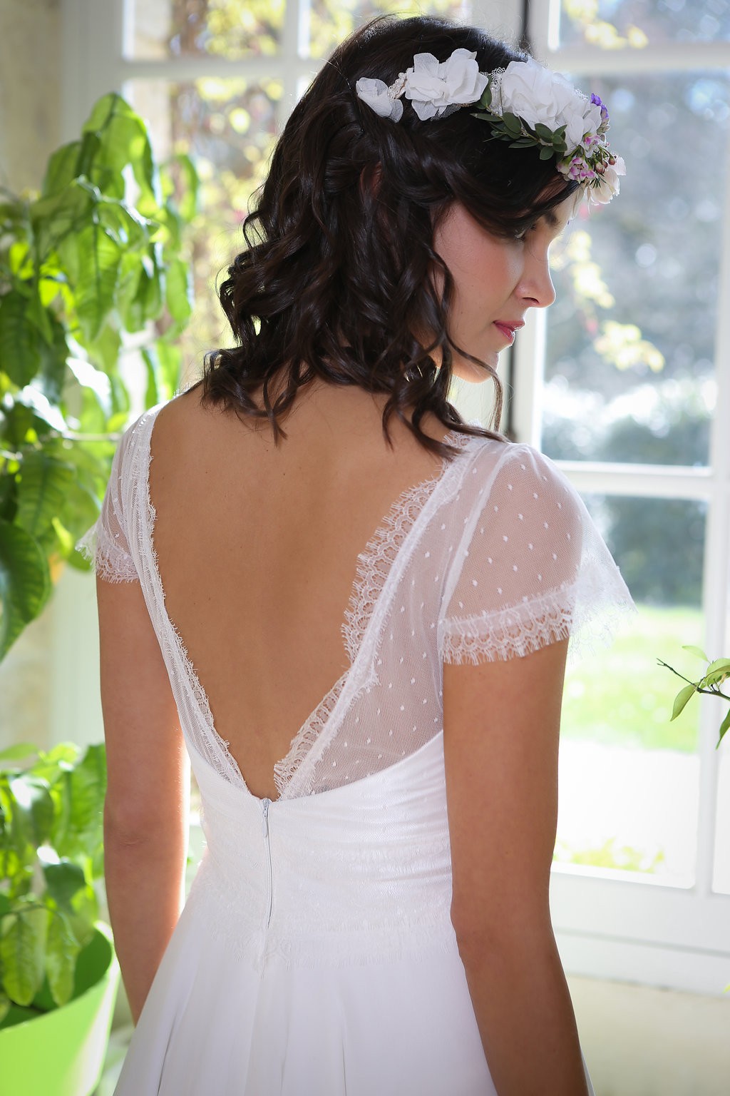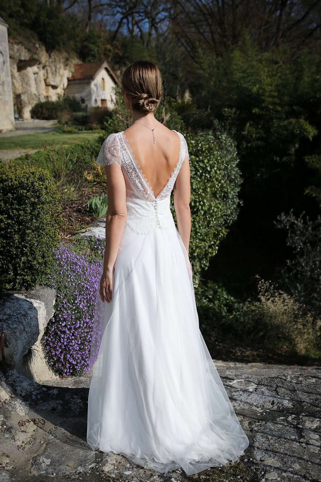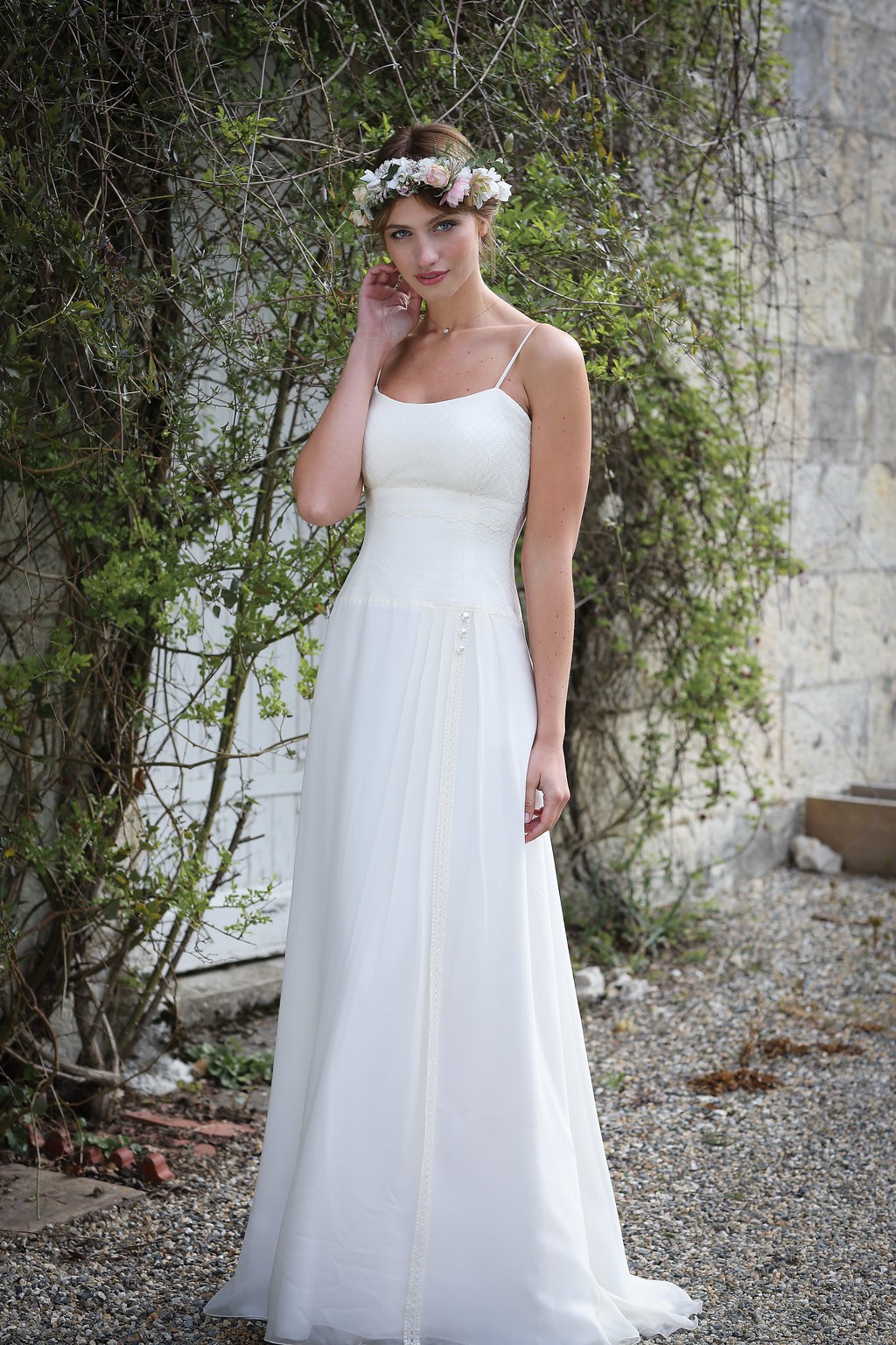 Cette année, la grande nouveauté est l’adaptabilité des robes ! Les créations se parent de manches amovibles pour les mariées d’hiver ou bien de tops, reportables après le mariage pour la vie quotidienne. Comme par exemple, le modèle Améthyste composée d’une robe près du corps un brin sexy qui se transforme en une création bohème avec son top transparent et ample.