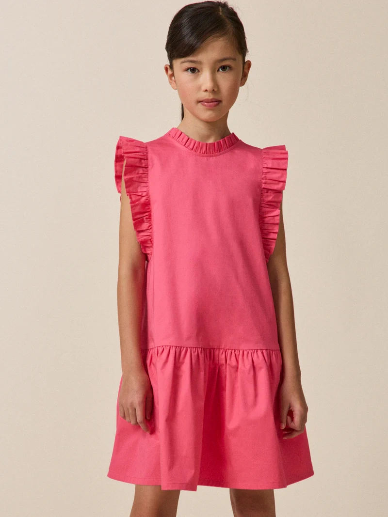 Robe confectionnée en satin de coton. L’encolure et les emmanchures s’ornent de plis minutieusement travaillés, apportant relief et finesse au modèle.