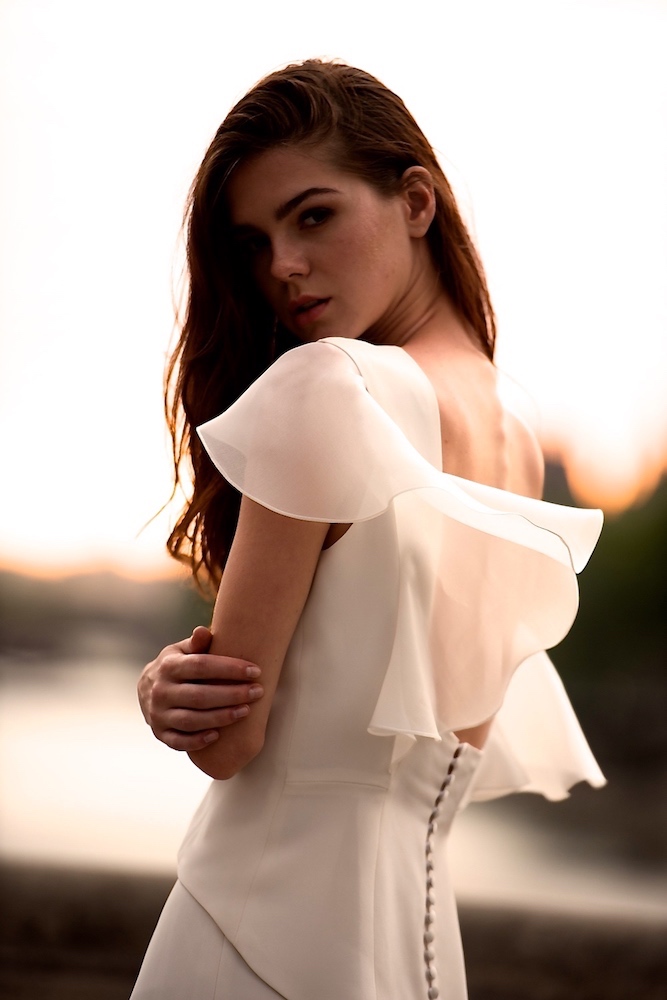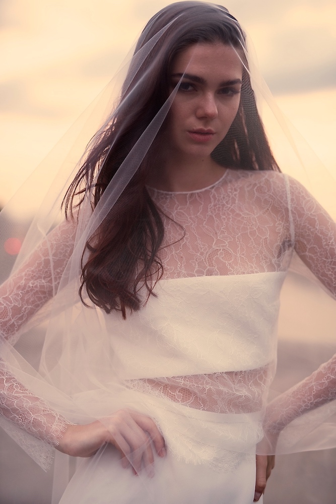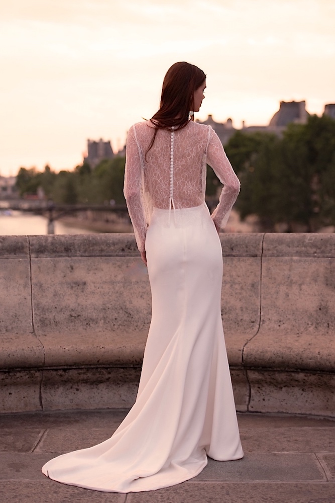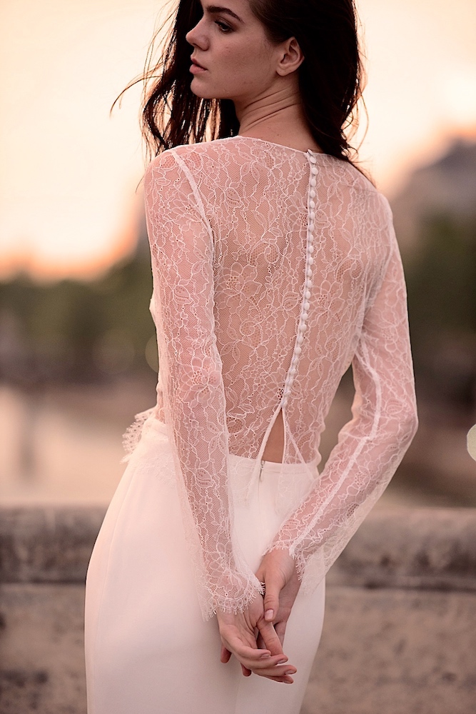 Résolument contemporain, le style de Sabrina Makar permet de jouer sur les matières et les formes. Ainsi, la dentelle de Chantilly prend des allures géométriques, l’organza sublime les épaules avec des manches transparentes et voluptueuses, la guipure joue sur la transparence pour un rendu romantique.