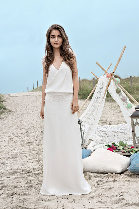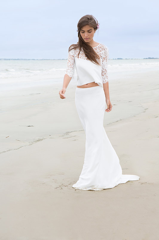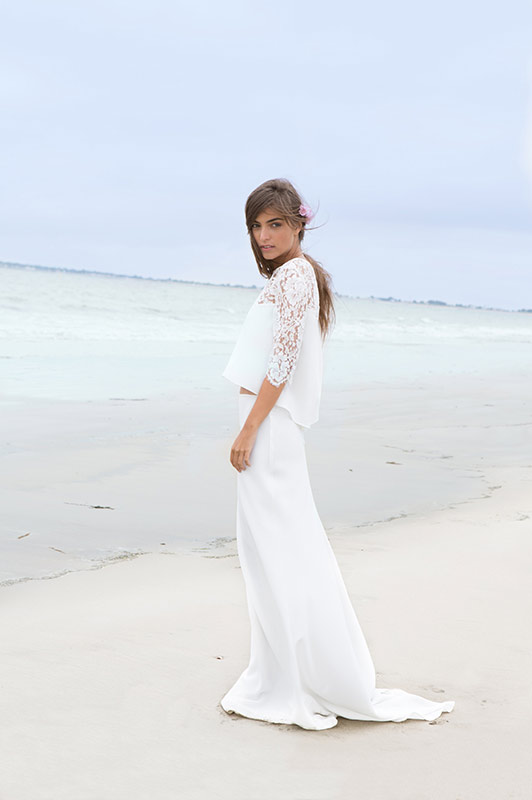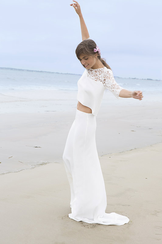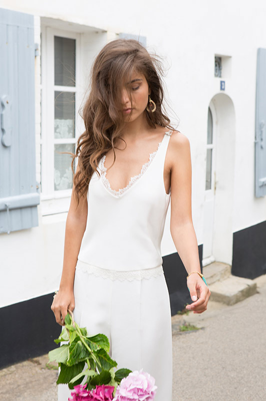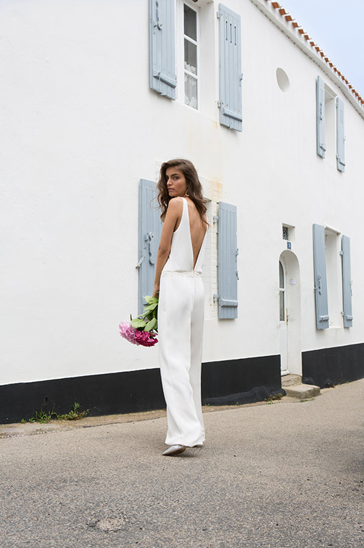 Dans un tout autre registre, la combinaison Tim est très glamour. J’adore la coupe évasée des jambes, de plus en plus oubliée au profit des pantalons ¾. L’association avec des escarpins pointus, le dos nu et le décolleté en dentelle sont d’un chic que je serai capable de la porter au travail. Une alternative très élégante à la robe courte de la cérémonie civile, en somme.