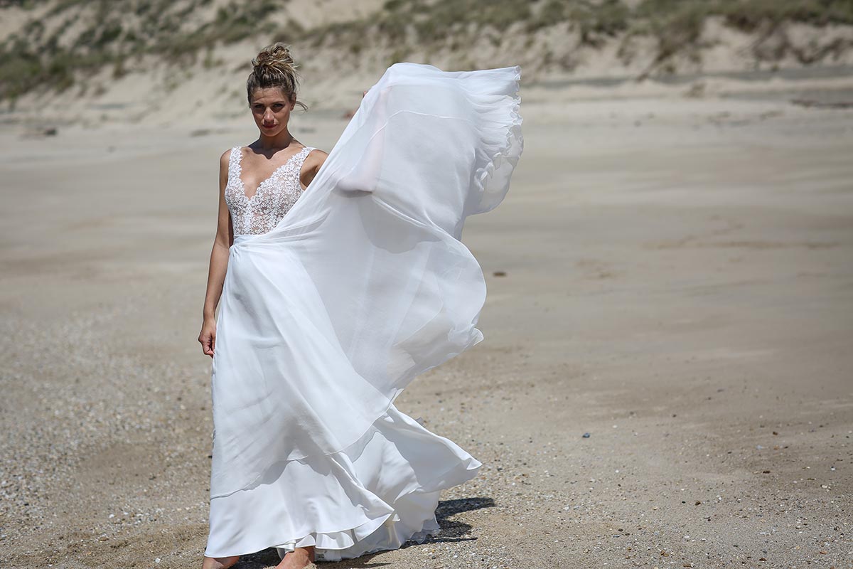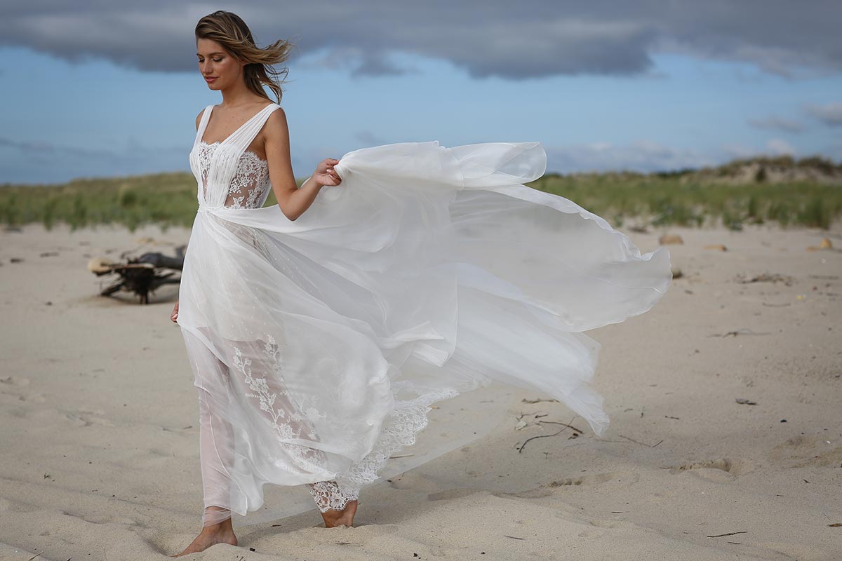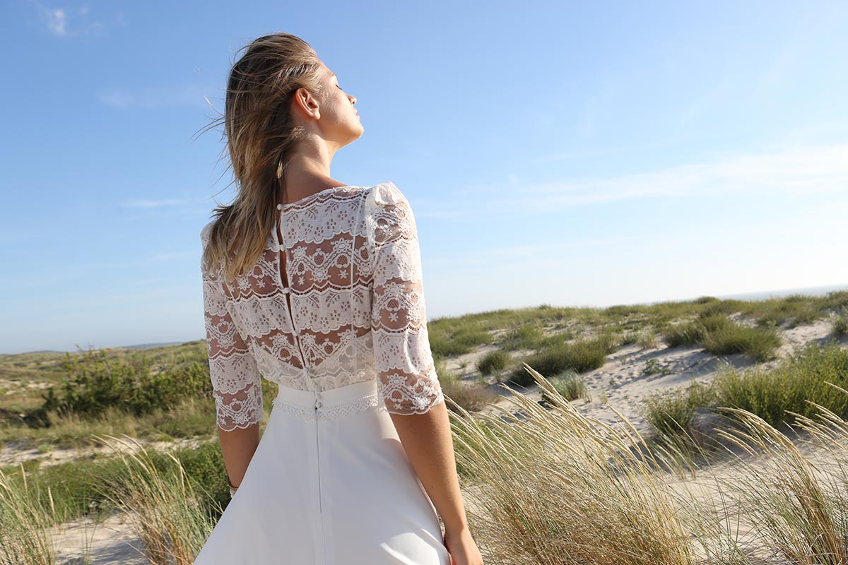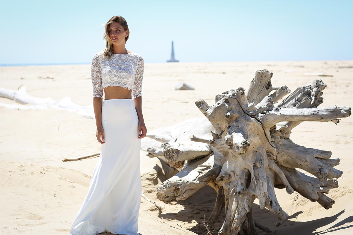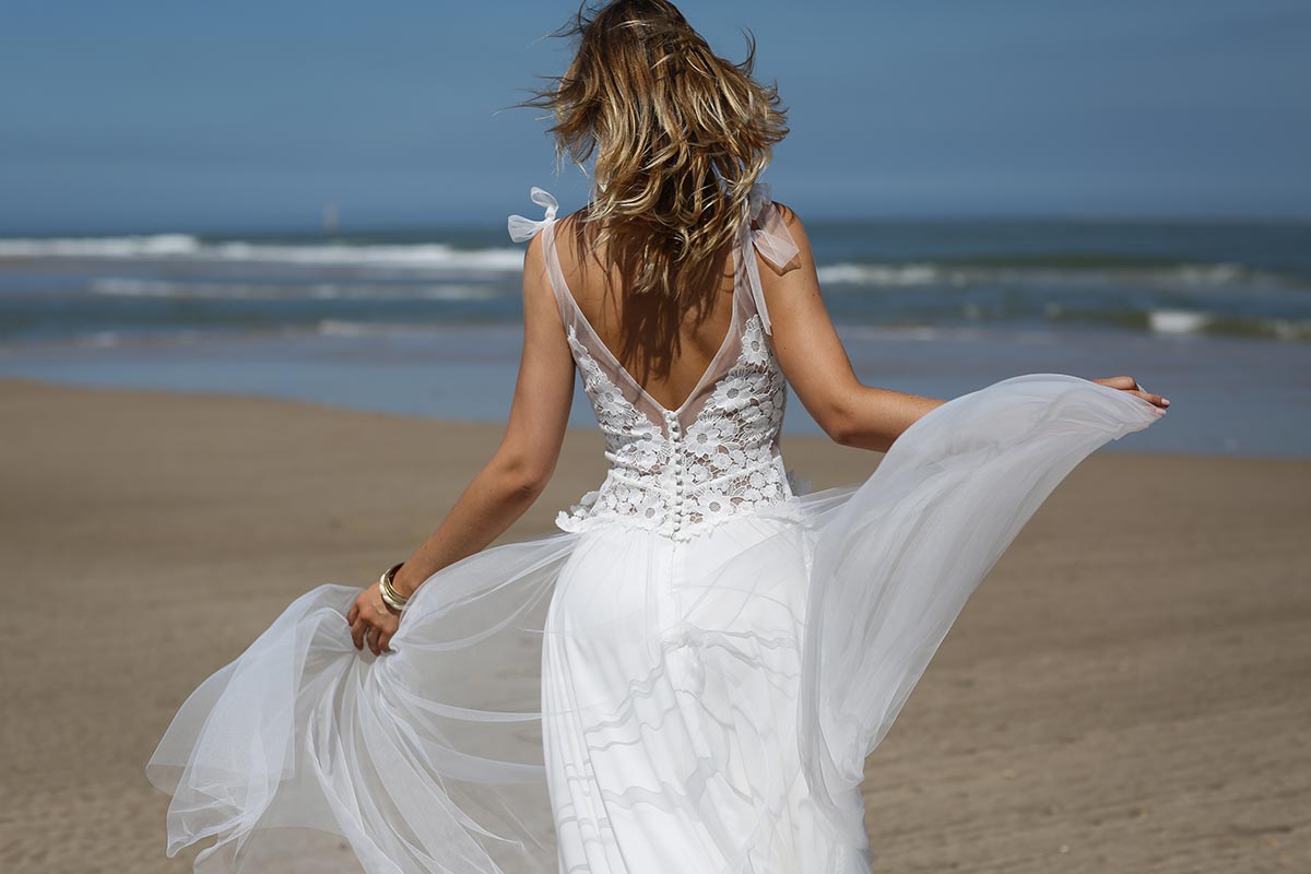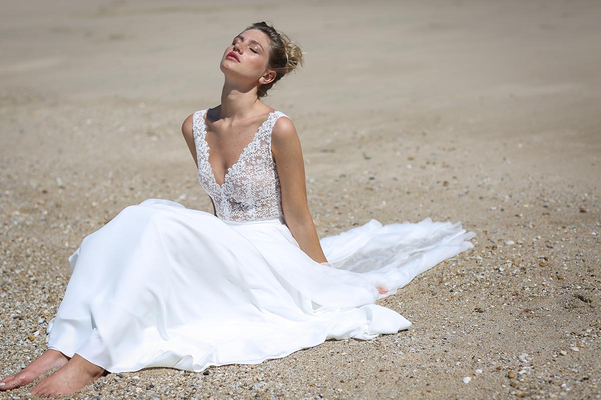 Jeu de transparence, dentelle fleurie, dos nu… La légèreté est au cœur de cette nouvelle collection de robes de mariée. Ici, on adore la superposition des matières et le style contemporain des dentelles. Les graphismes délicats se révèlent sur la peau basanée de nos mariées. Les coupes modernes s’envolent au vent… Entre l’asymétrie de la robe Californie en passant par l’association top-jupe de Colombus Phoenix, on adore les créations de Marie Laporte, entre féminité et impertinence…