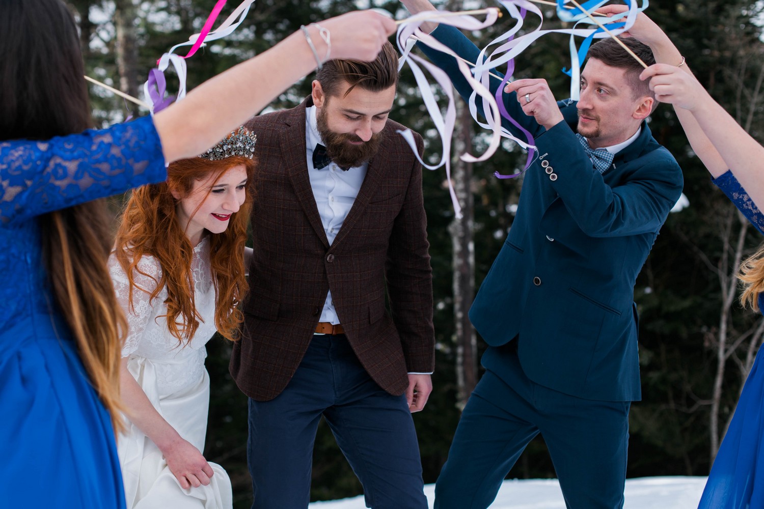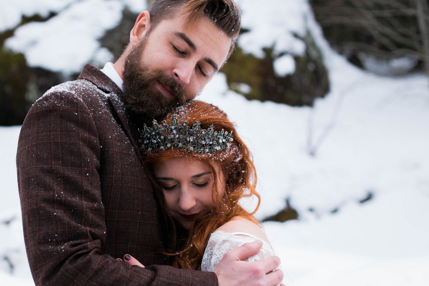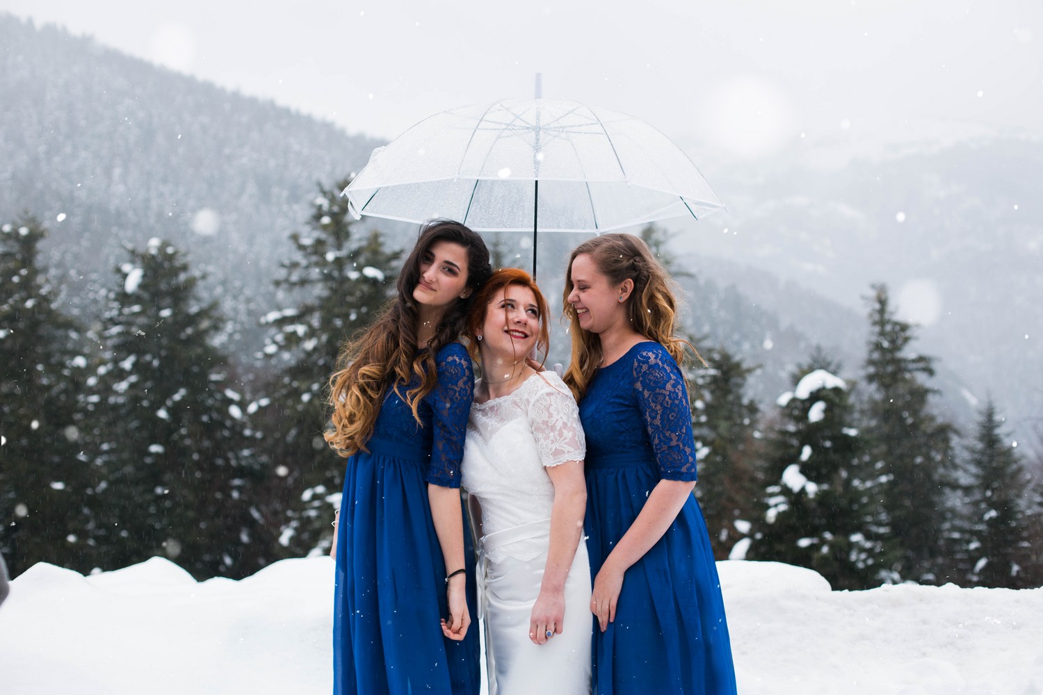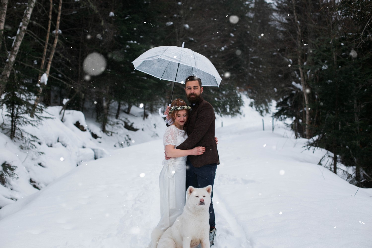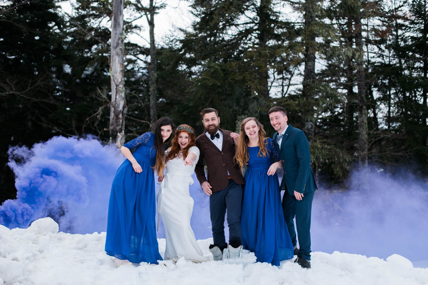 Là où les paysages enneigés offrent des panoramas exquis pour vos photos de mariage, vous pouvez les sublimer avec des fumigènes de couleurs, apportant un très beau contraste avec le blanc environnant.