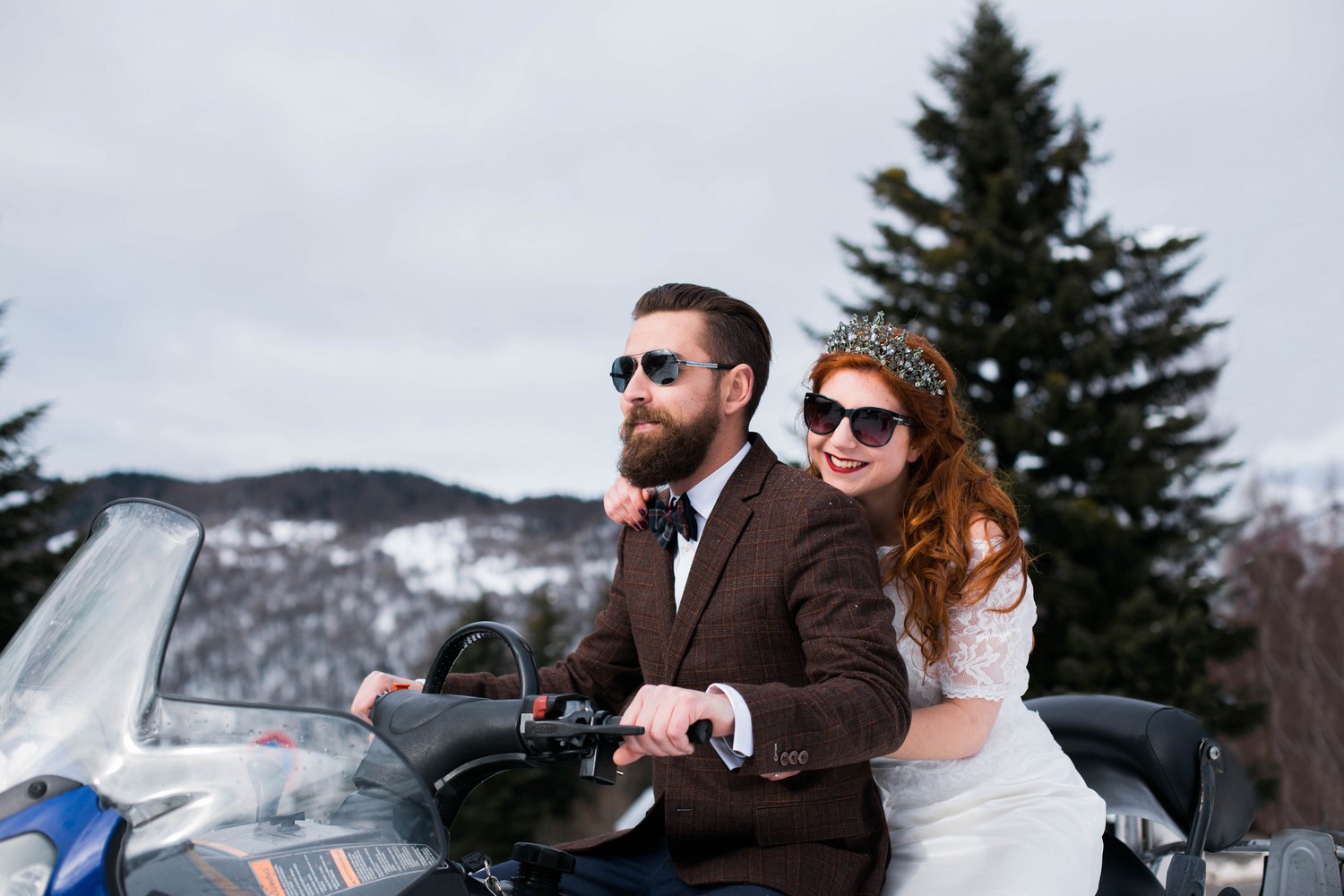 Passionnés de ski ou de monts enneigés, réaliser un mariage sur le thème de la montagne est une très belle idée ! Je vous en avais déjà parlé il y a quelques temps en vous partageant le mariage de Ludivine et Frédéric, deux amoureux de Chambéry qui s’étaient dit « oui » un 31 décembre sous la neige ! Ici, les escarpins laissent place aux moon boots, le domaine est remplacé par un gîte au milieu d’une station de ski et le cabriolet est transformé en moto neige ! Une façon très originale de démarrer les festivités et de briser « la glace » avec vos invités.