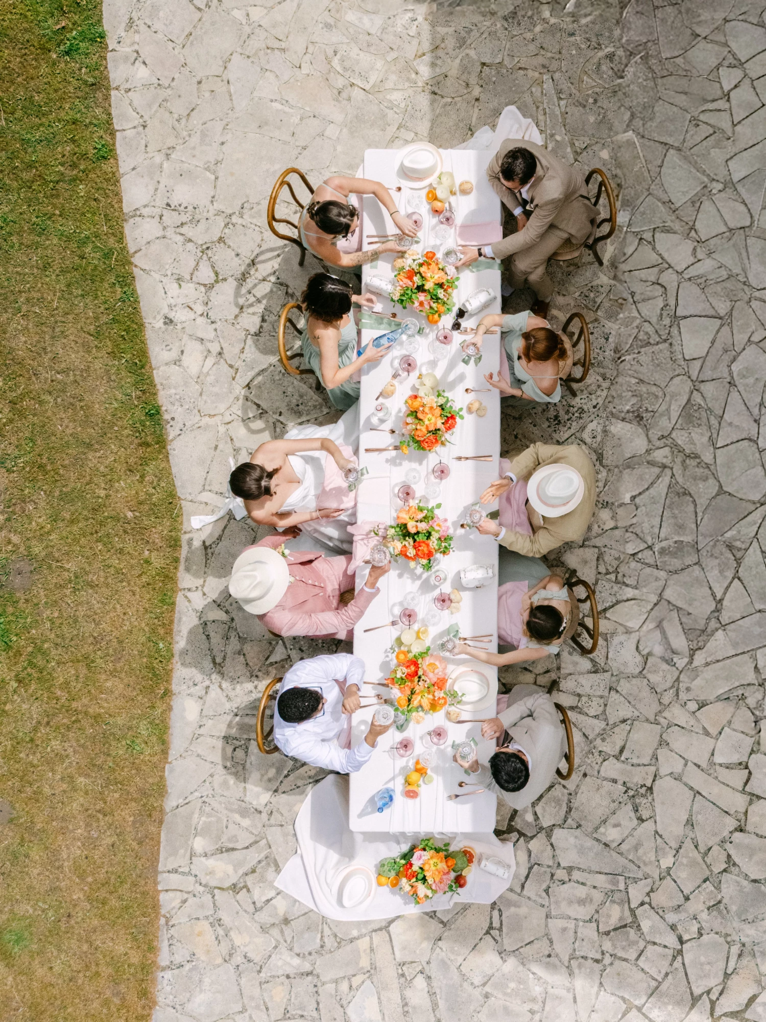 Pour incarner cette douceur de vivre propre au Sud, l’équipe a imaginé le mariage comme une succession de moments conviviaux, à l’image de ceux que l’on chérit le plus. Un cocktail se savoure au bord de la piscine, bercé par les rires et la lumière dorée. Le vin d’honneur s’étire face aux vignes du domaine viticole, offrant une vue prodigieuse qui invite naturellement à la contemplation. La cérémonie prend place sur le perron du mas provençal, au Château de l’Olivète, où les vieilles pierres deviennent les témoins silencieux des vœux échangés.