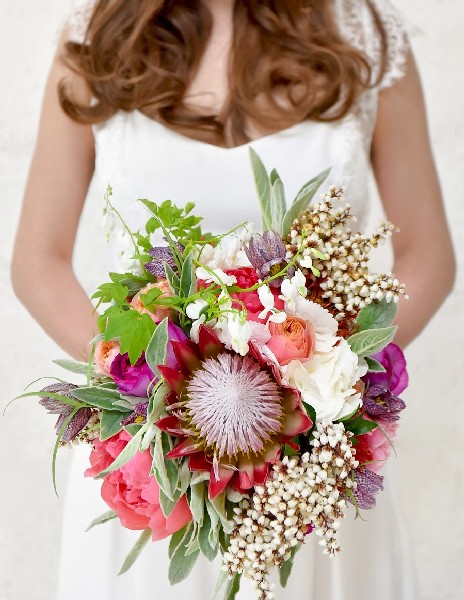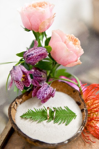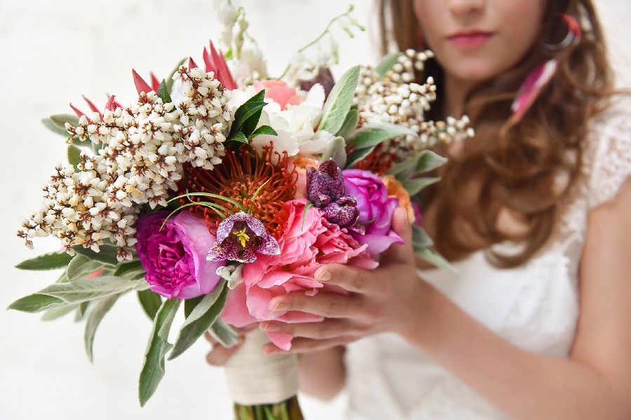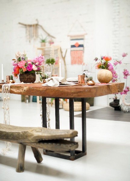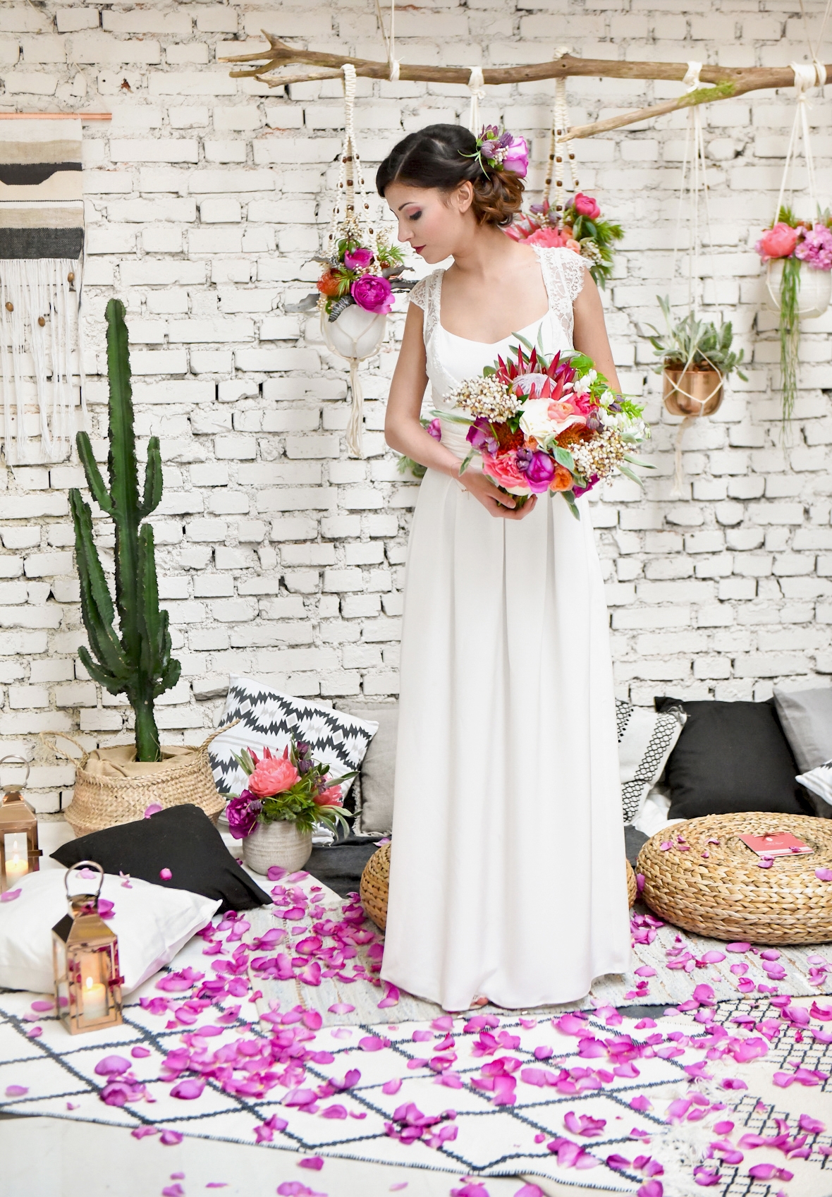 Les amoureux des mariages bohèmes pourront trouver dans ce shooting l’inspiration nécessaire pour parfaire leur décoration. Je pense notamment aux sublimes compositions florales d’AudeRose où les herbes tropicales côtoient les délicates pivoines et les exotiques protea king.