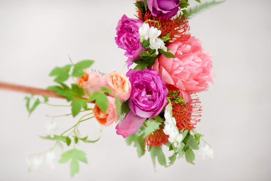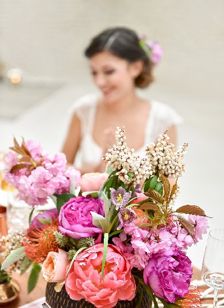 Les murs blancs laissent place à la beauté des compositions florales qui brillent de mille feux (ce rose flamboyant, j’adore !). Ce chatoiement de couleurs sublime la scène avec des couleurs vives mais douces à la fois.