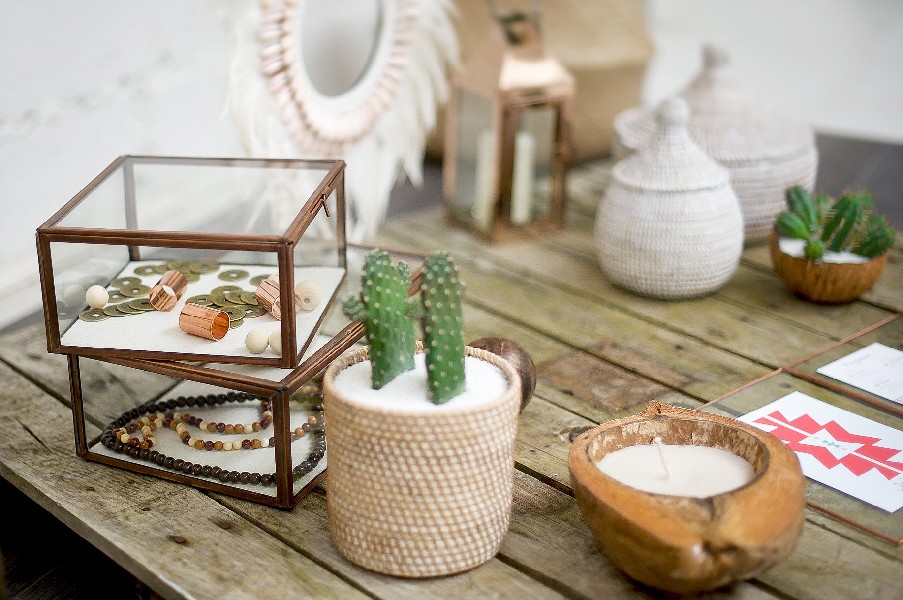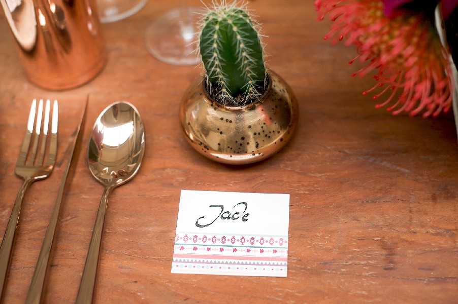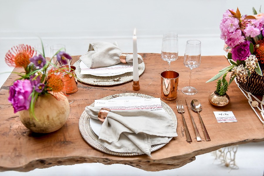 Véritable invitation au voyage, on retrouve dans la décoration du mariage des inspirations venant du monde entier (les cactus mexicains, les masques africains, les statues indonésiennes, les tapis orientaux…) ainsi qu’un savant mélange de matières avec des accessoires en bois, en coton, en cuivre ou en plumes.
