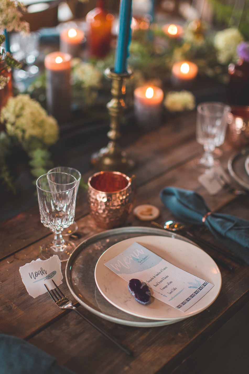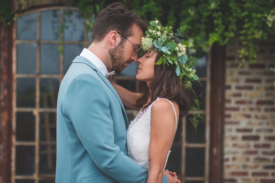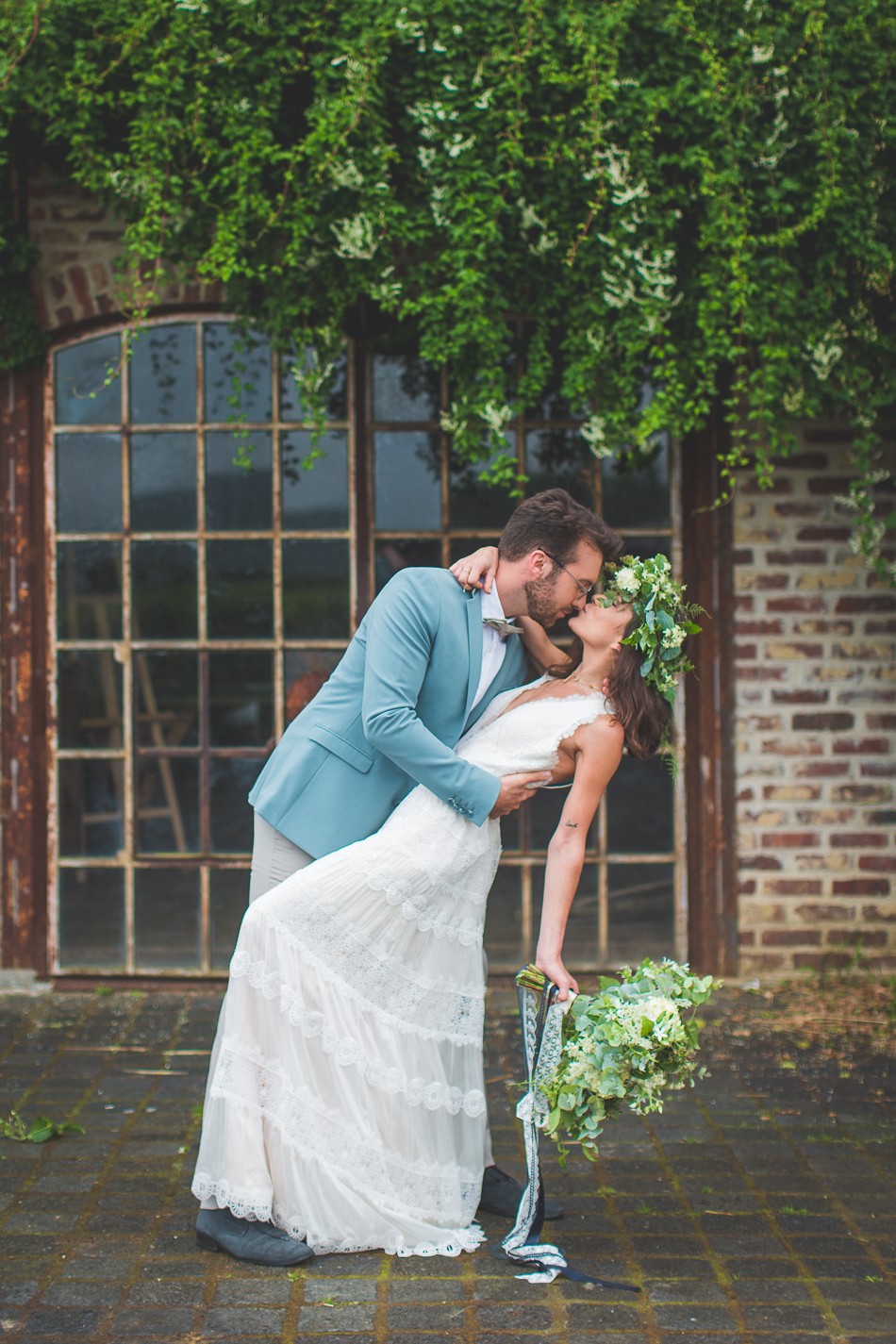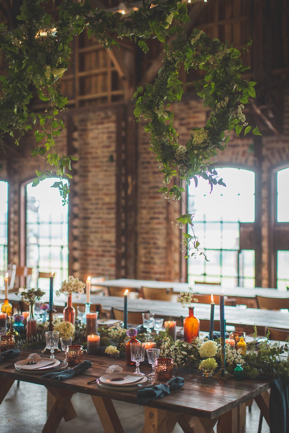 Pour ce mariage industriel et végétal, l’équipe a décidé de miser sur un lieu dont je n’arrêterai pas de vous vendre les mérites : les Bonnes Joies en Ile-de-France (je vous en parlais déjà ici). Mêlant vieilles briques, immenses verrières et pièces de métal ancien, le lieu regorge de surprises et ce, aux portes de Paris. Le décor se suffit à lui-même pour ne pas trop en faire. Quelques bougeoirs et photophores en cuivre ornent la table de mariage pour faire un rapide rappel à l’univers qui nous entoure.