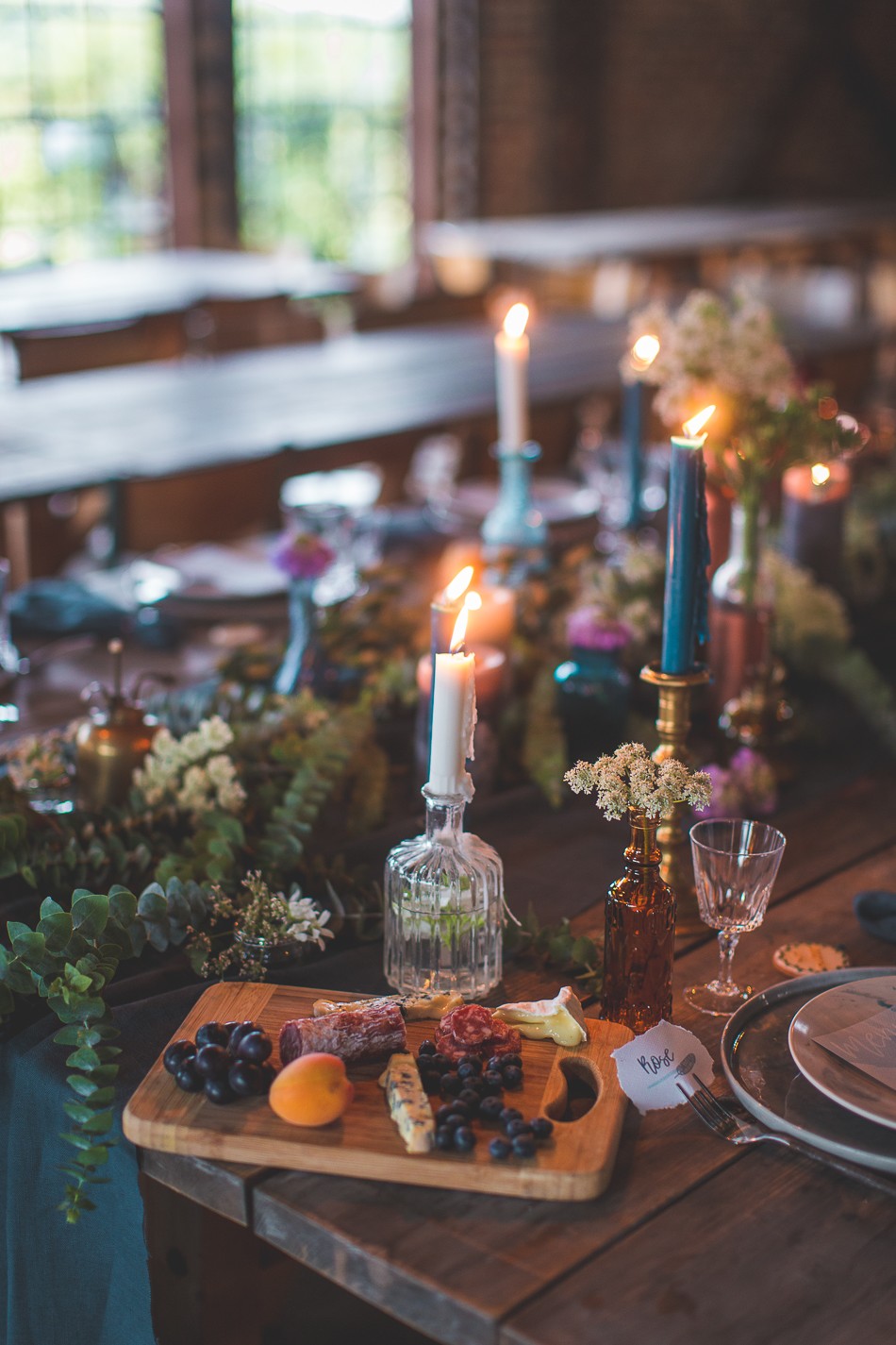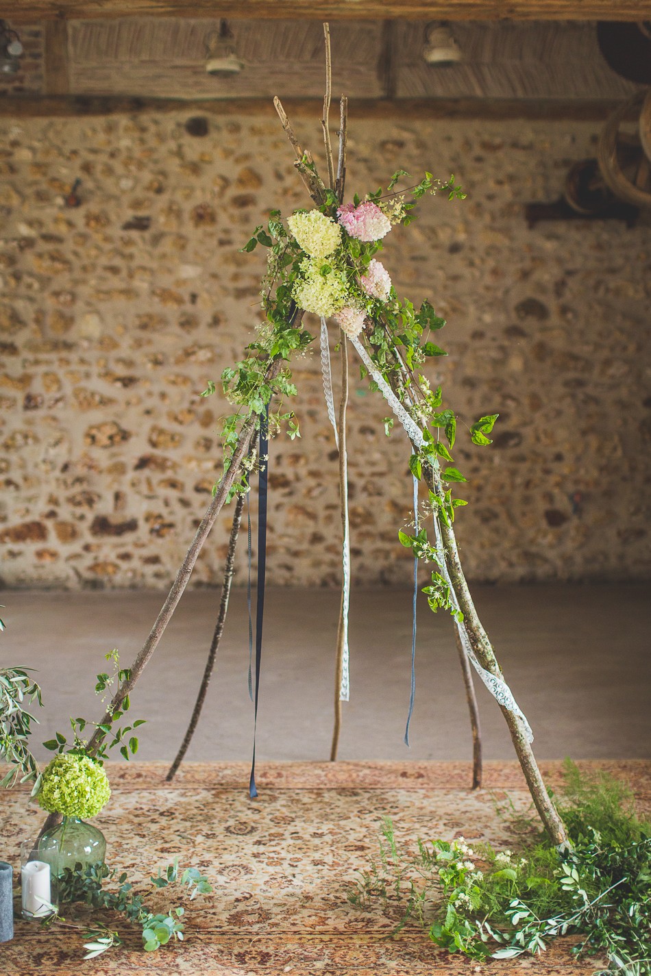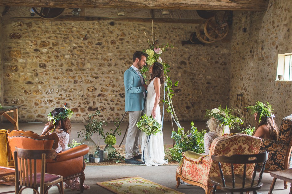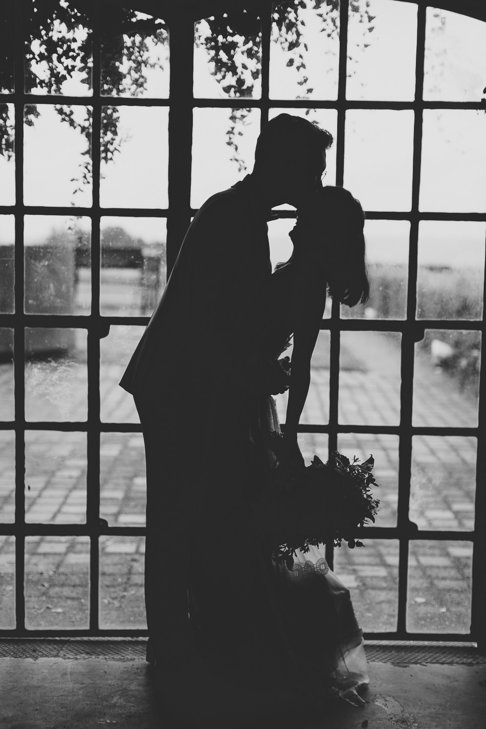 Pour ce mariage industriel et végétal, l’équipe a décidé de miser sur un lieu dont je n’arrêterai pas de vous vendre les mérites : les Bonnes Joies en Ile-de-France (je vous en parlais déjà ici). Mêlant vieilles briques, immenses verrières et pièces de métal ancien, le lieu regorge de surprises et ce, aux portes de Paris. Le décor se suffit à lui-même pour ne pas trop en faire. Quelques bougeoirs et photophores en cuivre ornent la table de mariage pour faire un rapide rappel à l’univers qui nous entoure.