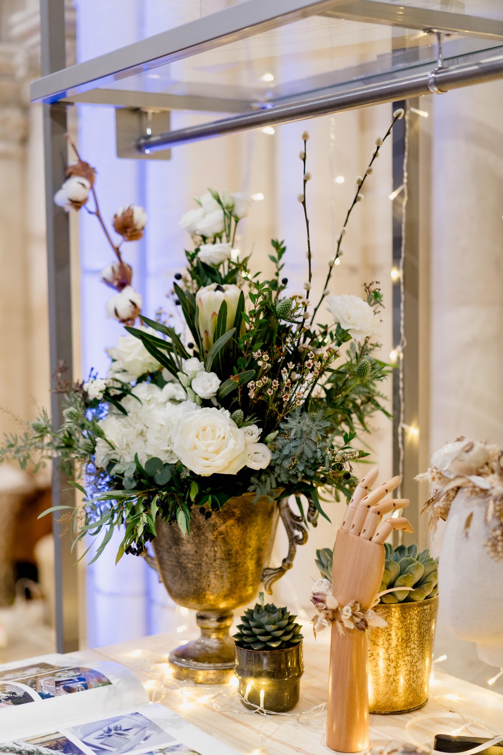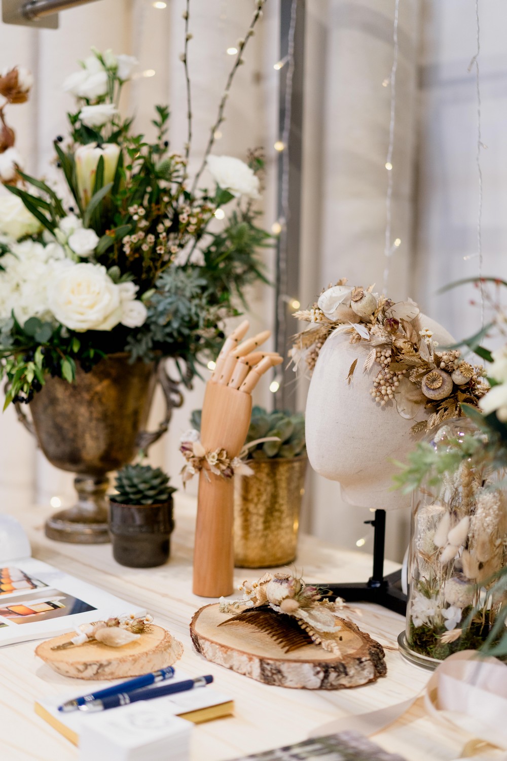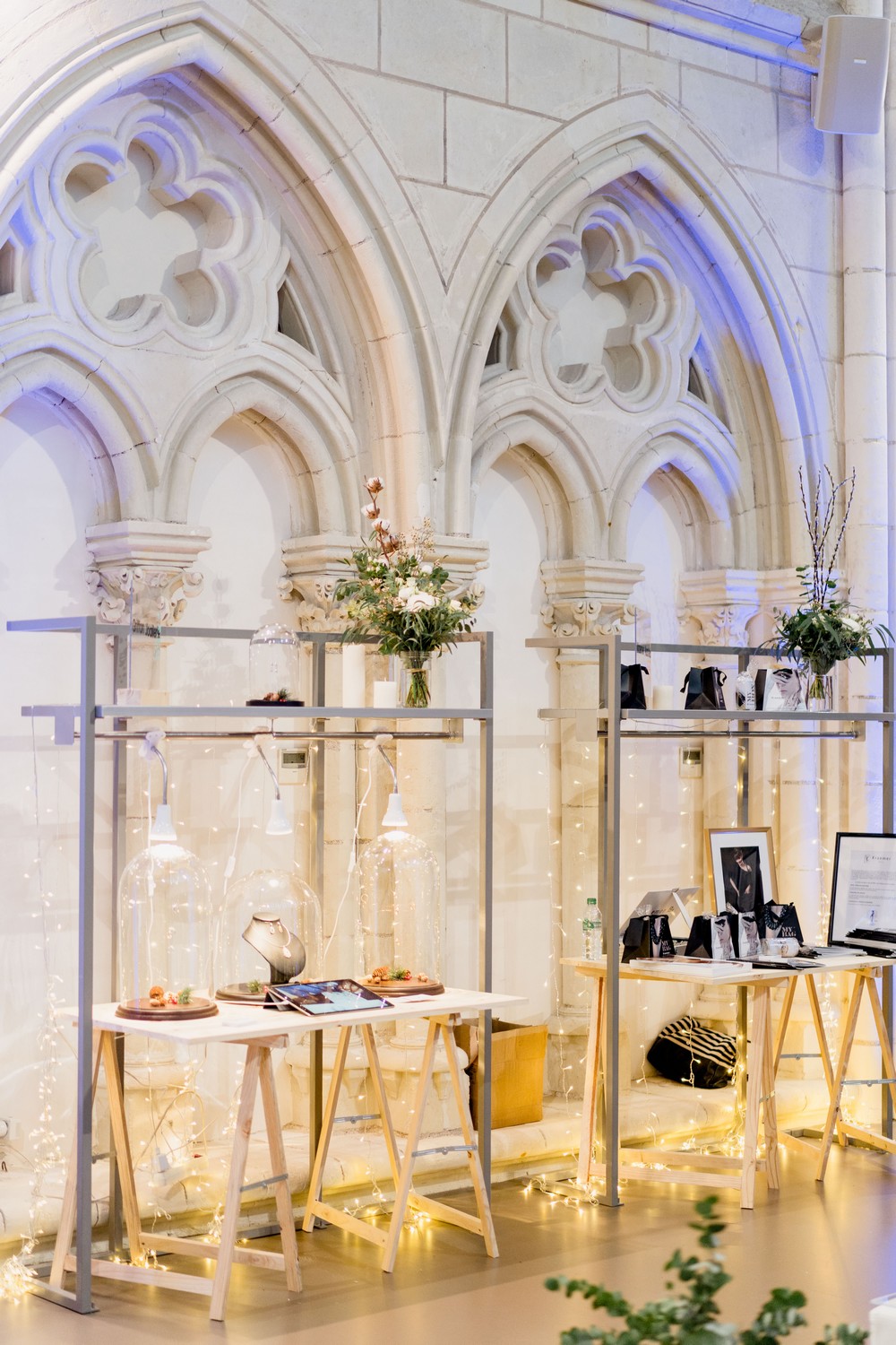 - Les stands subtilement décorés avec les créations florales de Briant Artisan Fleuriste (aviez-vous remarqué la réutilisation des portants, petite référence aux nombreux événements de mode accueillis par la chapelle ?)